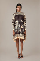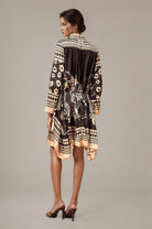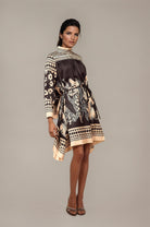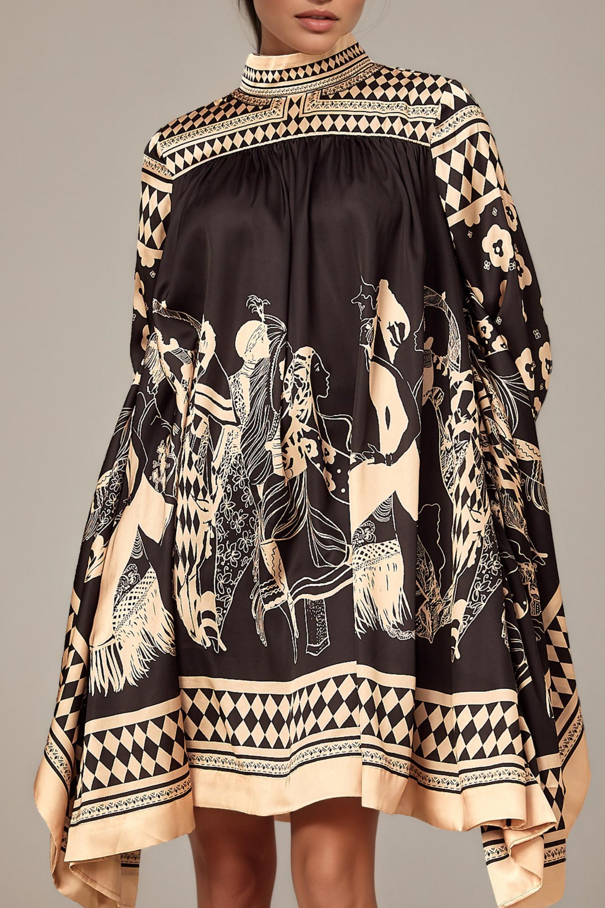 Introducing the Ingrid Mini Dress With Pattern Print, a must-have addition to your modern wardrobe. This dress features a striking black and gold pattern print with elegant pleat detailing. Designed with a mock neck, dramatic batwing sleeves, and an adjustable tied waist, its loose-fitting style offers a comfortable yet sophisticated silhouette. Complete with rear zip fastening and a straight hem, this thigh-length piece makes a bold statement.