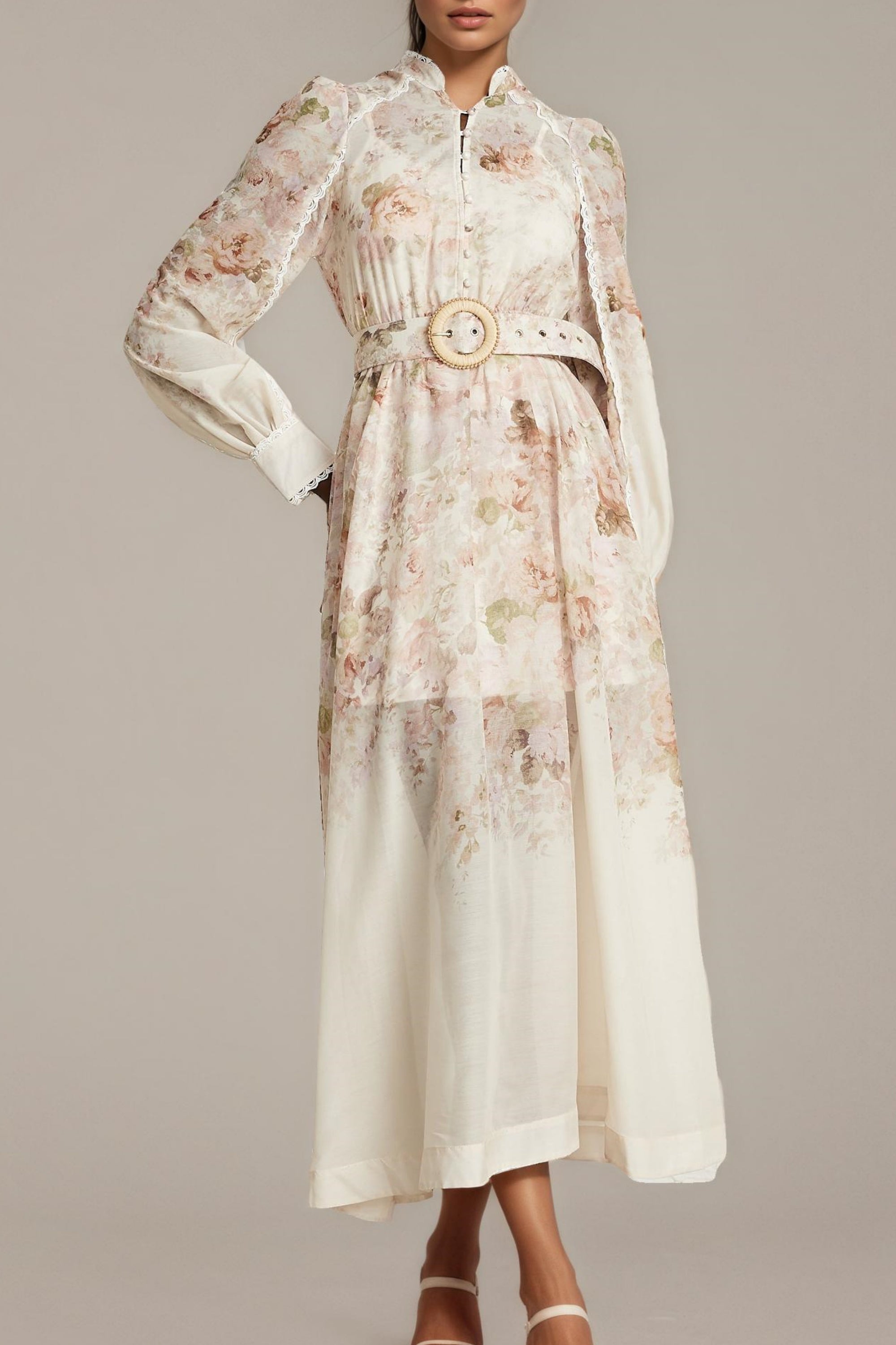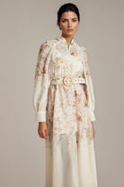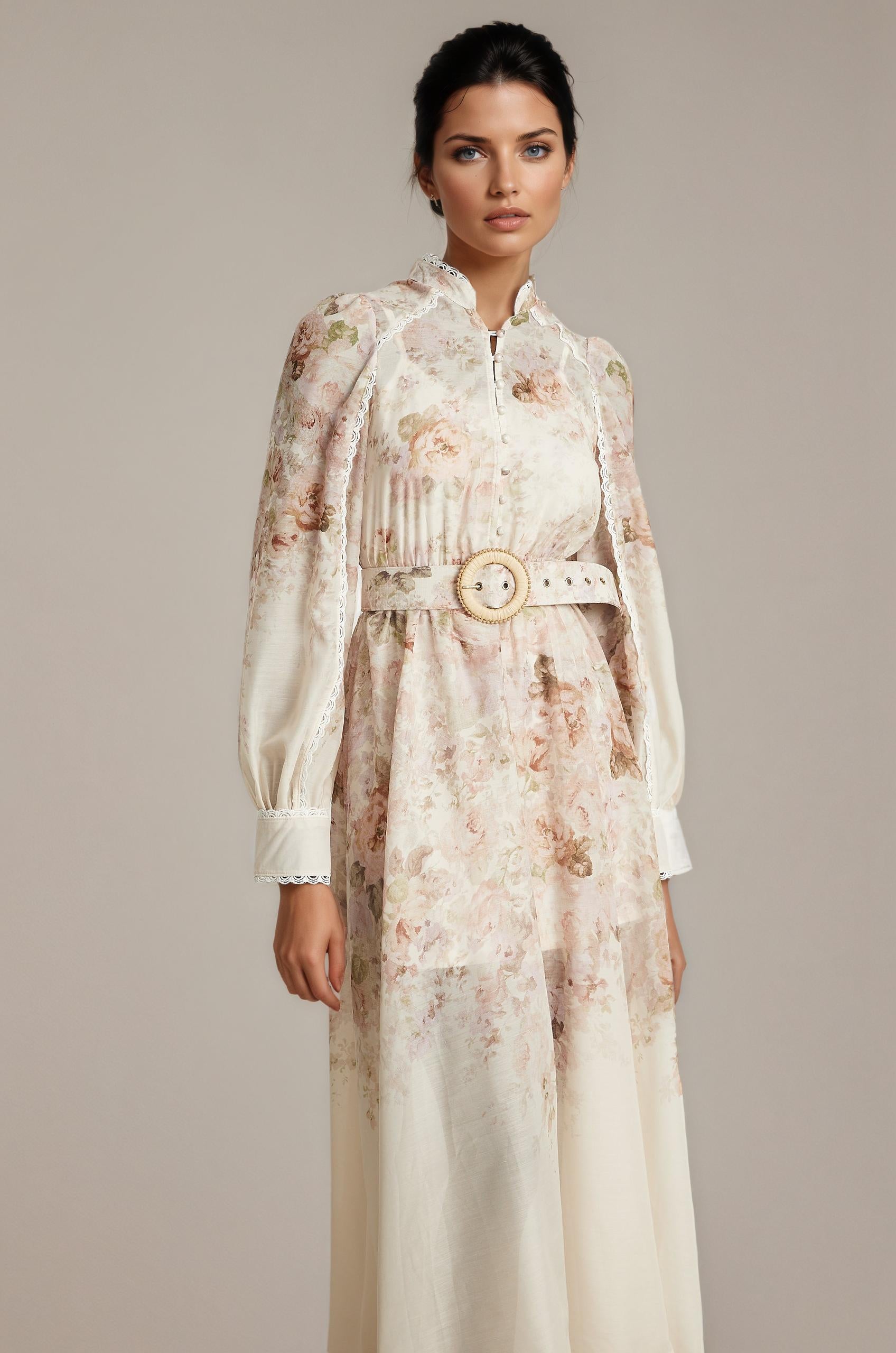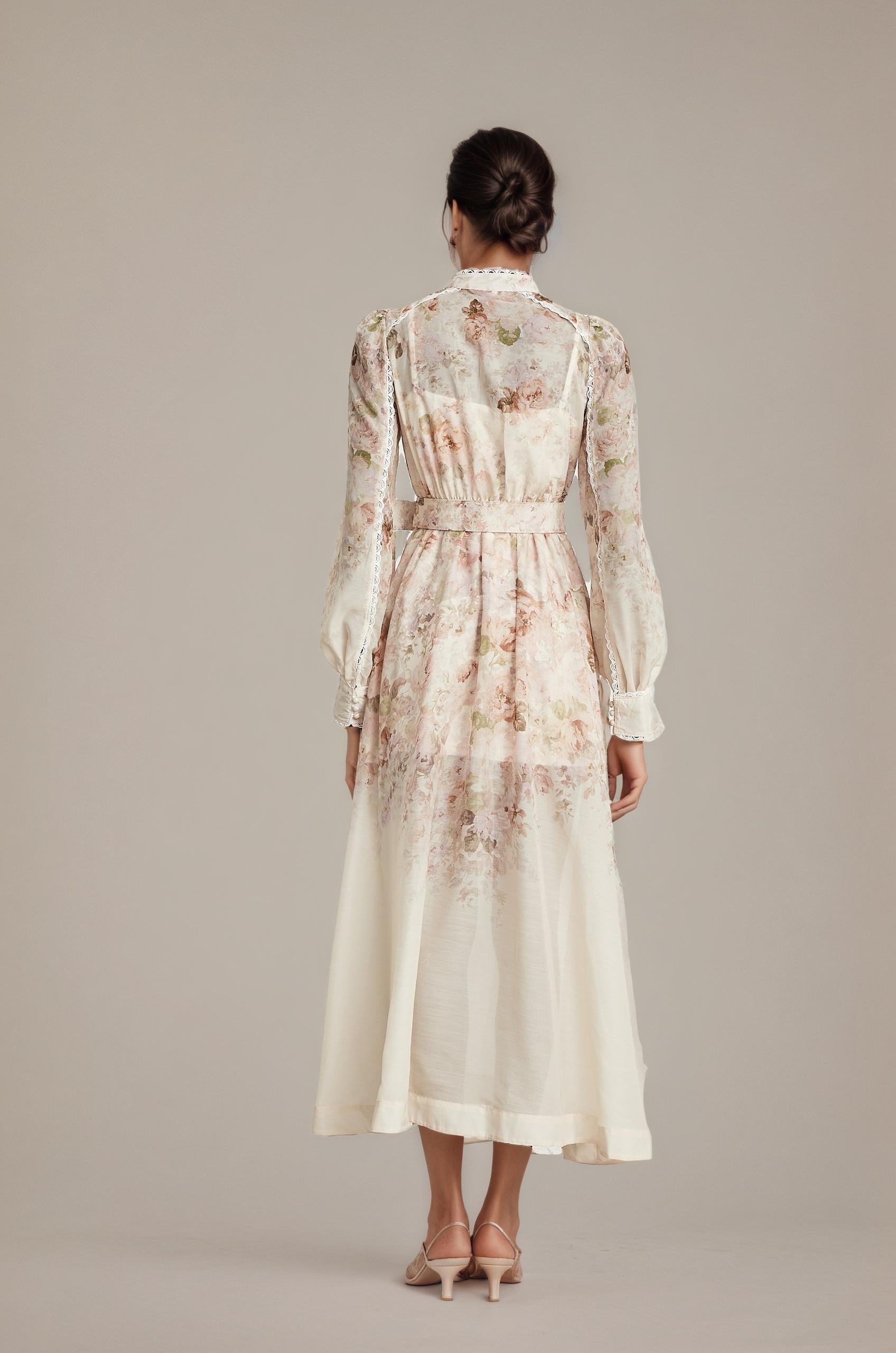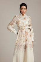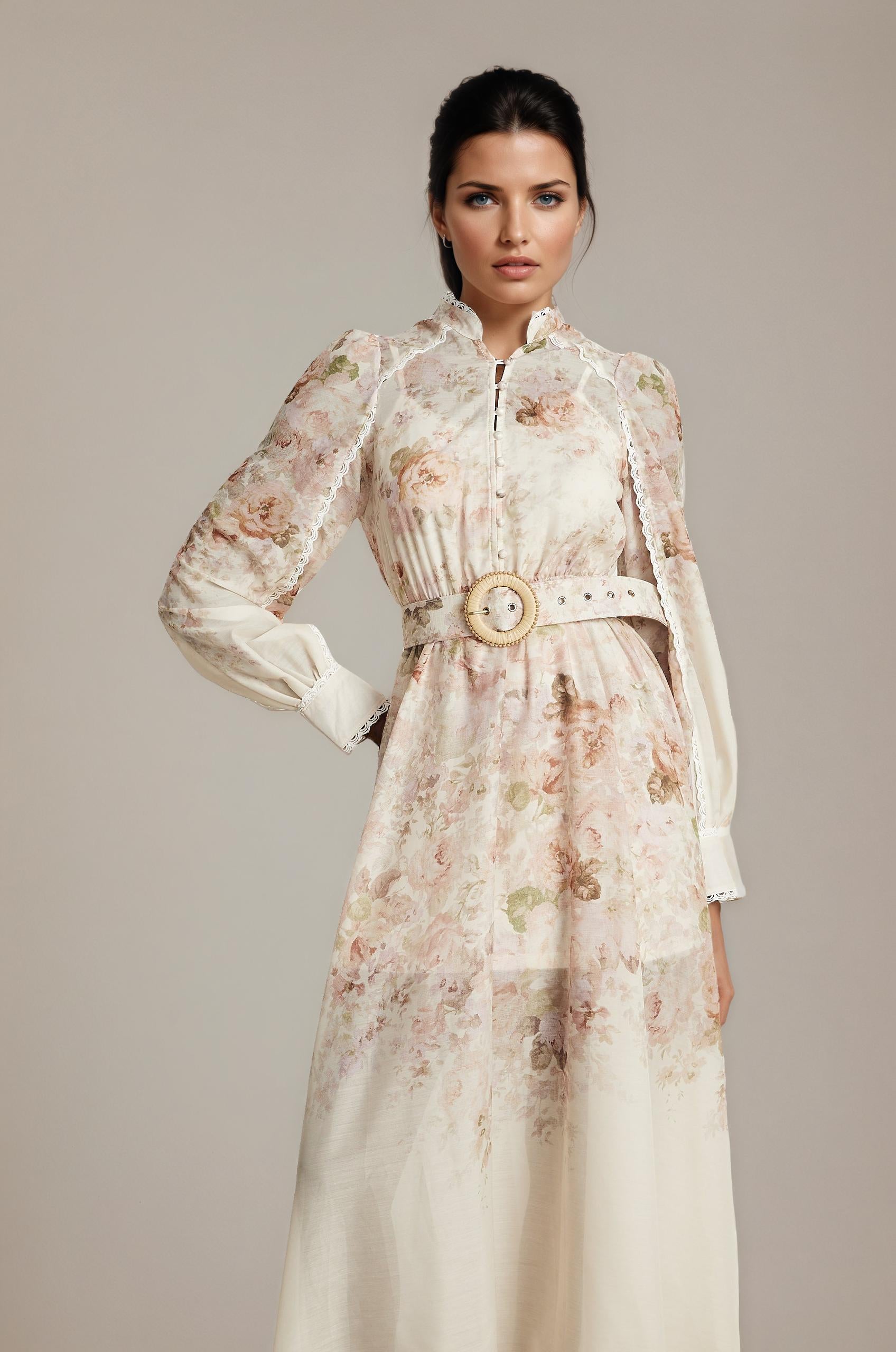 Introducing the Ariane Midi Dress With Floral Print And Belt, a must-have addition to your wardrobe. This dress features delicate floral print and elegant scallop trim. With its detachable waist belt and separate slip dress, it offers a perfect fit. Elevate your style with this elegant and versatile dress.