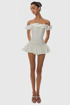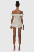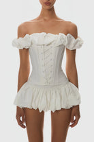 Introducing the Nadège White Corset & Skirt Set With Bubble Hem, a must-have addition to your elegant wardrobe. The white corset features a boat neck with off-shoulder puffed sleeves, delicate lace detailing, and structured fish bone construction with front tie accents. The white skirt showcases a playful bubble skirt design with sophisticated layered construction. This cropped top and thigh-length skirt ensemble combines rear zip fastening with a perfectly fitted silhouette.