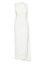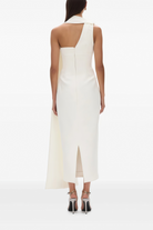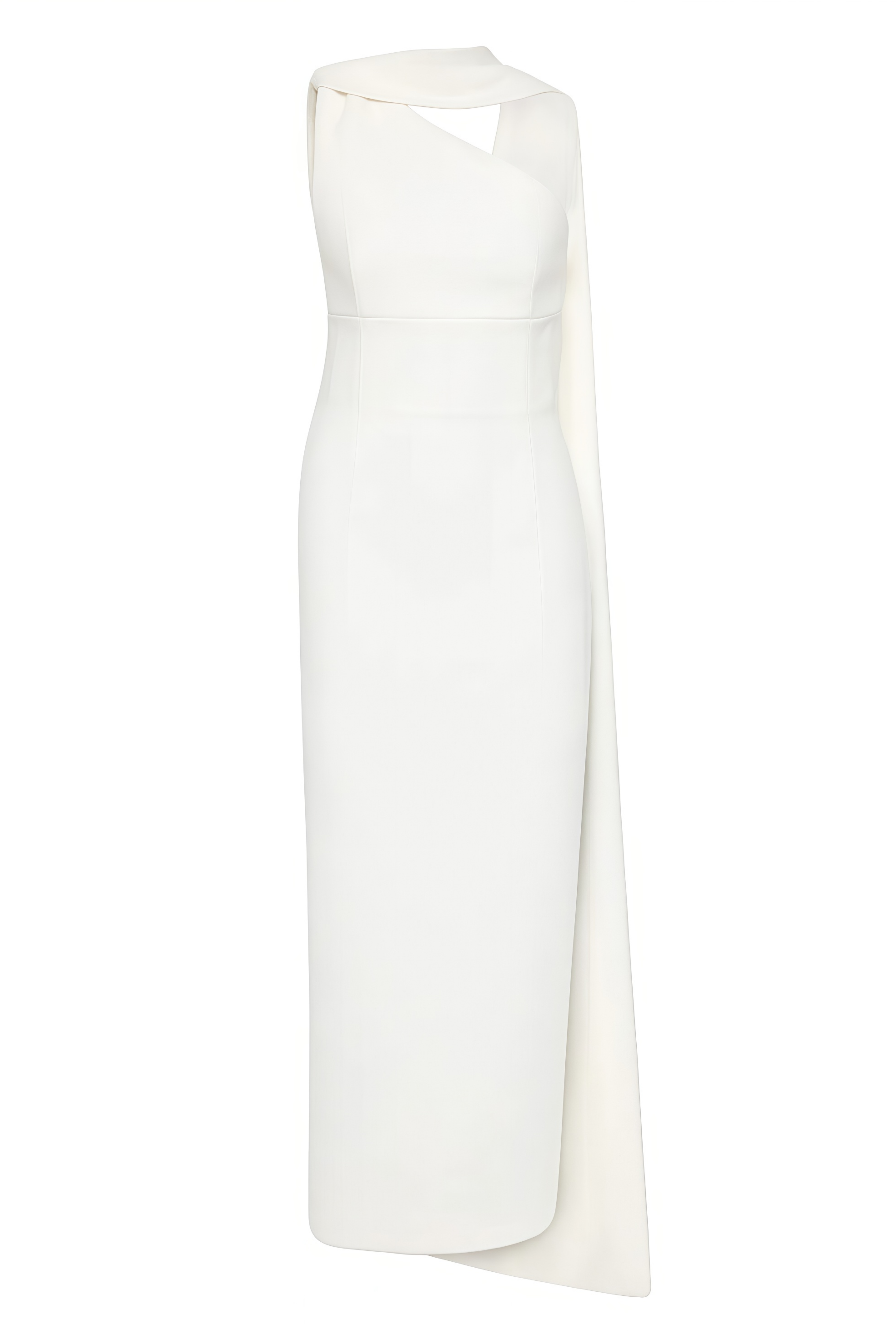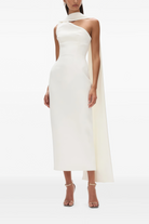 Introducing the Leticia White Scarf Neck Midi Dress, a must-have addition to your wardrobe. This sleeveless design showcases a sophisticated one-shoulder neckline with elegant scarf-neck detailing. The dress flows into a modern midi-length silhouette with a rear slit, secured with discreet rear zip fastening for seamless wear. Elevate your style with this elegant and versatile dress.