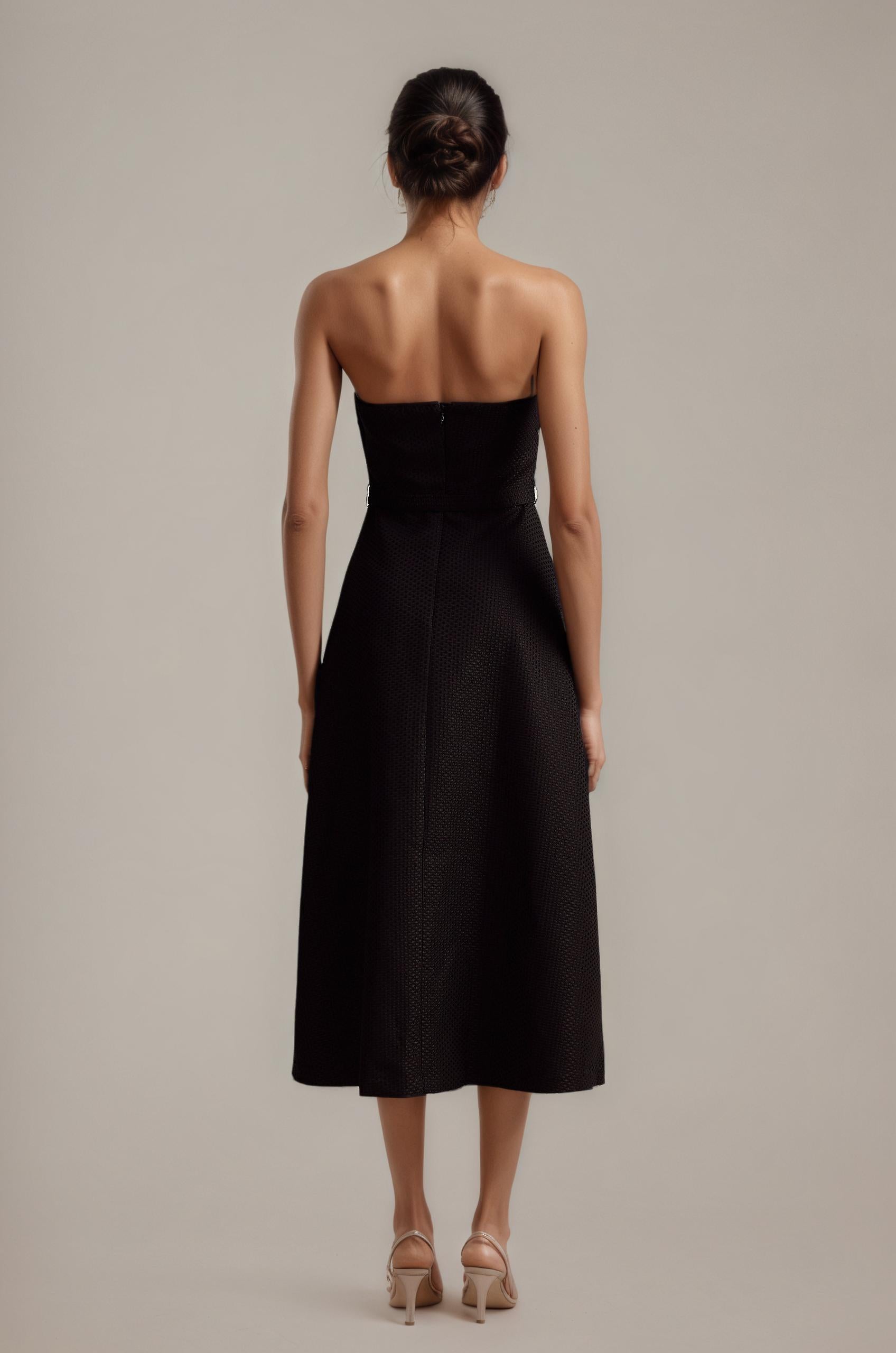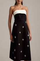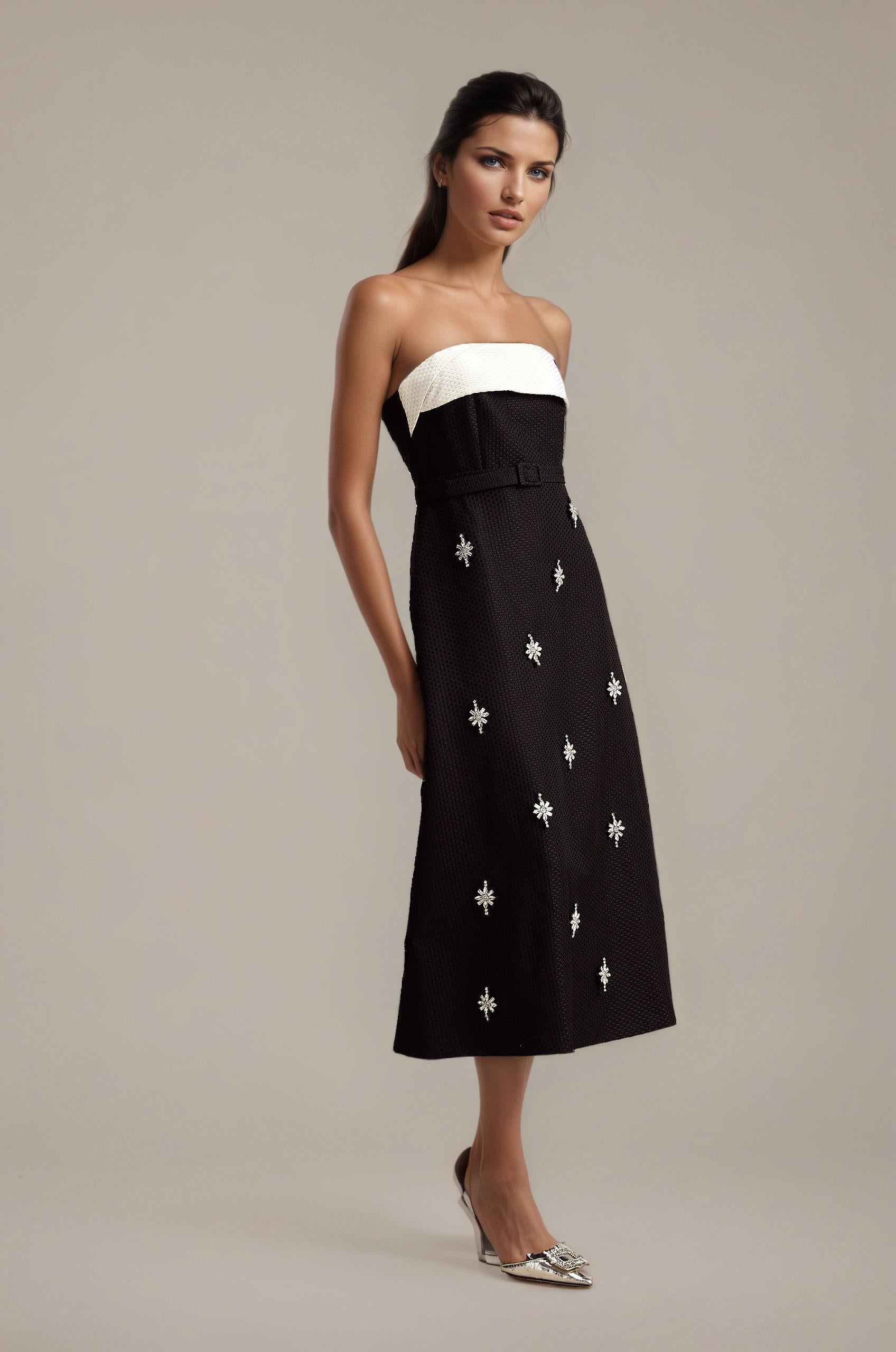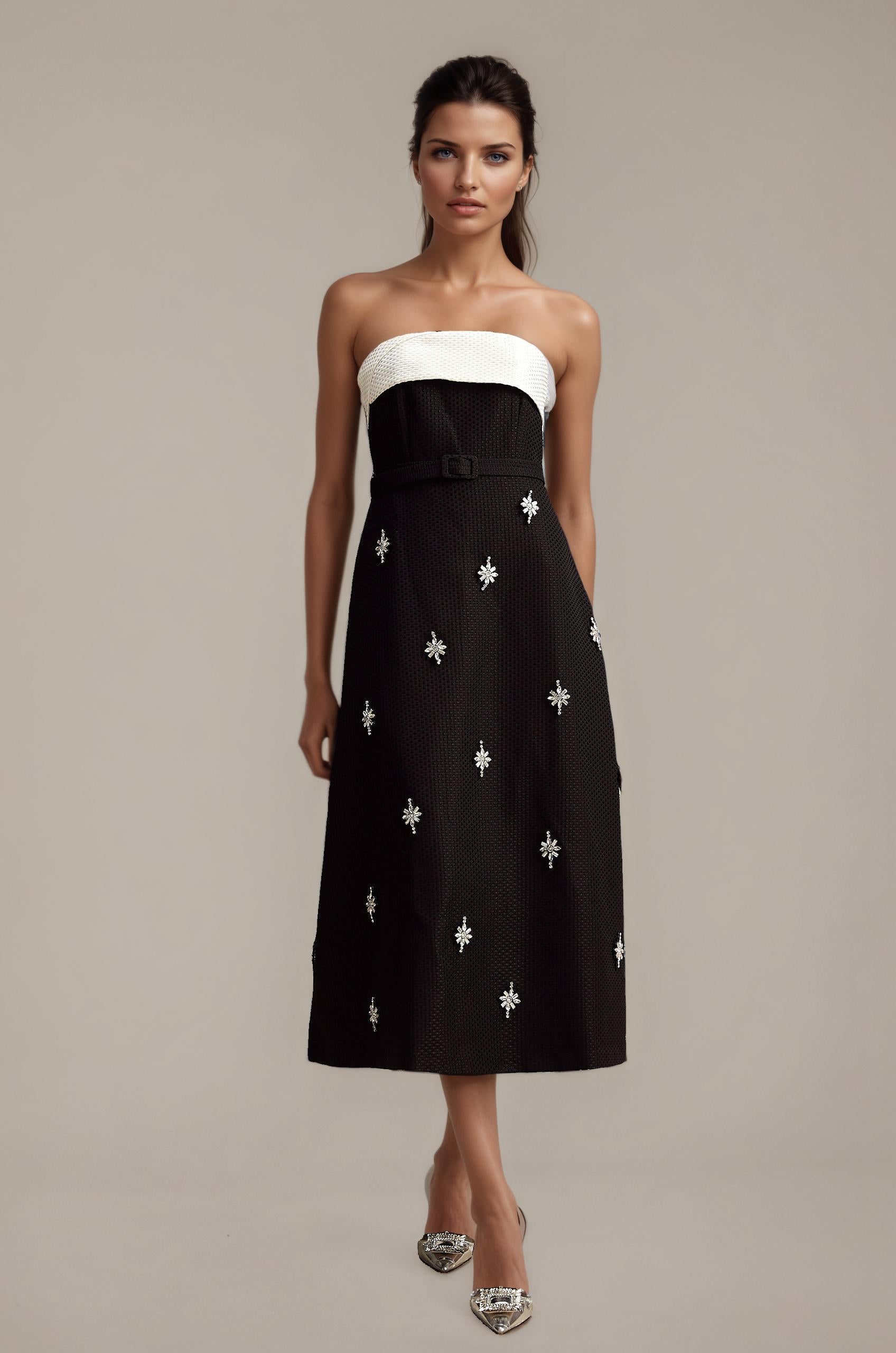 Introducing the Morgane Belted Midi Dress With Contrast Color, a must-have addition to your wardrobe. This dress features elegant crystal embellishment and striking contrast colors. With its off-the-shoulder design and belted waist, it offers a perfect fit. Elevate your style with this elegant and versatile dress.