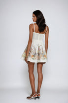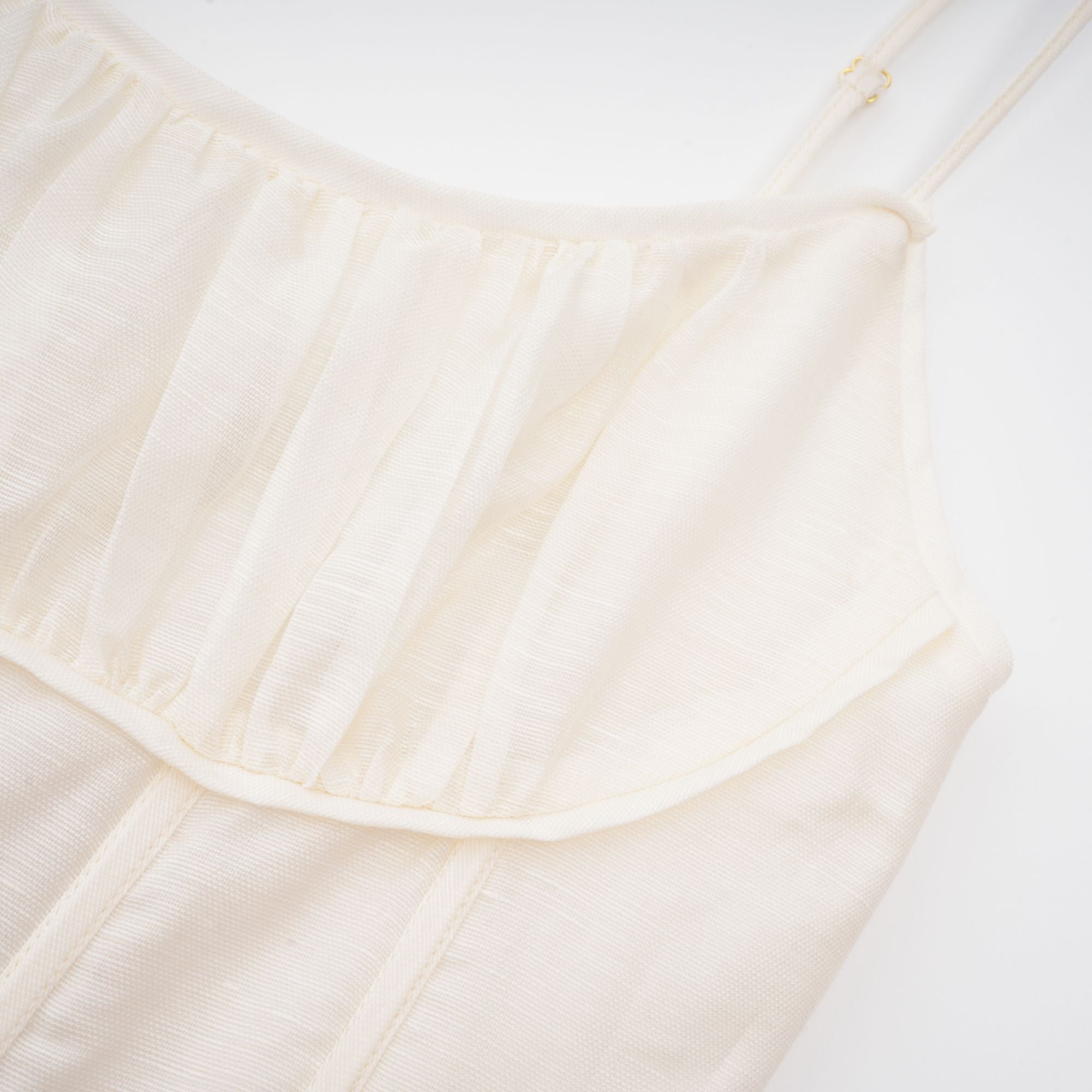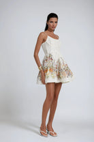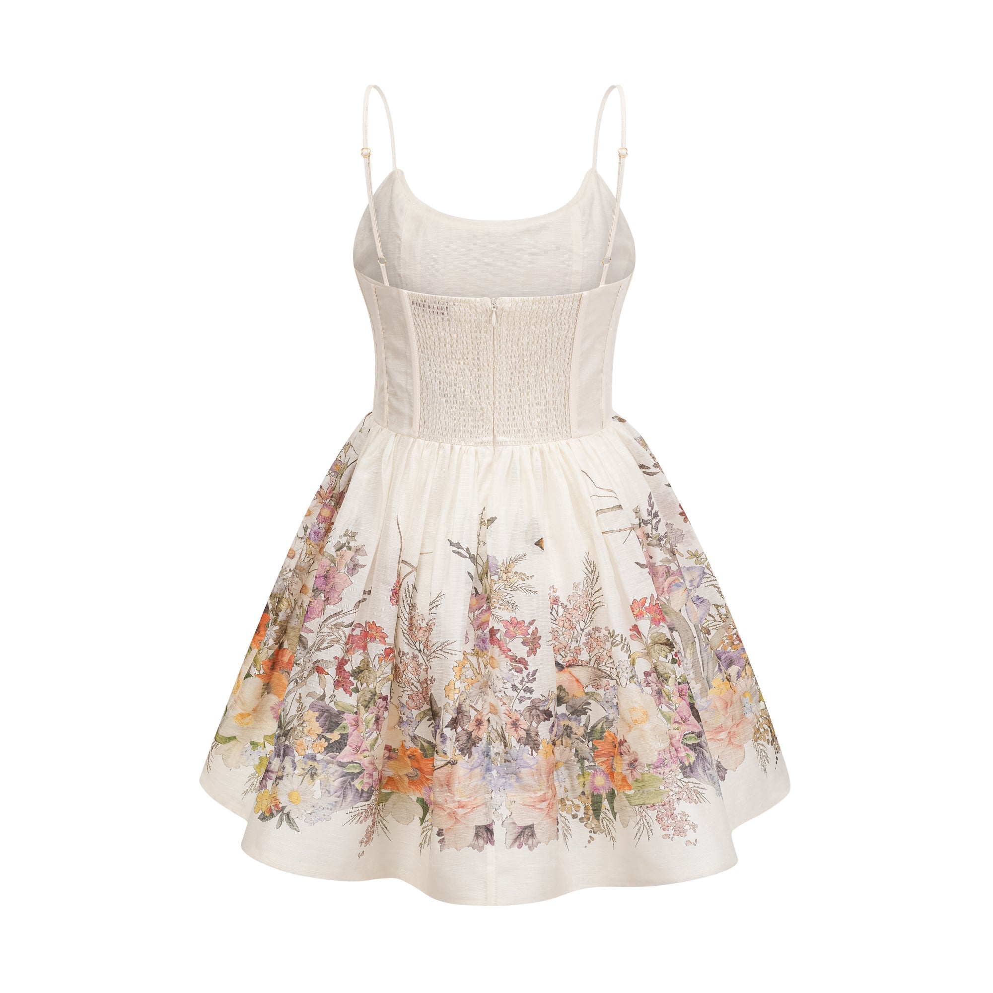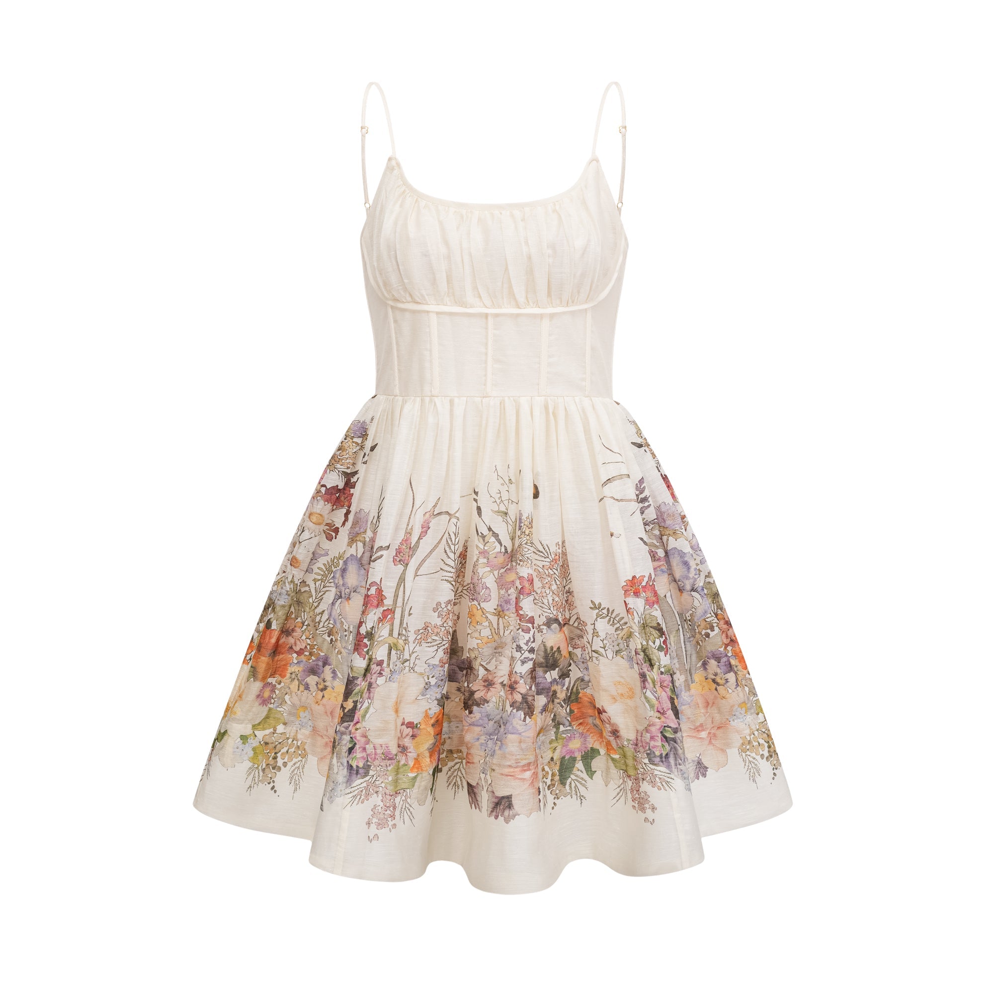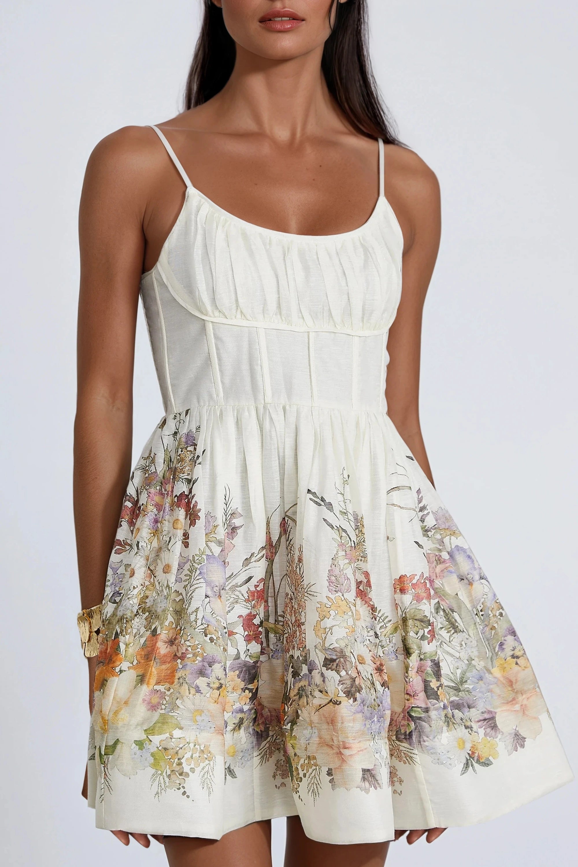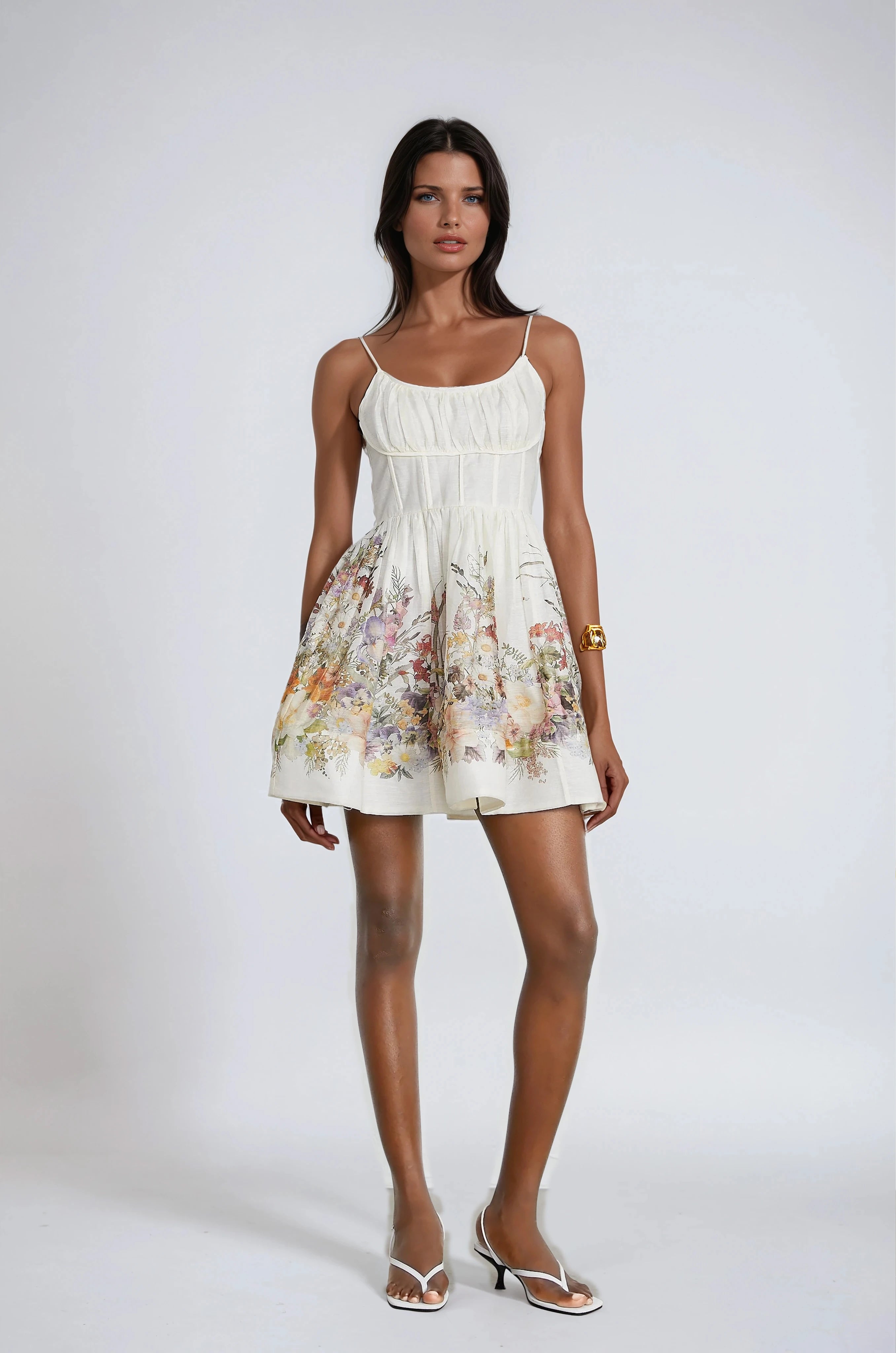 Introducing the Valentia Floral Mini Dress With Ruched Detail — sun-kissed romance spun from pure mixed linen. Delicate spaghetti straps frame a sculpted corset bodice, while a vibrant floral print blooms across the lightweight fabric. Thoughtful side pockets keep essentials close, and a soft cotton lining ensures all-day comfort. Finished with a discreet rear zip and playful mini length, it’s your effortless choice for garden parties, sunset soirées and every carefree moment in between.