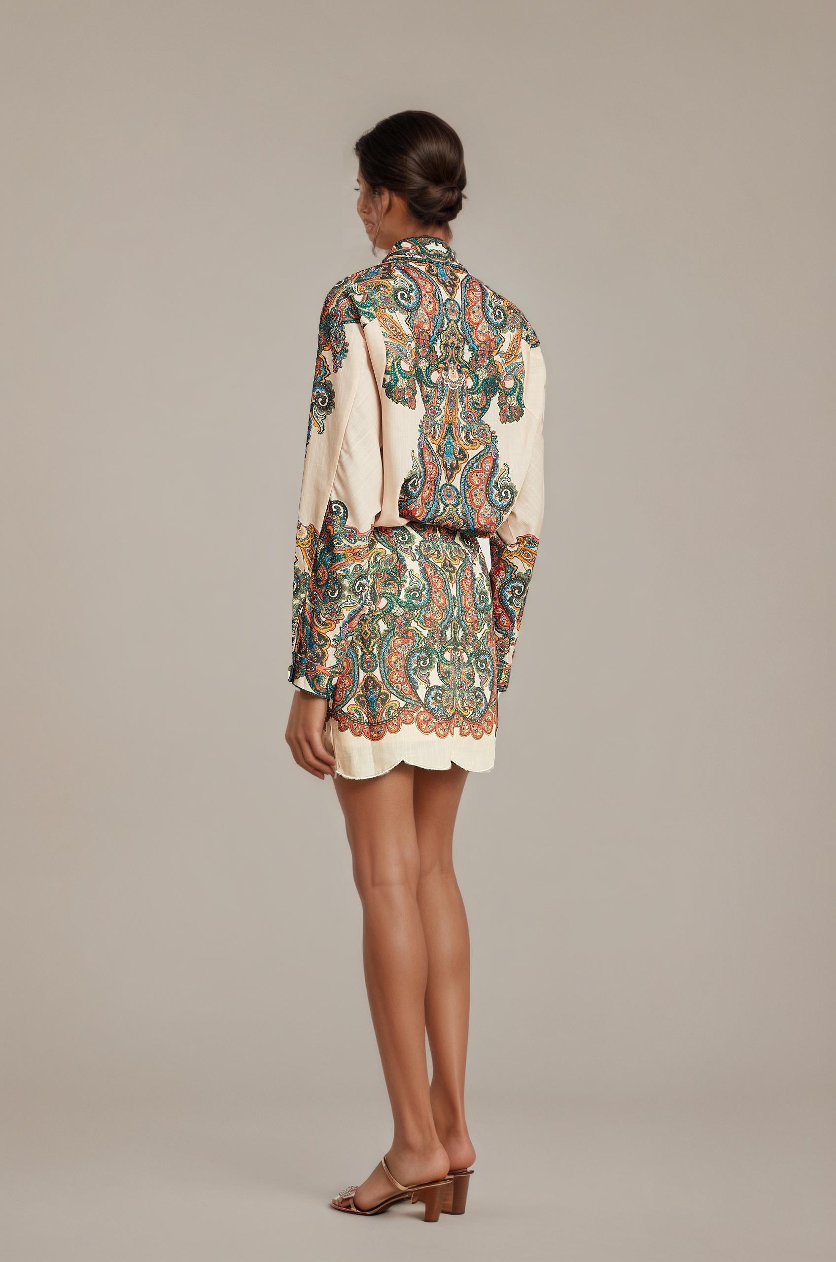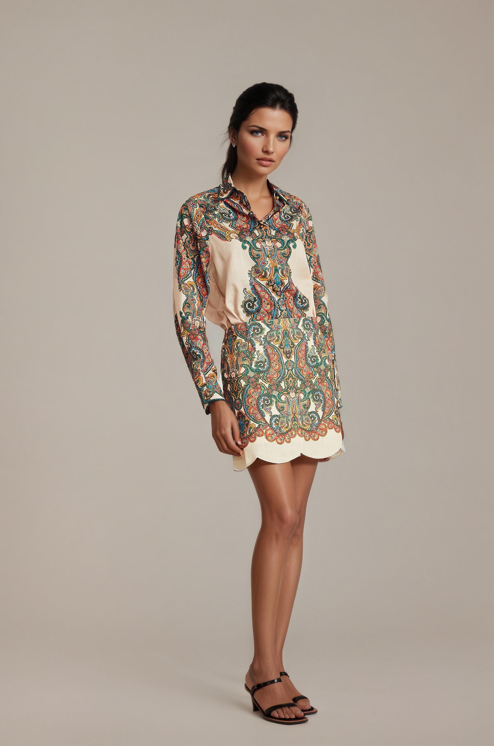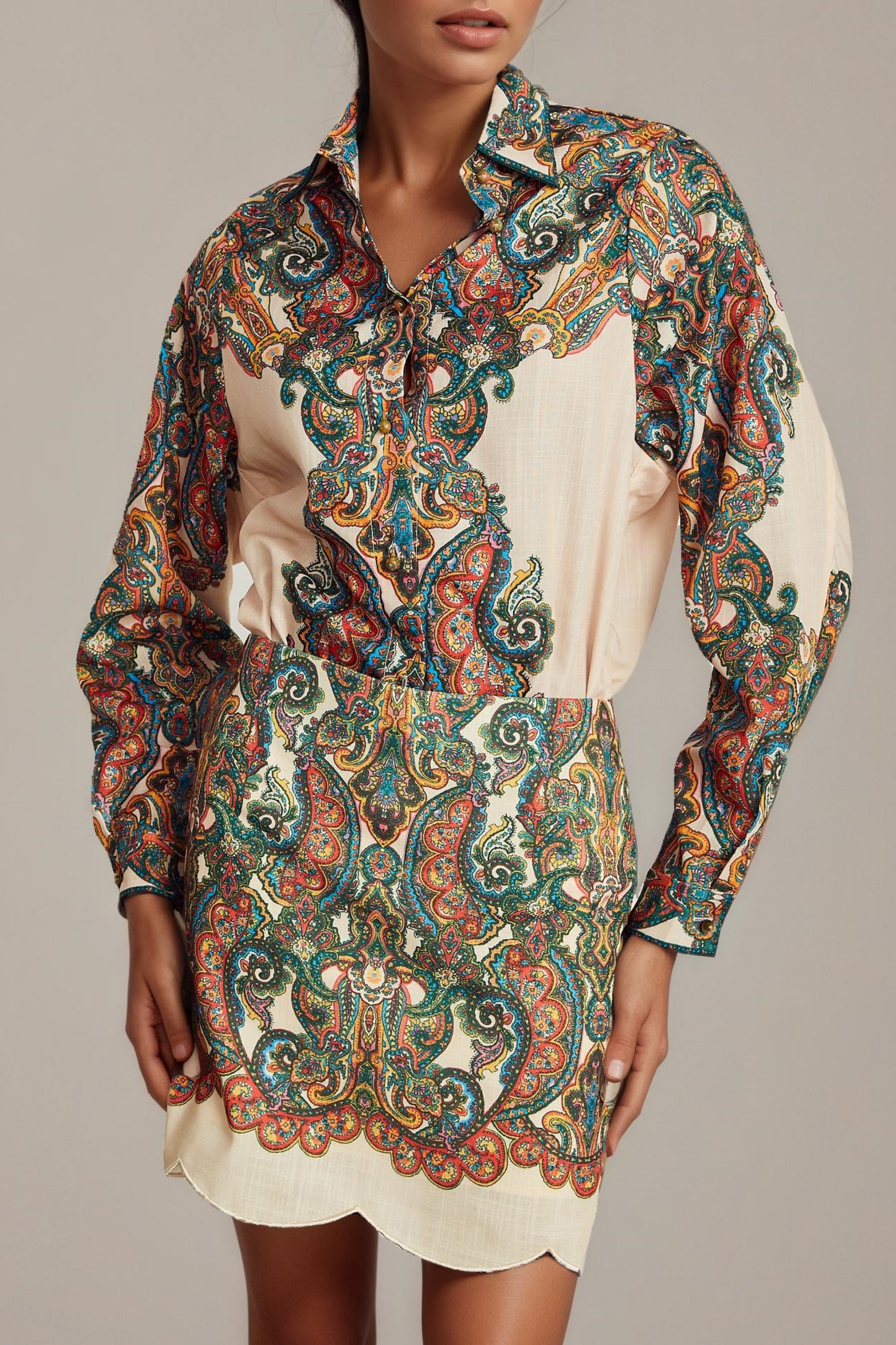 Introducing the Nevaeh Matching Set With Paisley Print, a must-have addition to your wardrobe. This set features an elegant paisley print and classic collar design. With its coordinated scallop hem and versatile style, it offers a perfect fit. Elevate your style with this elegant and versatile ensemble.