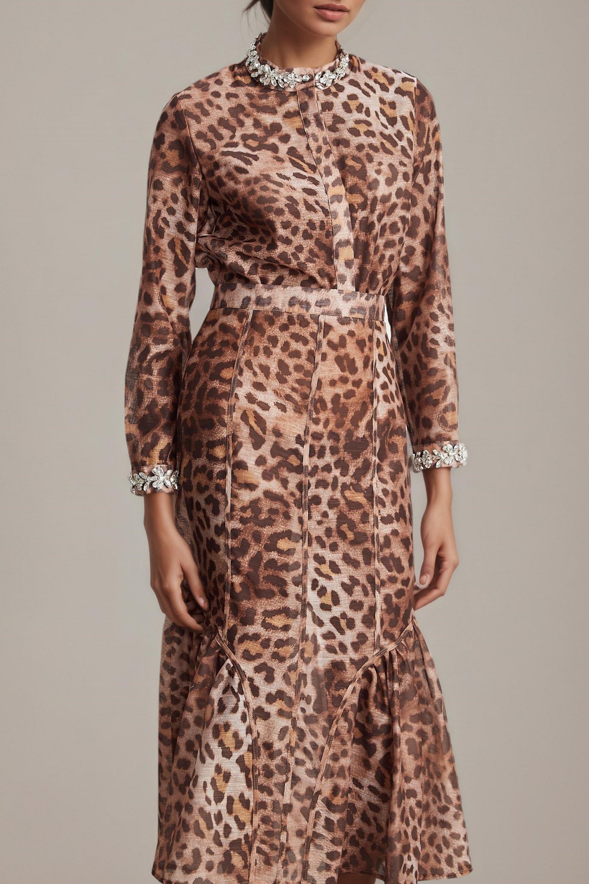 Introducing the Solange Matching Set With Leopard Print, a must-have addition to your wardrobe. This set features a bold leopard print and elegant crystal embellishment. With its coordinated design and flared hem, it offers a perfect fit. Elevate your style with this elegant and versatile ensemble.