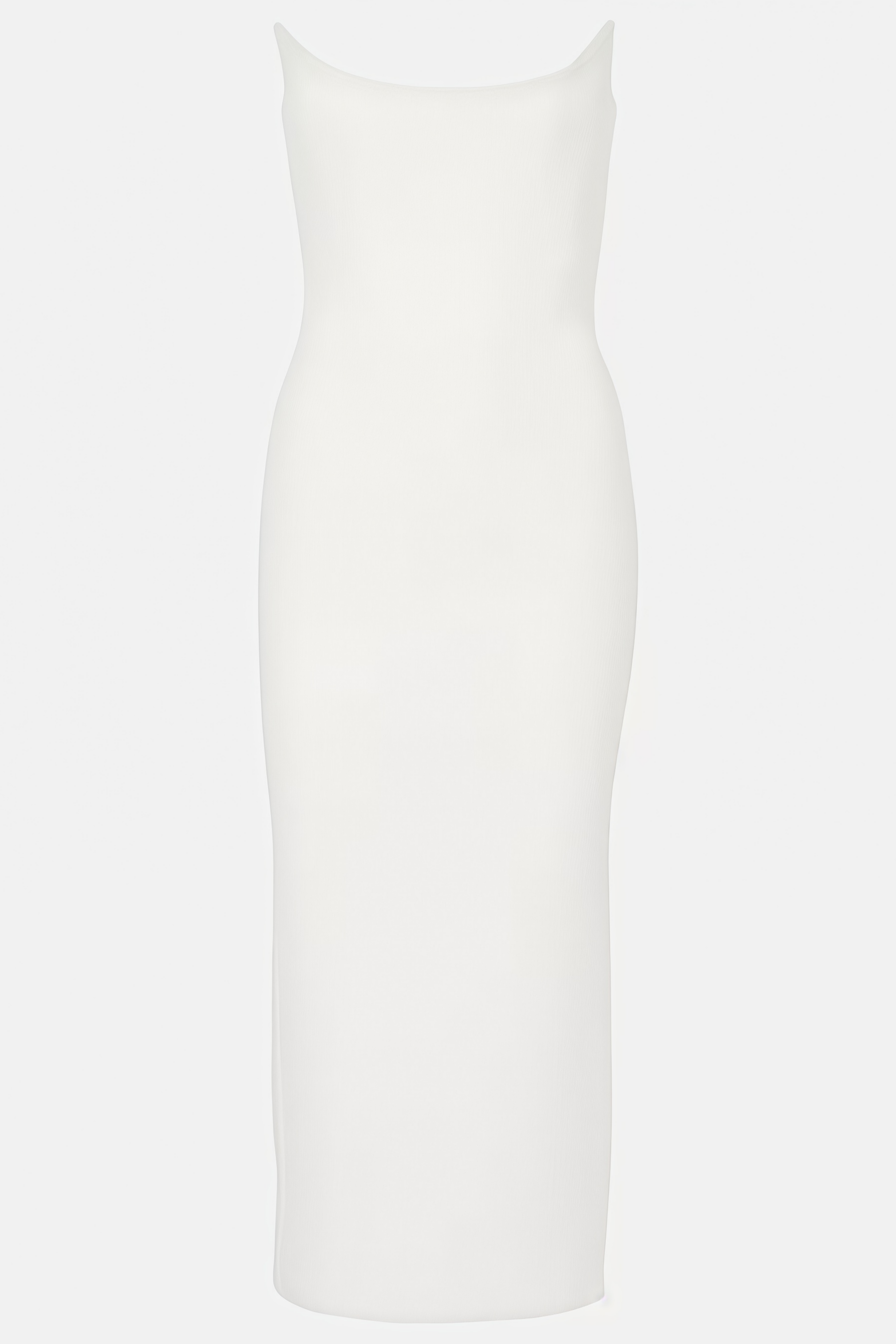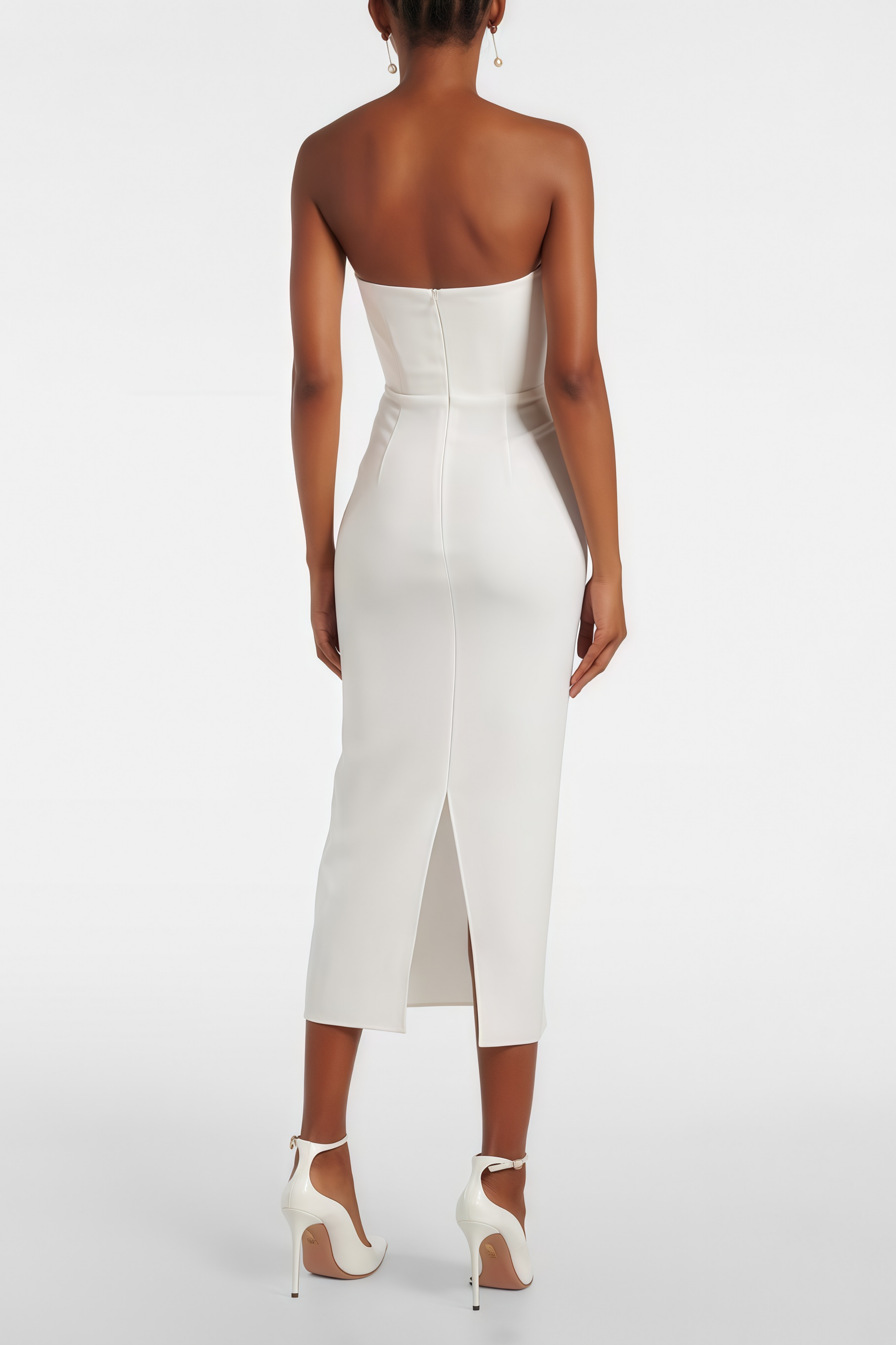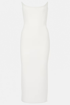 Introducing the Freda White Strapless Slit Midi Dress, a must-have addition to your wardrobe. This sleeveless design combines an off-the-shoulder strapless neckline with a sculpted fitted silhouette. The dress flows into a modern midi-length skirt with an elegant rear slit, secured with discreet rear zip fastening for a seamless fit. Elevate your style with this elegant and versatile dress.