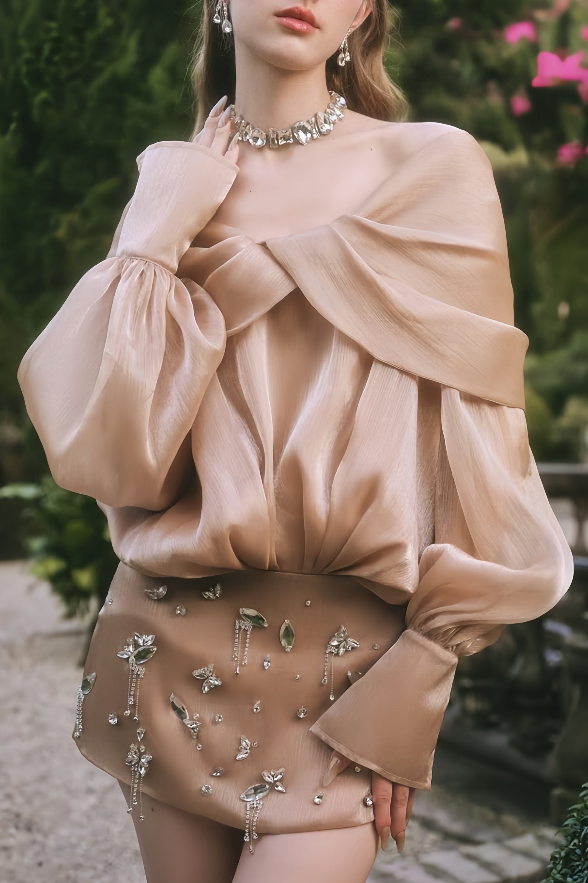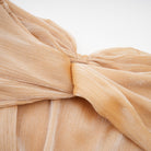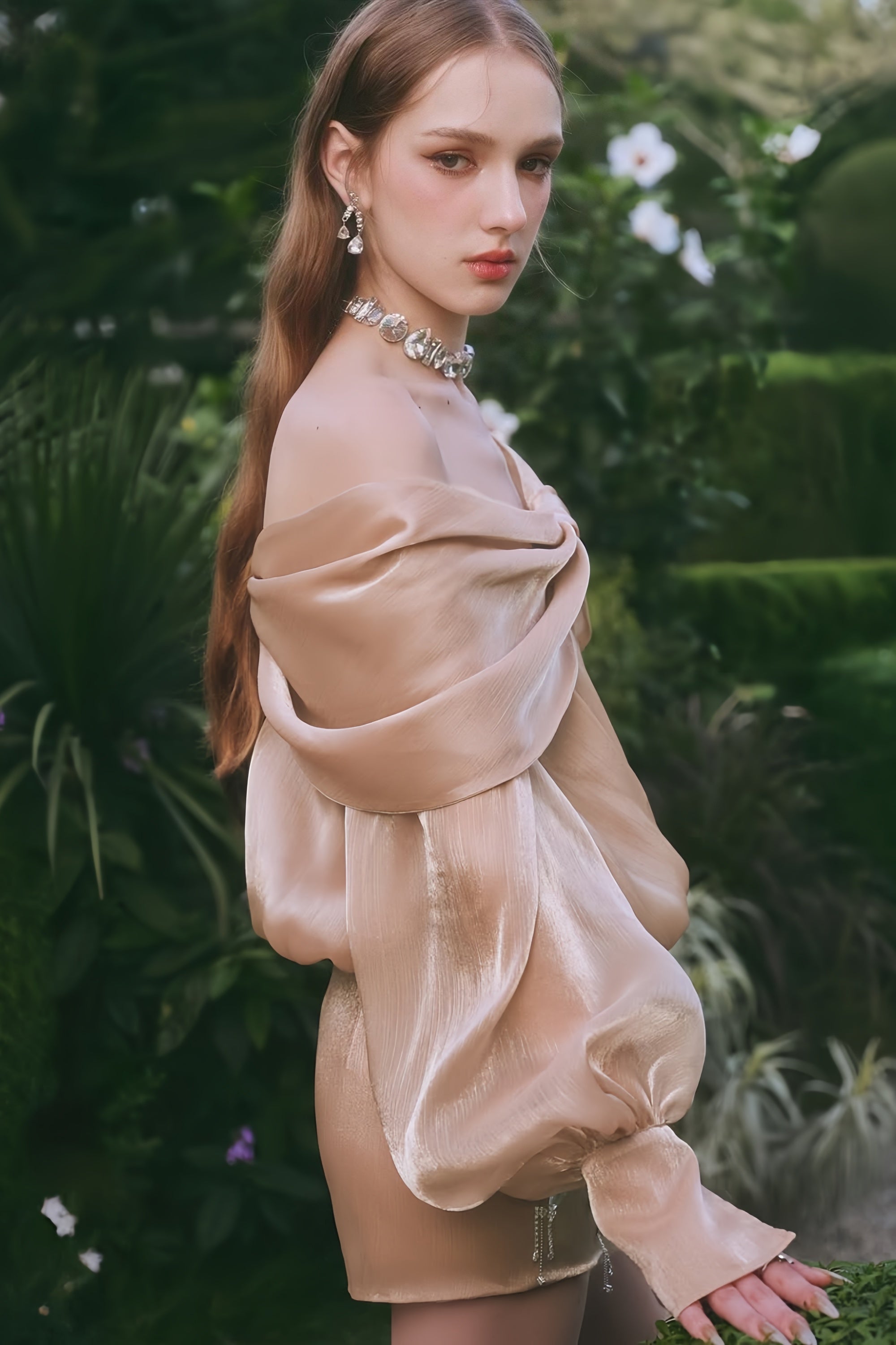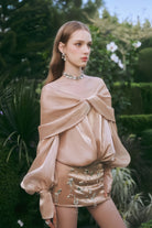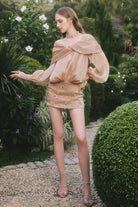 Introducing the Adelina Gold Mini Dress with Crystal Embellishments and Panelling — your new go-to for instant glamour. Drenched in a luminous gold-tone, this off-shoulder stunner showcases dramatic long puff sleeves and a sleek panelled bodice hand-embellished with sparkling crystals. A clean straight hem skims the thigh for a flirty finish, while a discreet side zip keeps the silhouette smooth and secure.