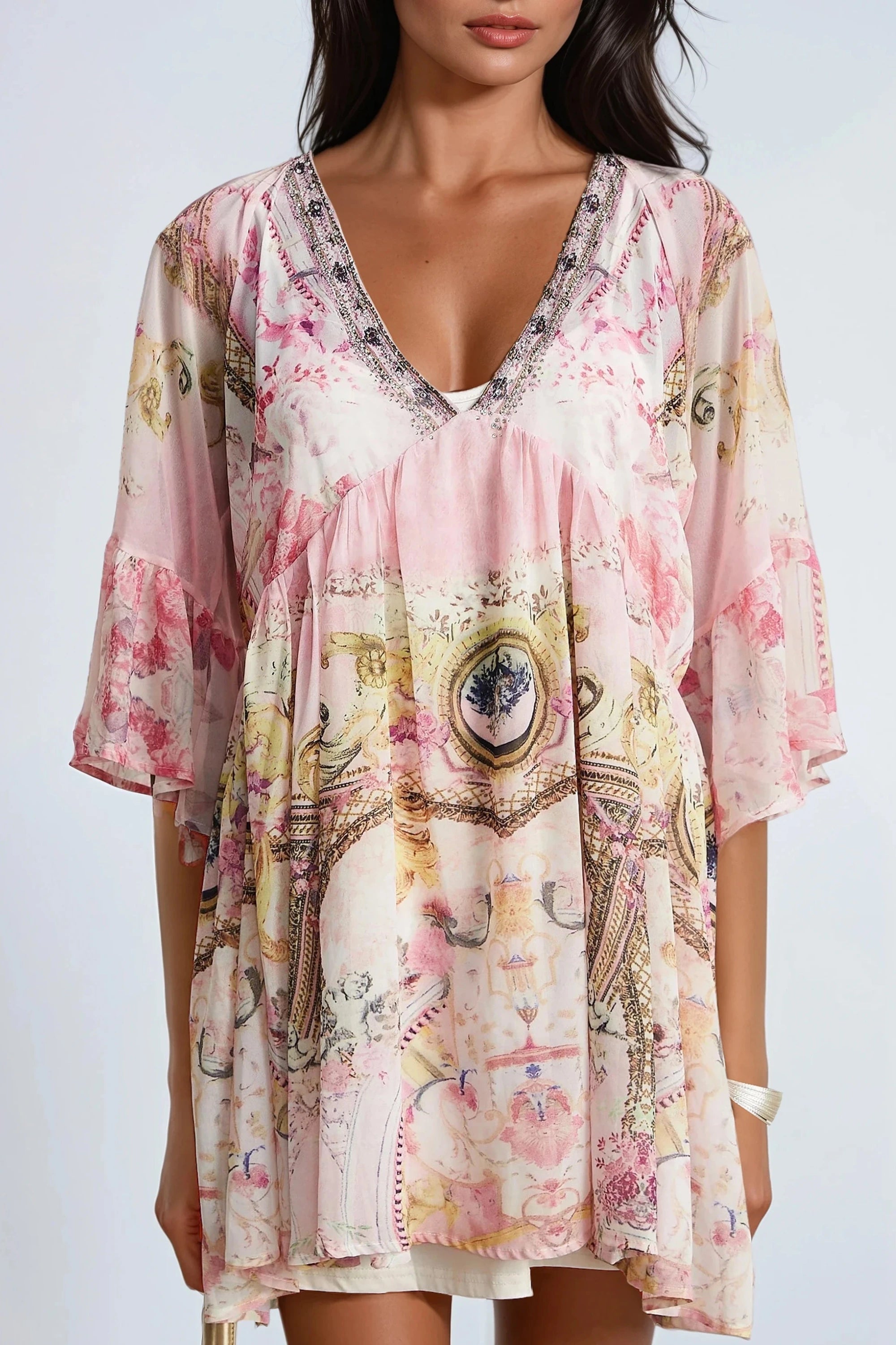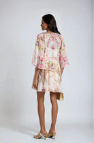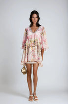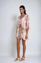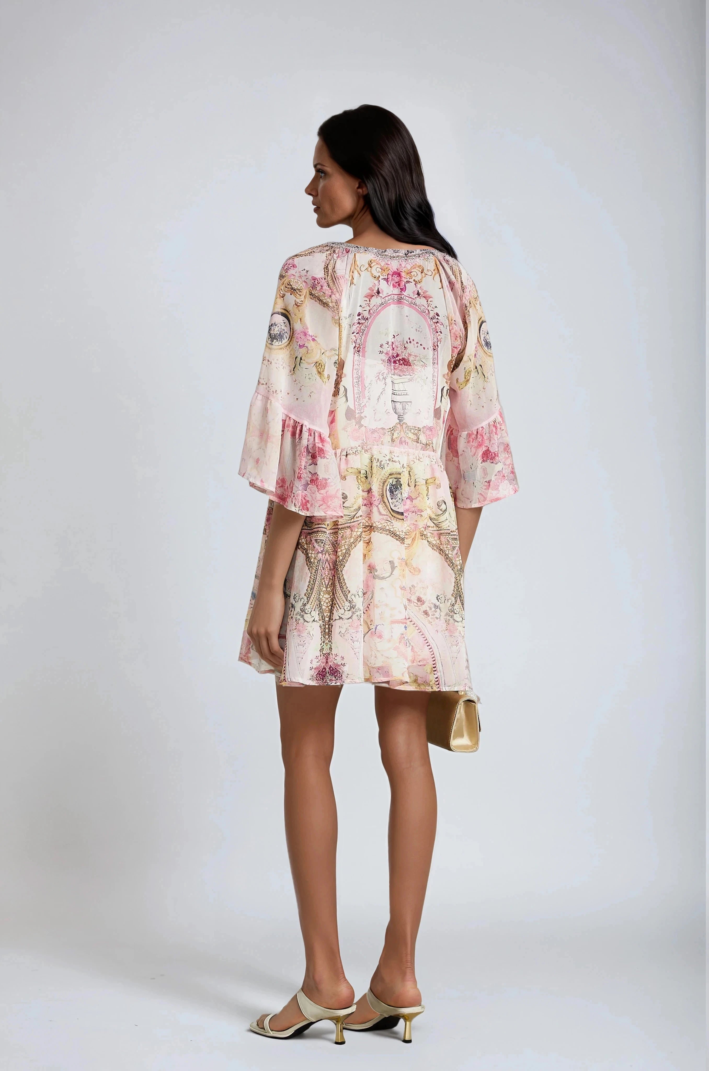 Introducing the Camille Mini Dress With Pattern Print, a must-have addition to your wardrobe. This dress features half flared sleeves, deep V-neck, pattern print, crystal embellishment, high-low hem and rear zip fastening. Elevate your style with this elegant and versatile dress.