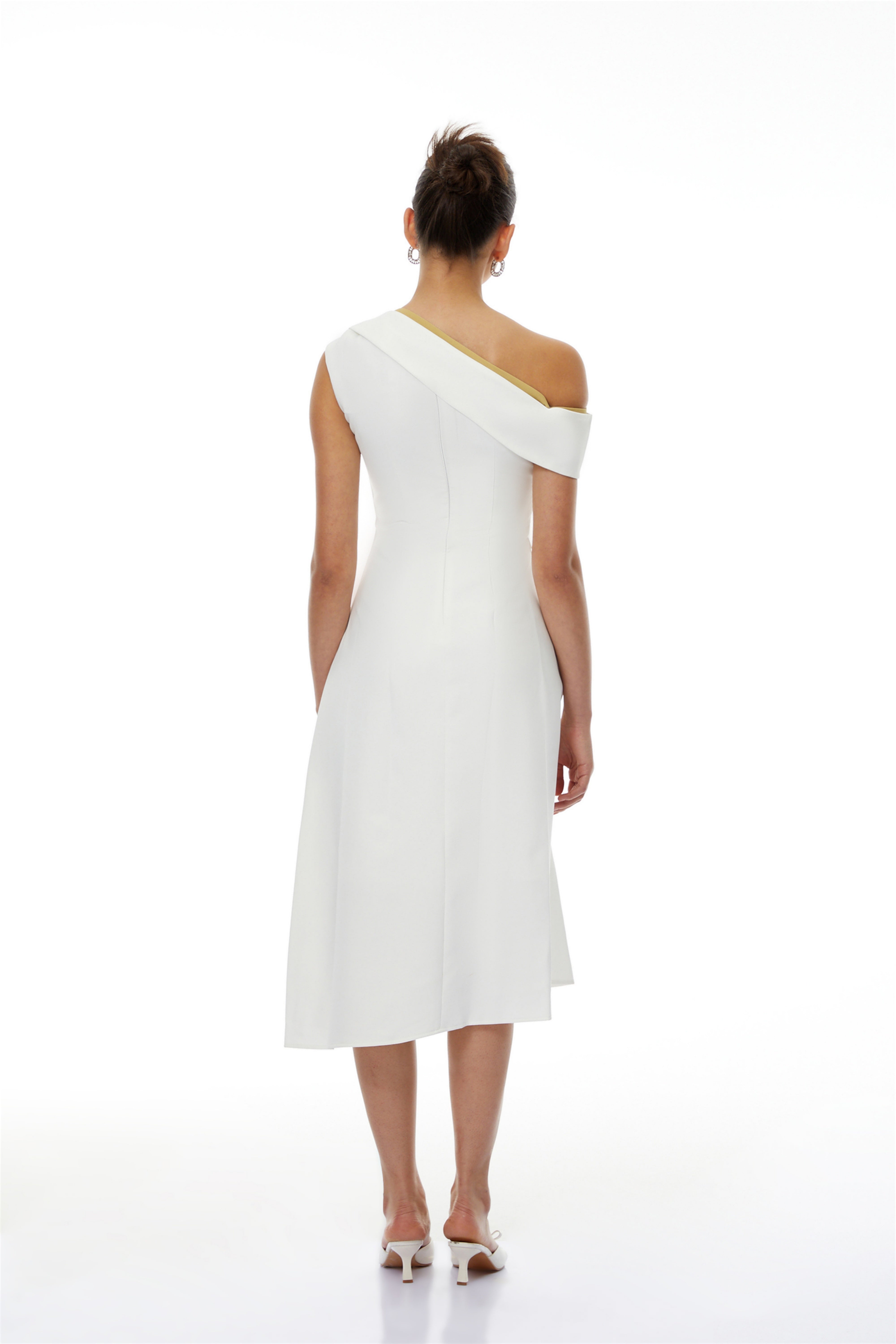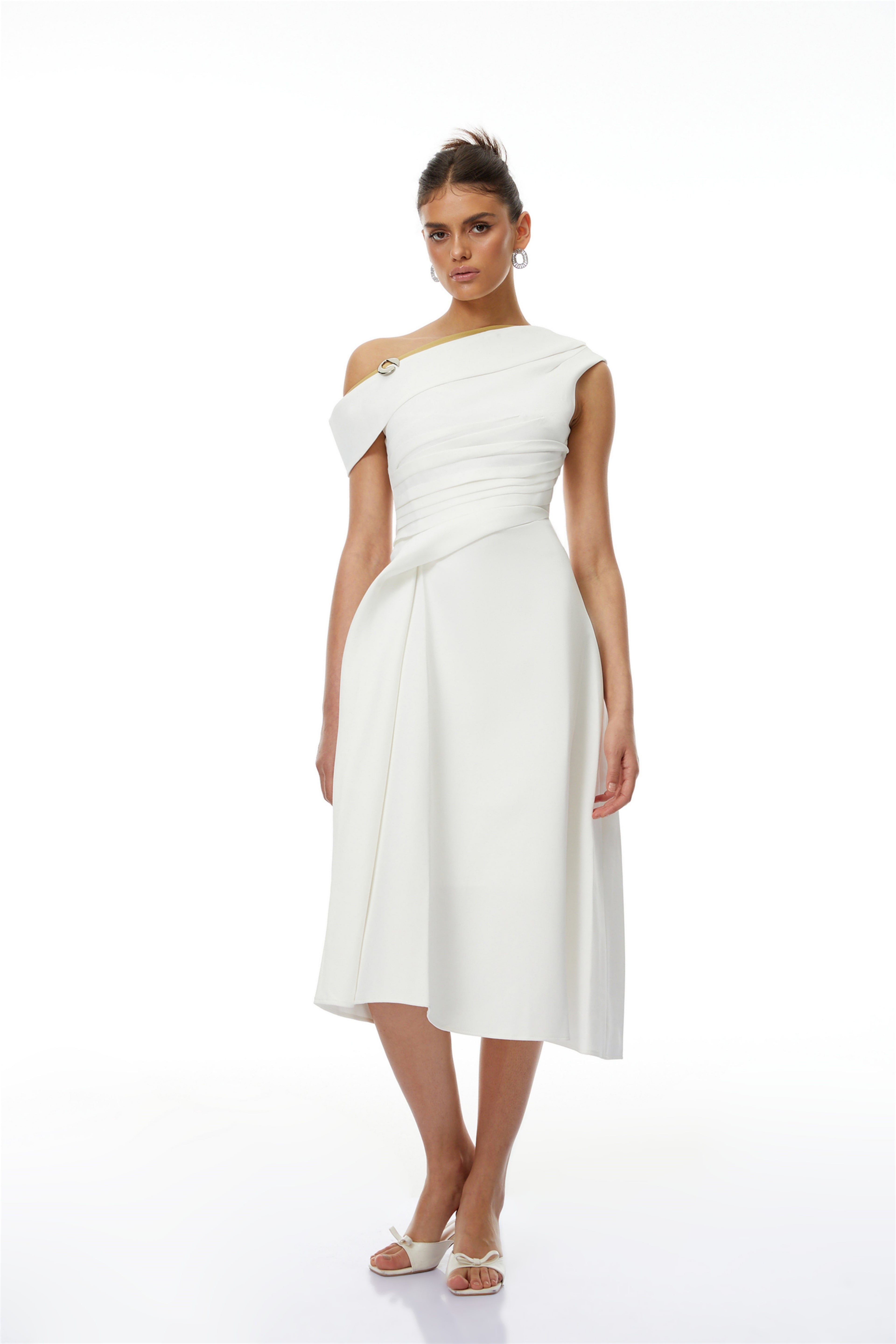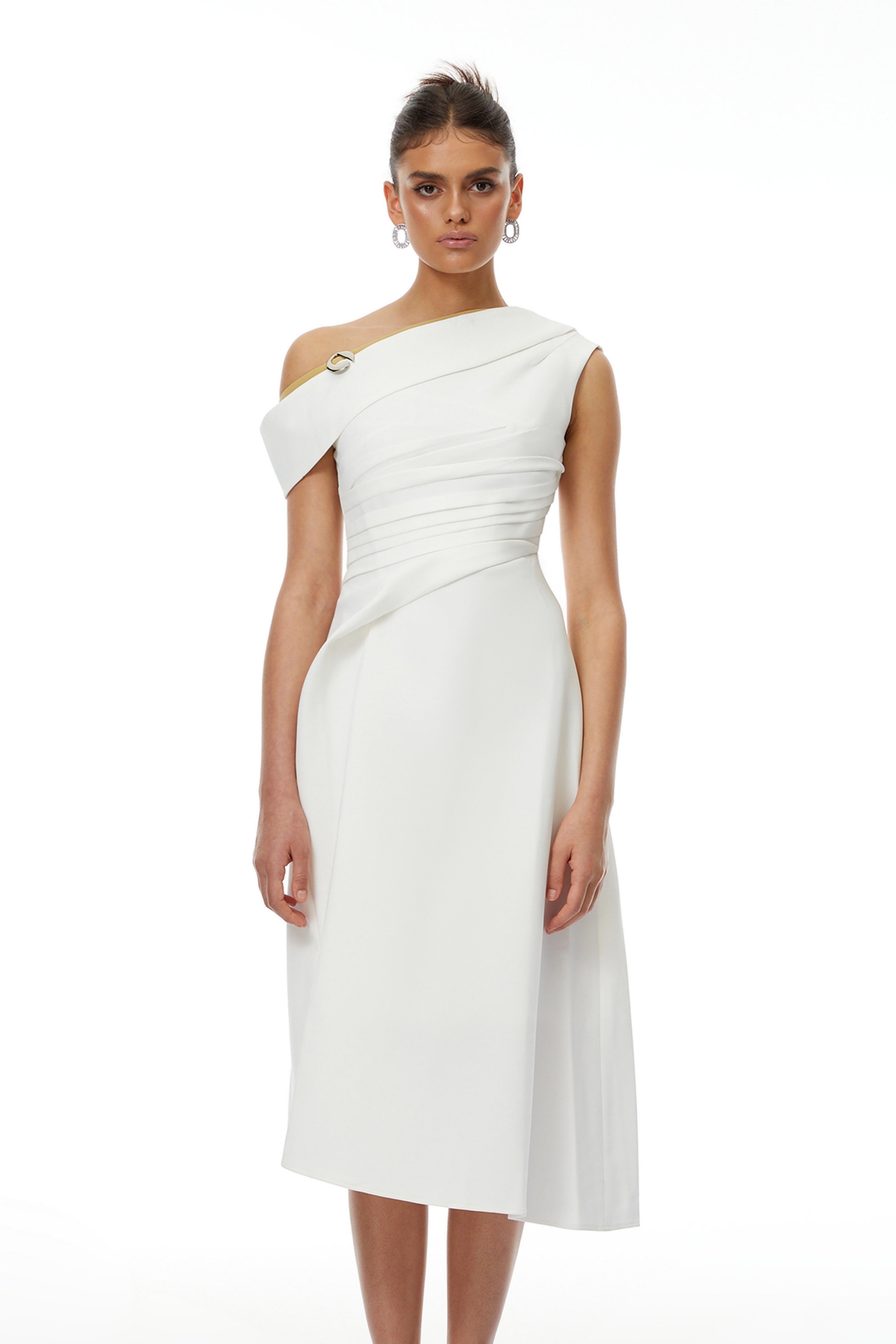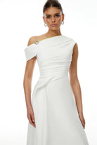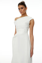 Jovie White Asymmetrical Ruched Midi Dress