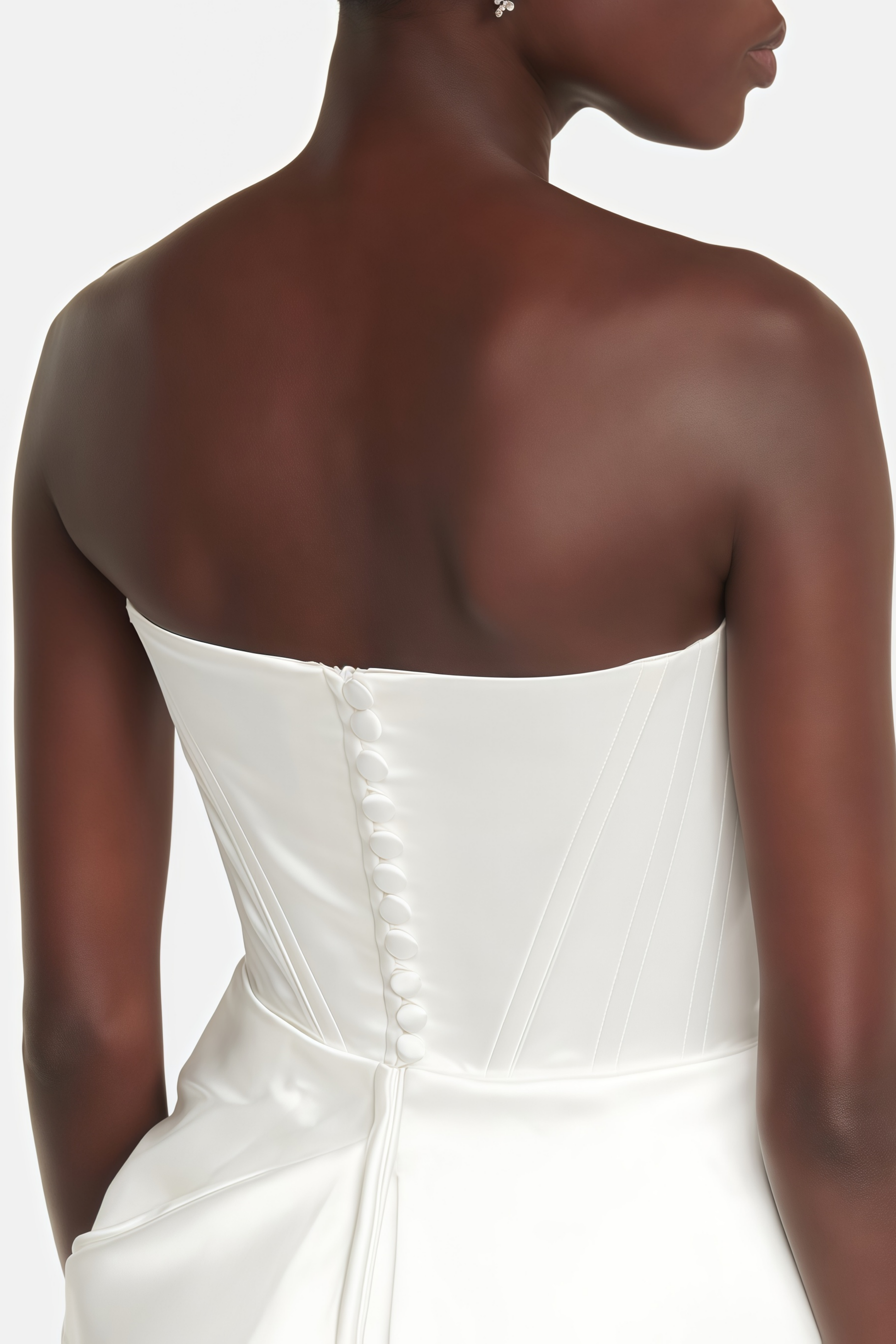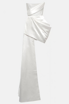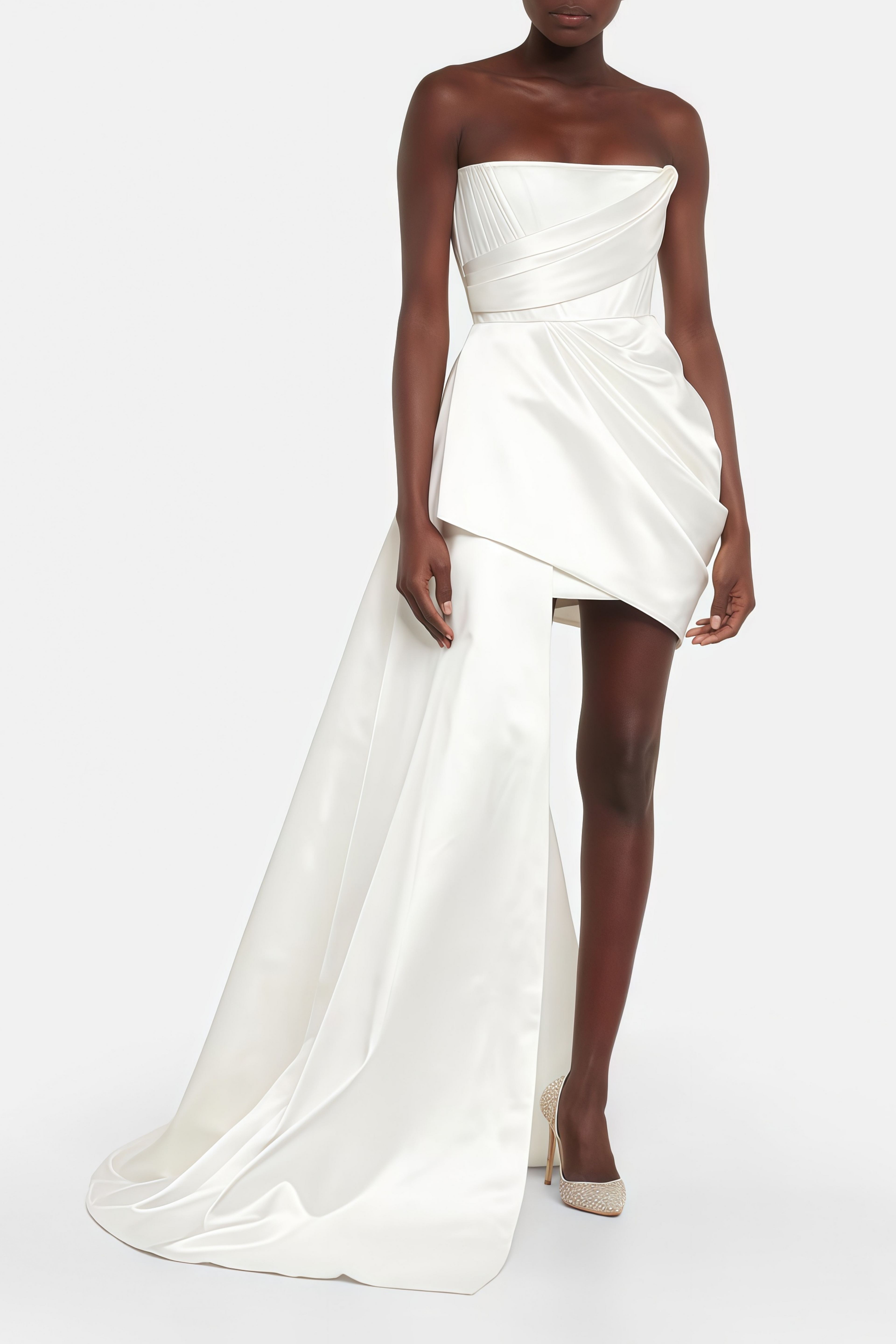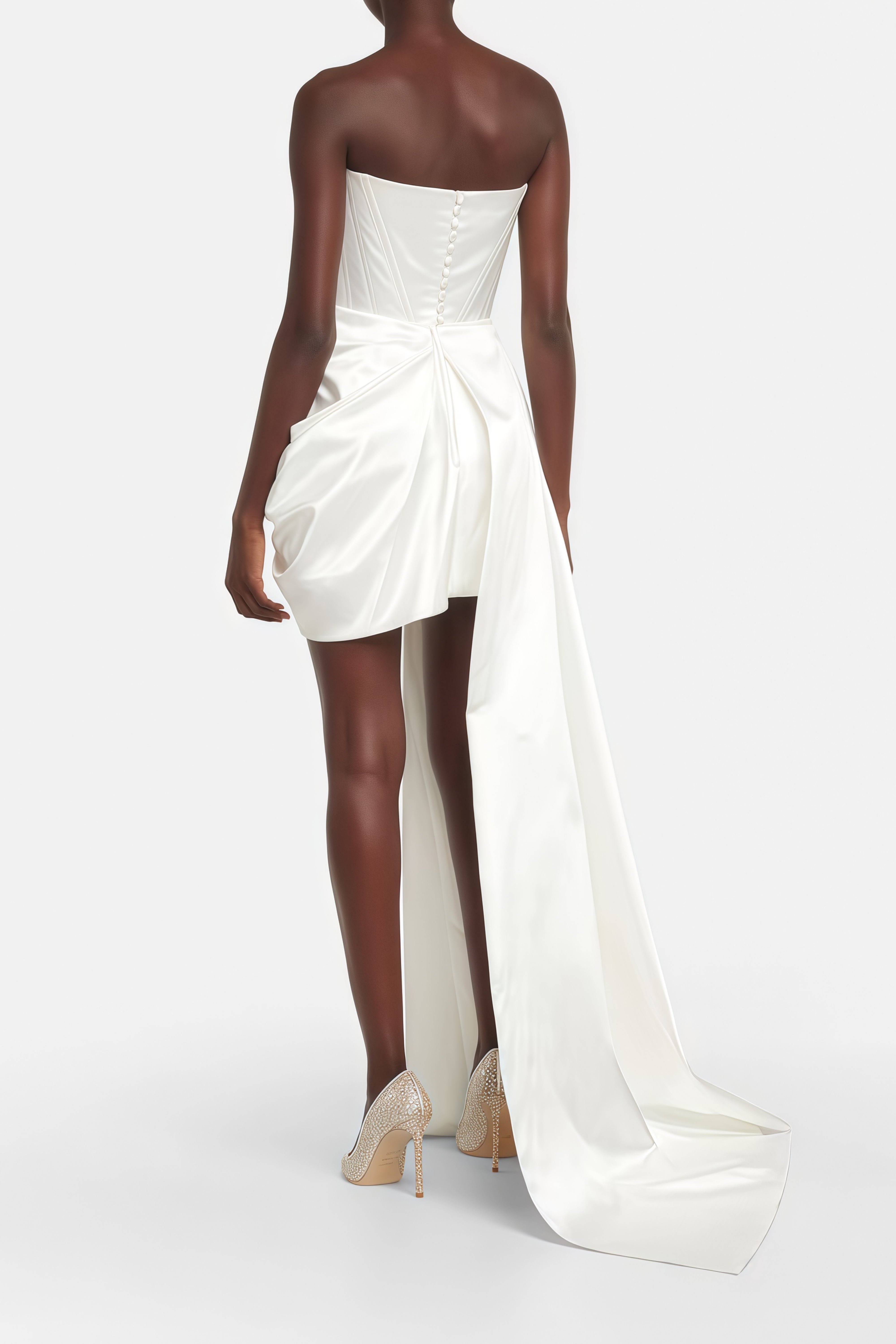 Introducing the Bernice White Satin Asymmetric Mini Dress, a must-have addition to your wardrobe. Crafted in satin finish, this sleeveless strapless design features an off-the-shoulder neckline structured with a boned bodice. The dress combines a chic mini-length silhouette with a draped asymmetric hem and elegant train detail, secured with refined rear zip fastening. Elevate your style with this elegant and versatile dress.