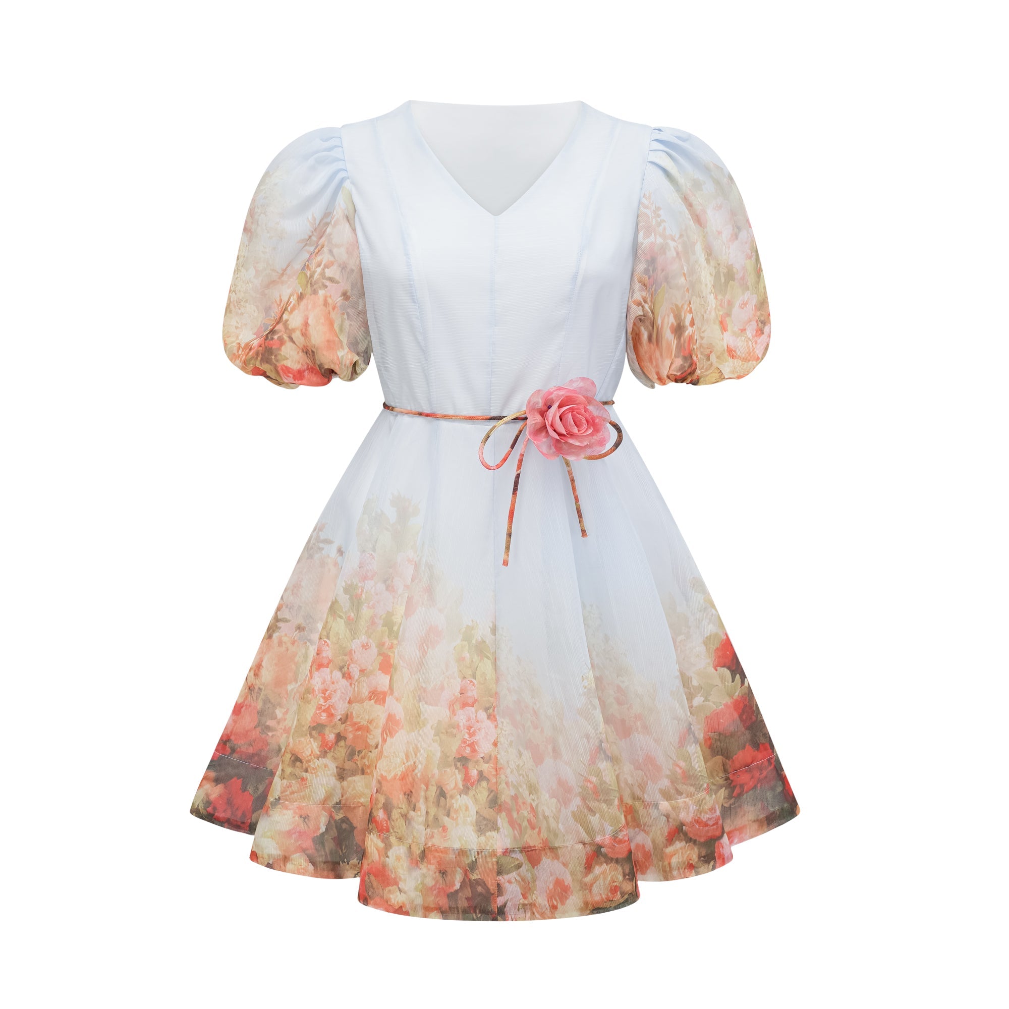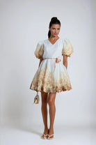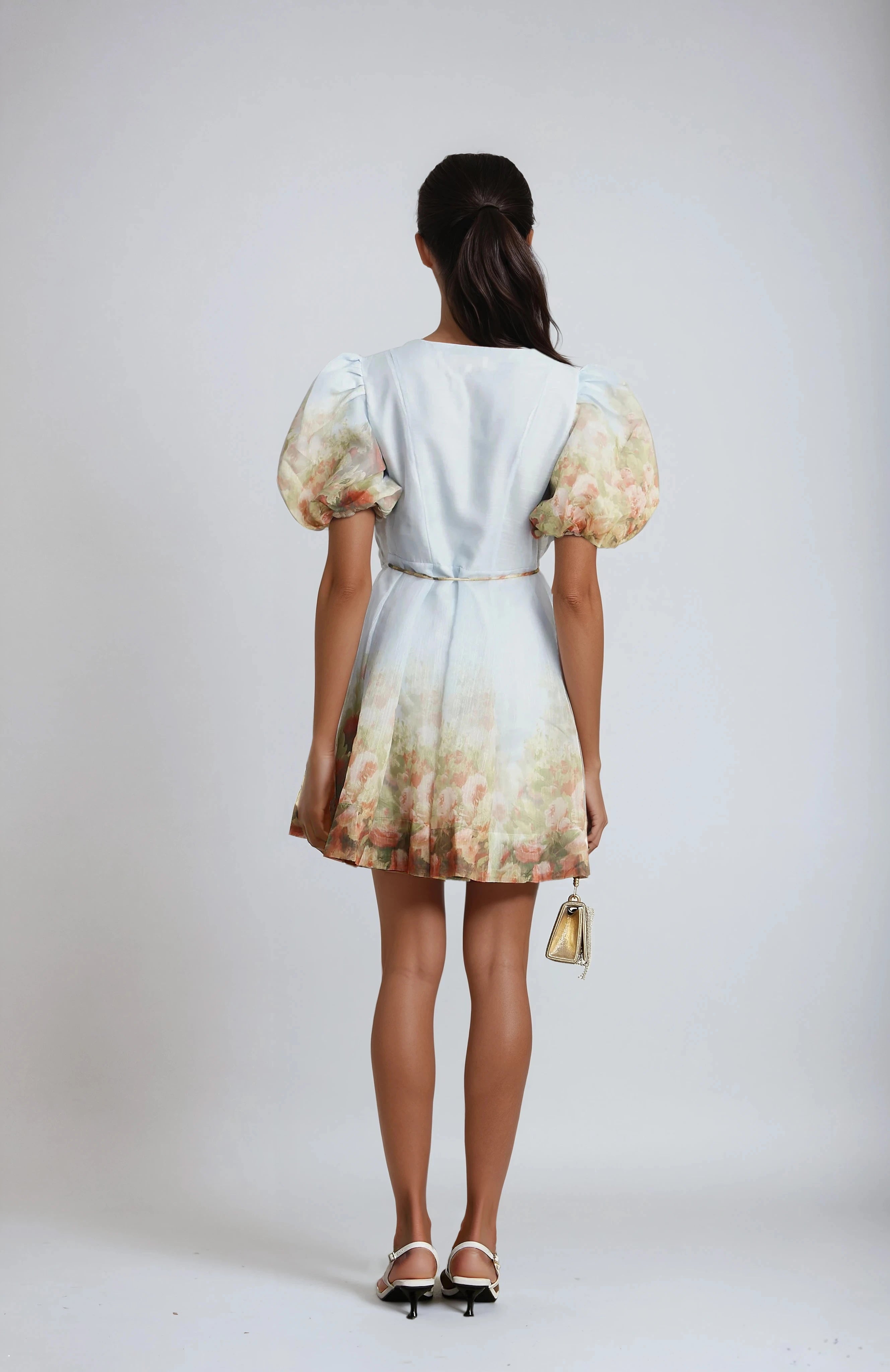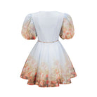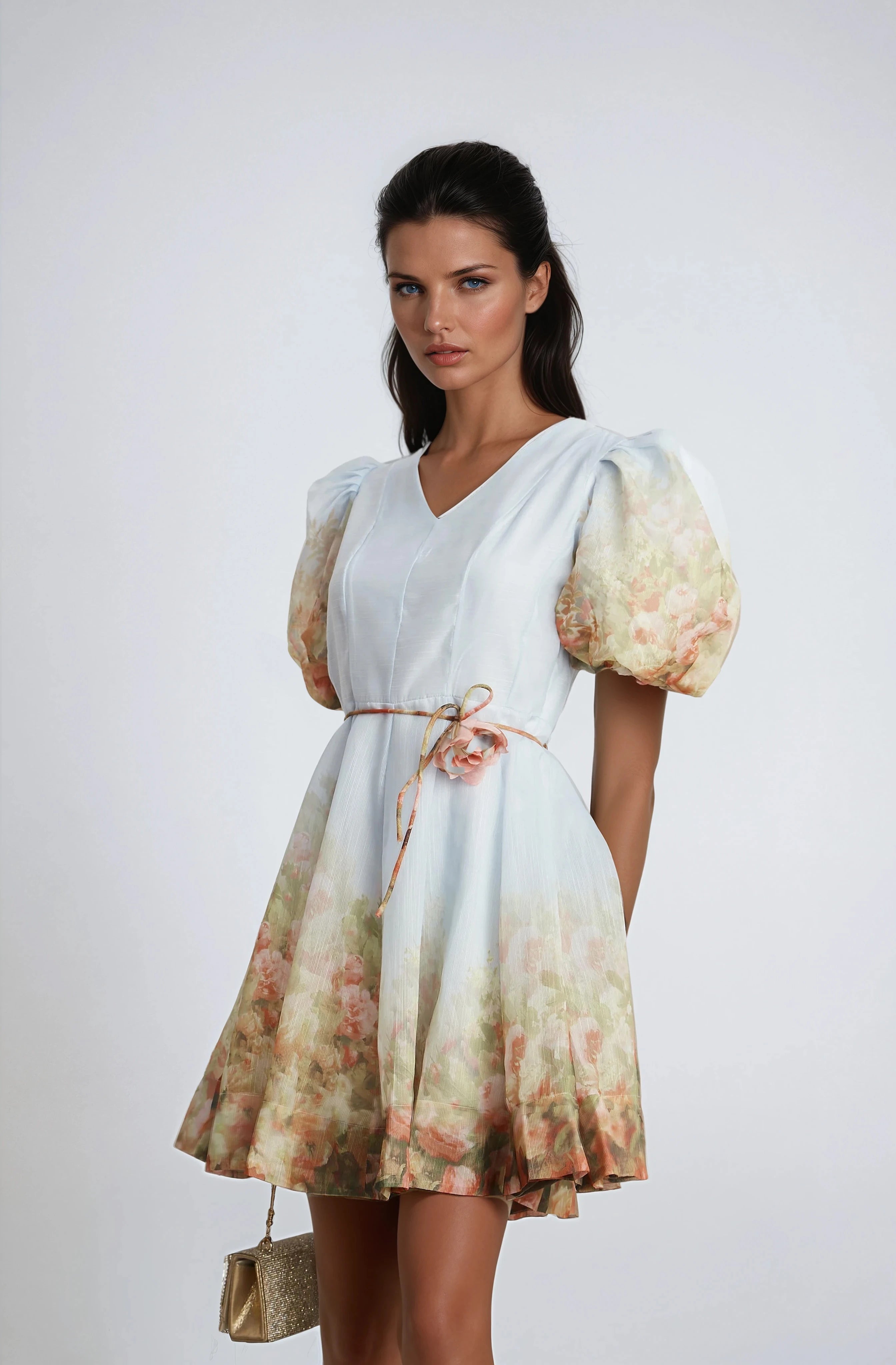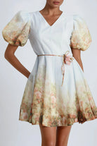 Introducing the Céleste Mini Dress With Floral V-Neck, a must-have addition to your wardrobe. This dress features short puff sleeves, a V-neckline, and delicate faux-flower embellishments. With its tied-waist belt and rear zip fastening, it offers a perfect fit. Elevate your style with this elegant and versatile dress