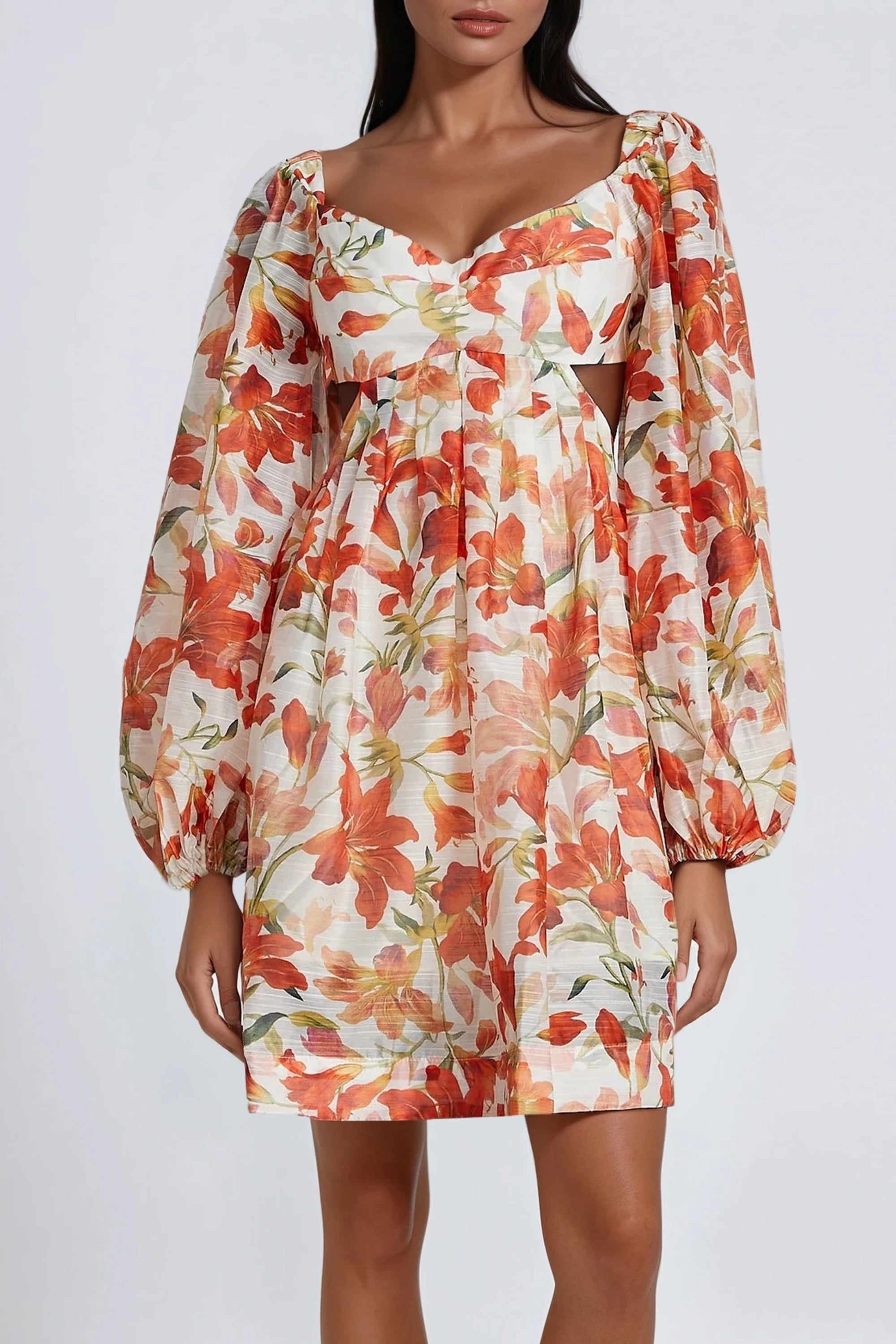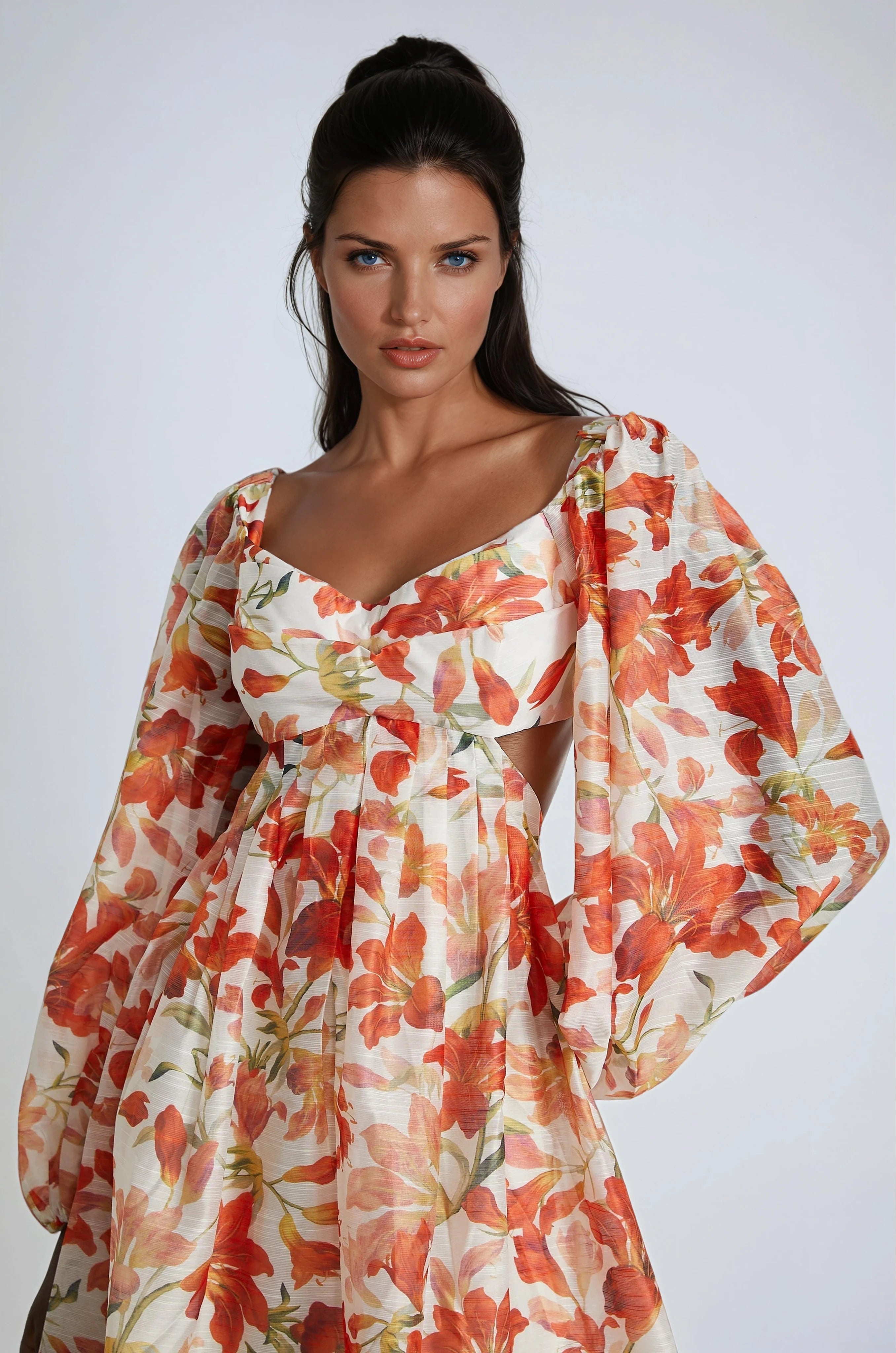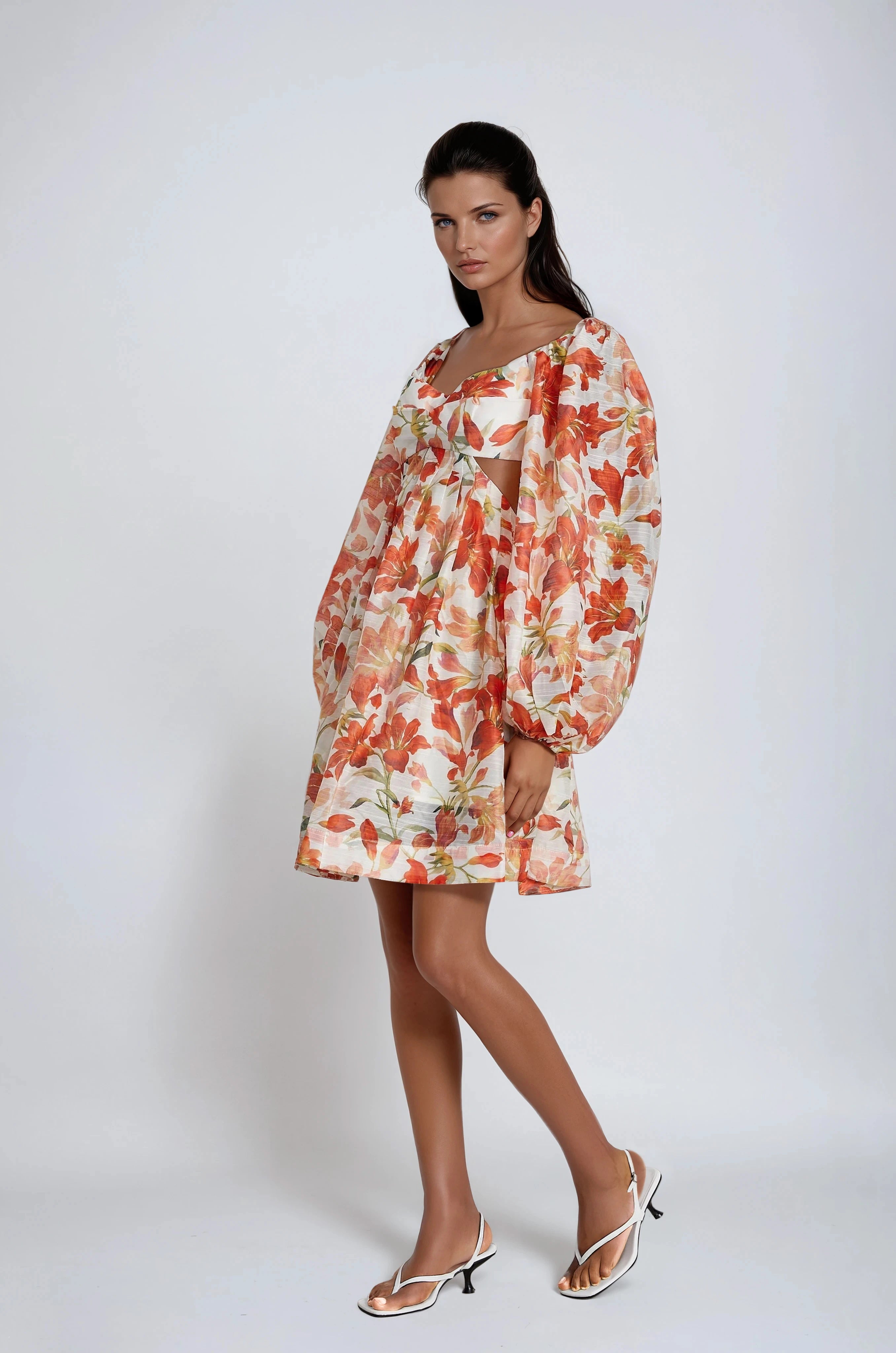 Introducing the Diane Mini Dress with Floral Print — an exuberant burst of color and movement. Drenched in vivid multicolour florals, this dress features long sleeves and a daring cut-out waist that adds a modern edge to its romantic print. Every inch is fully pleated, allowing the fabric to ripple like liquid silk as it falls to a playful mini length. Slip it on for rooftop sunsets, gallery openings, and every moment that calls for fearless femininity.