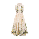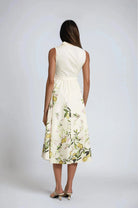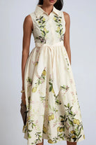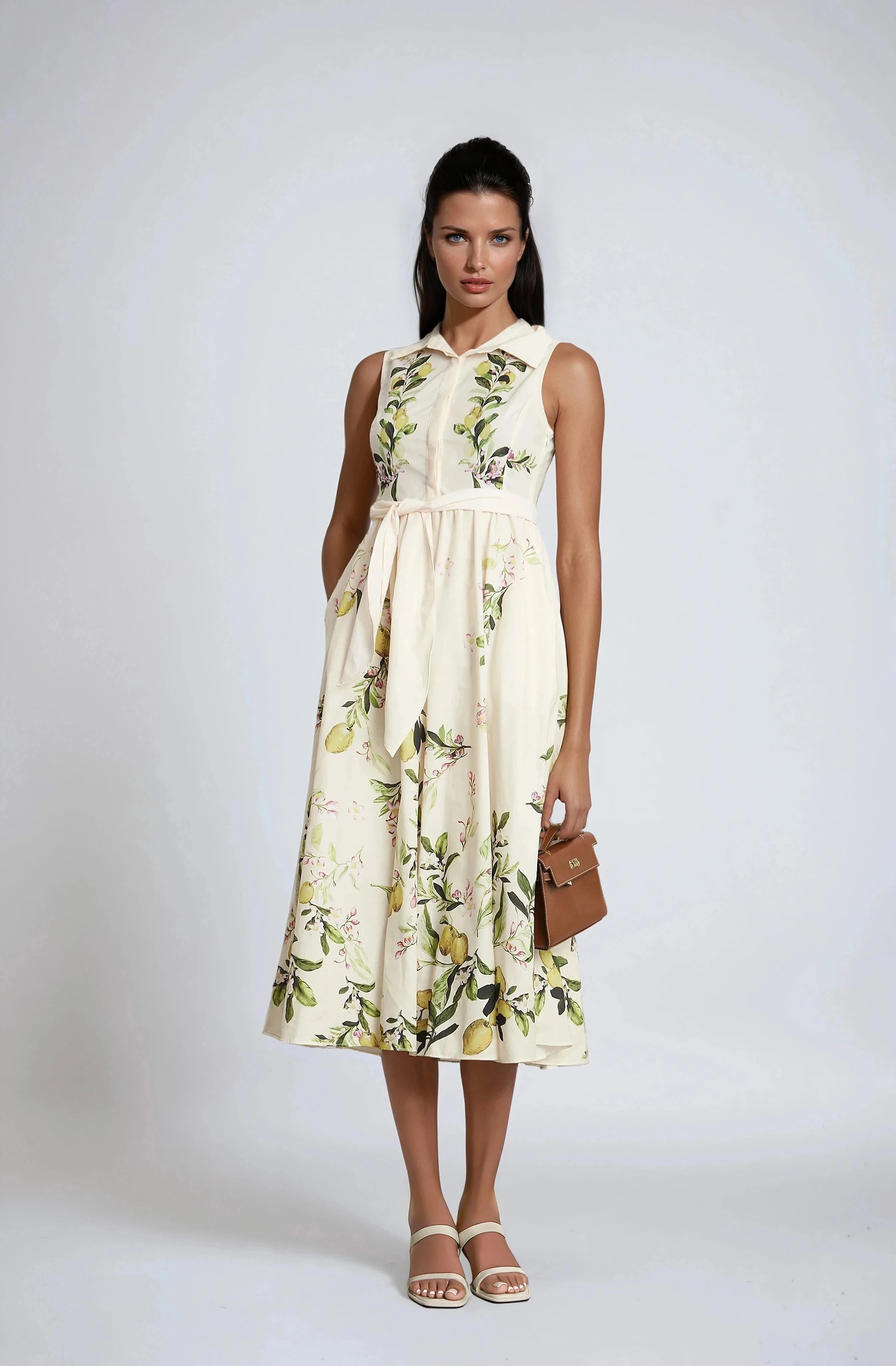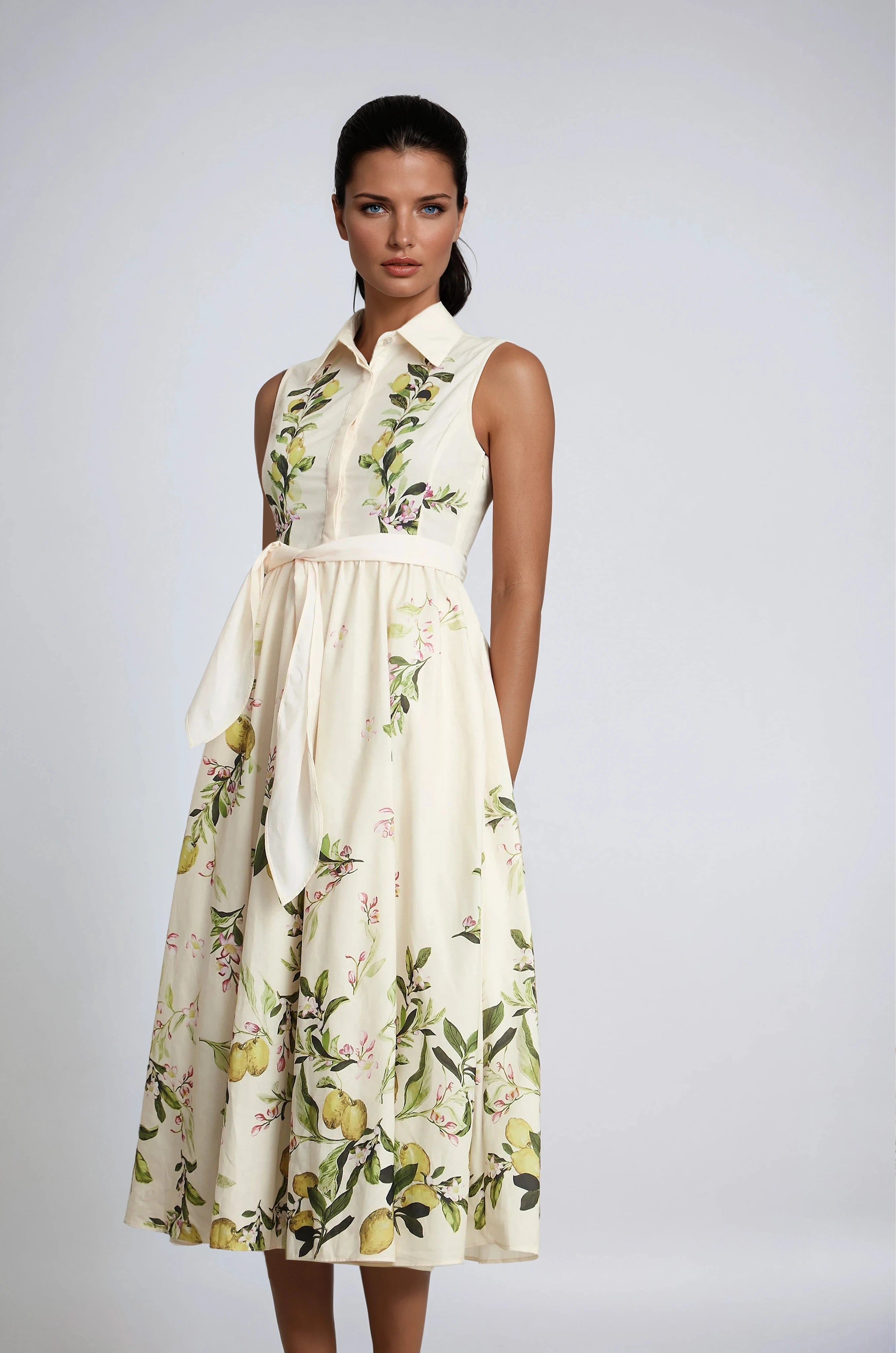 Introducing the Jean Midi Dress With Floral Print, a must-have addition to your wardrobe. This dress features spread collar, sleeveless cut, and tied waist. With its all-over floral print, flared skirt, and front button fastening, it offers a perfect fit. Elevate your style with this elegant and versatile dress.