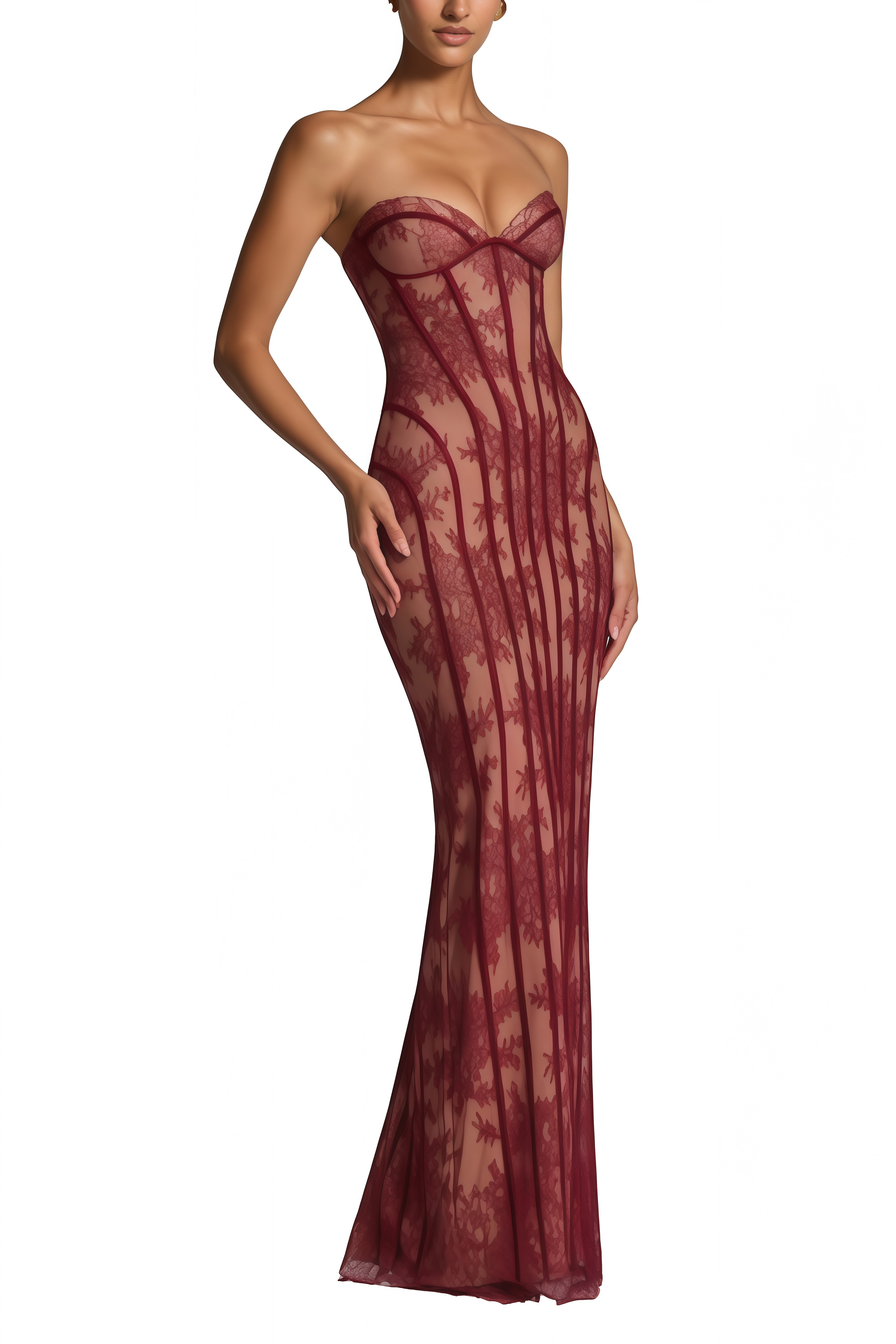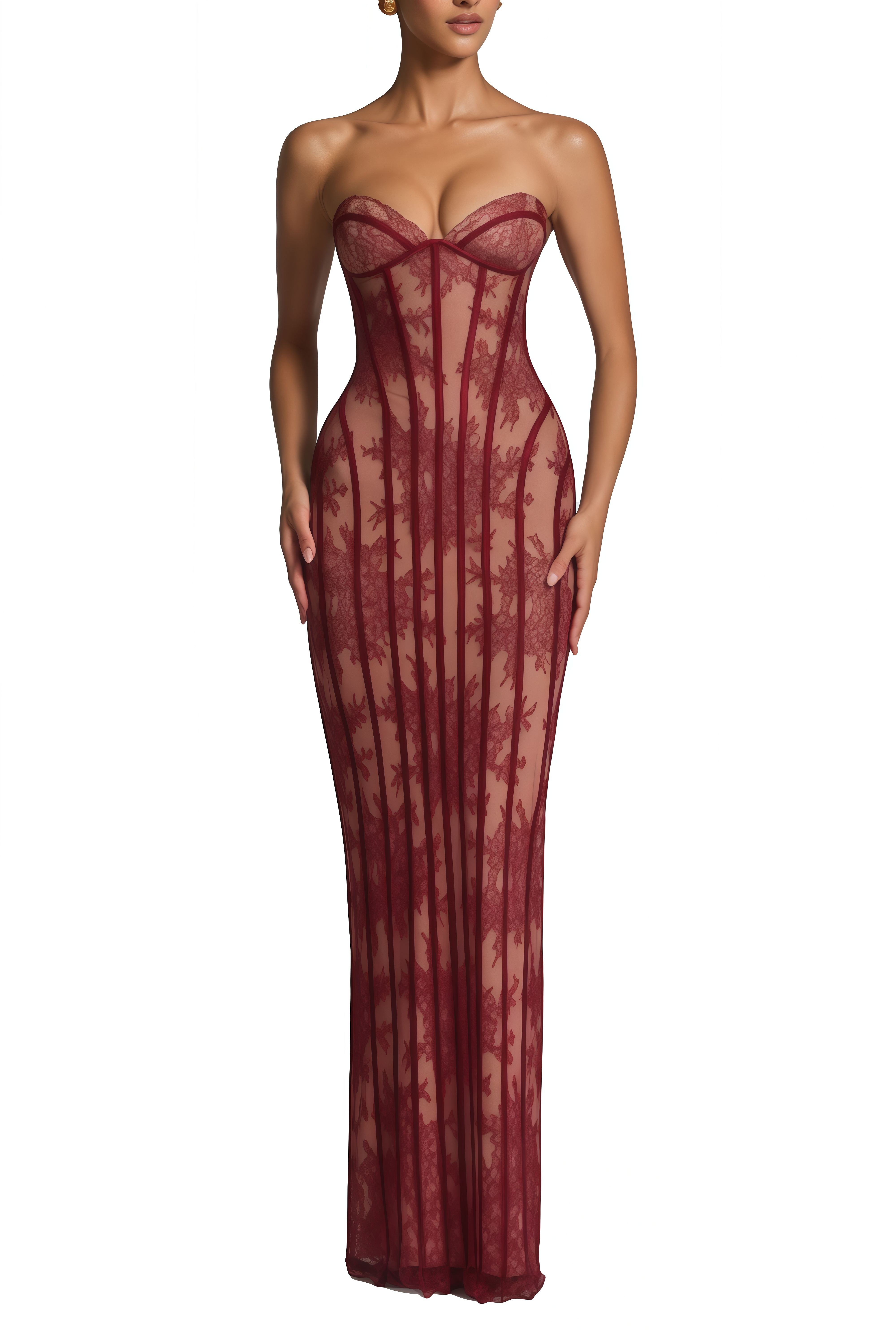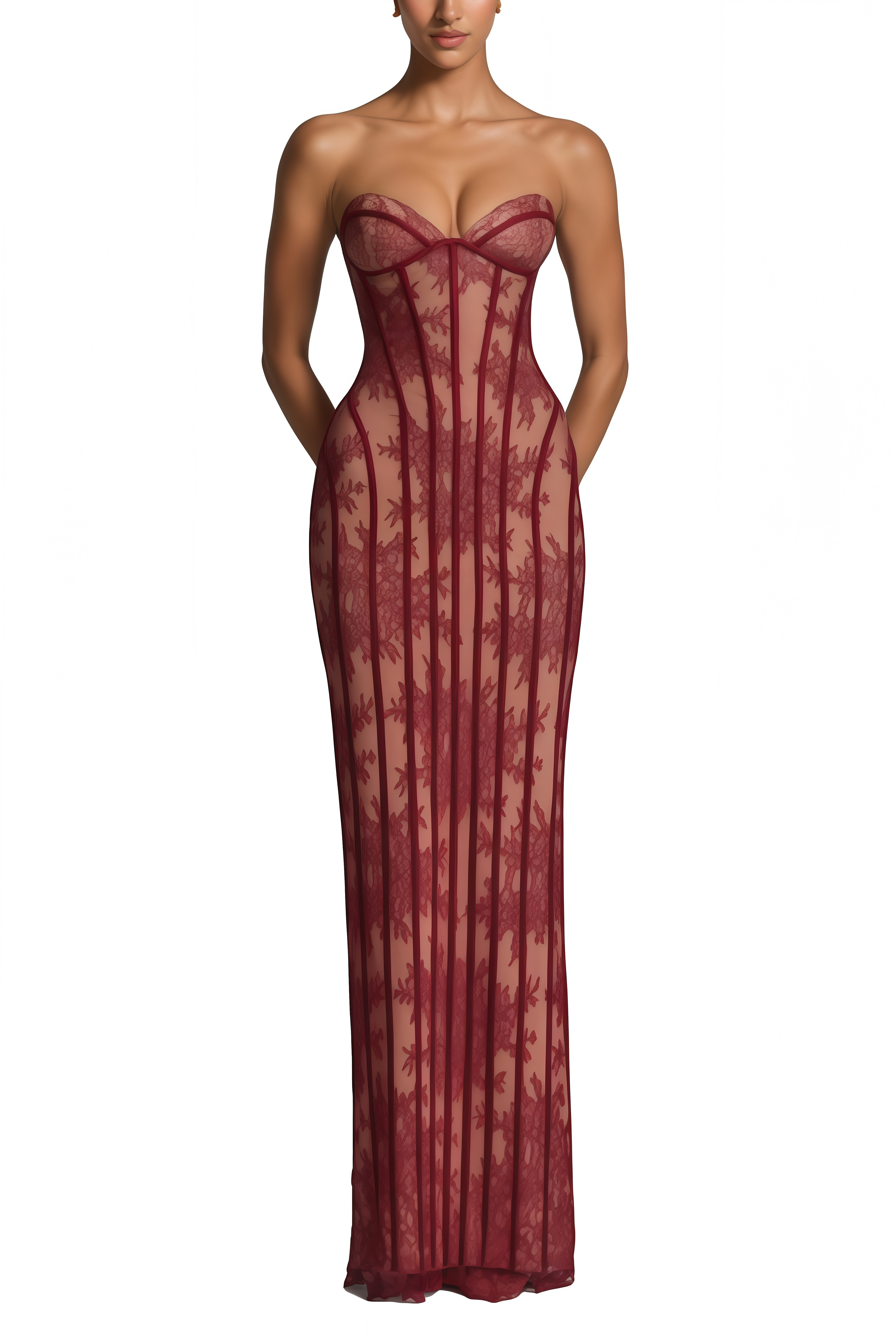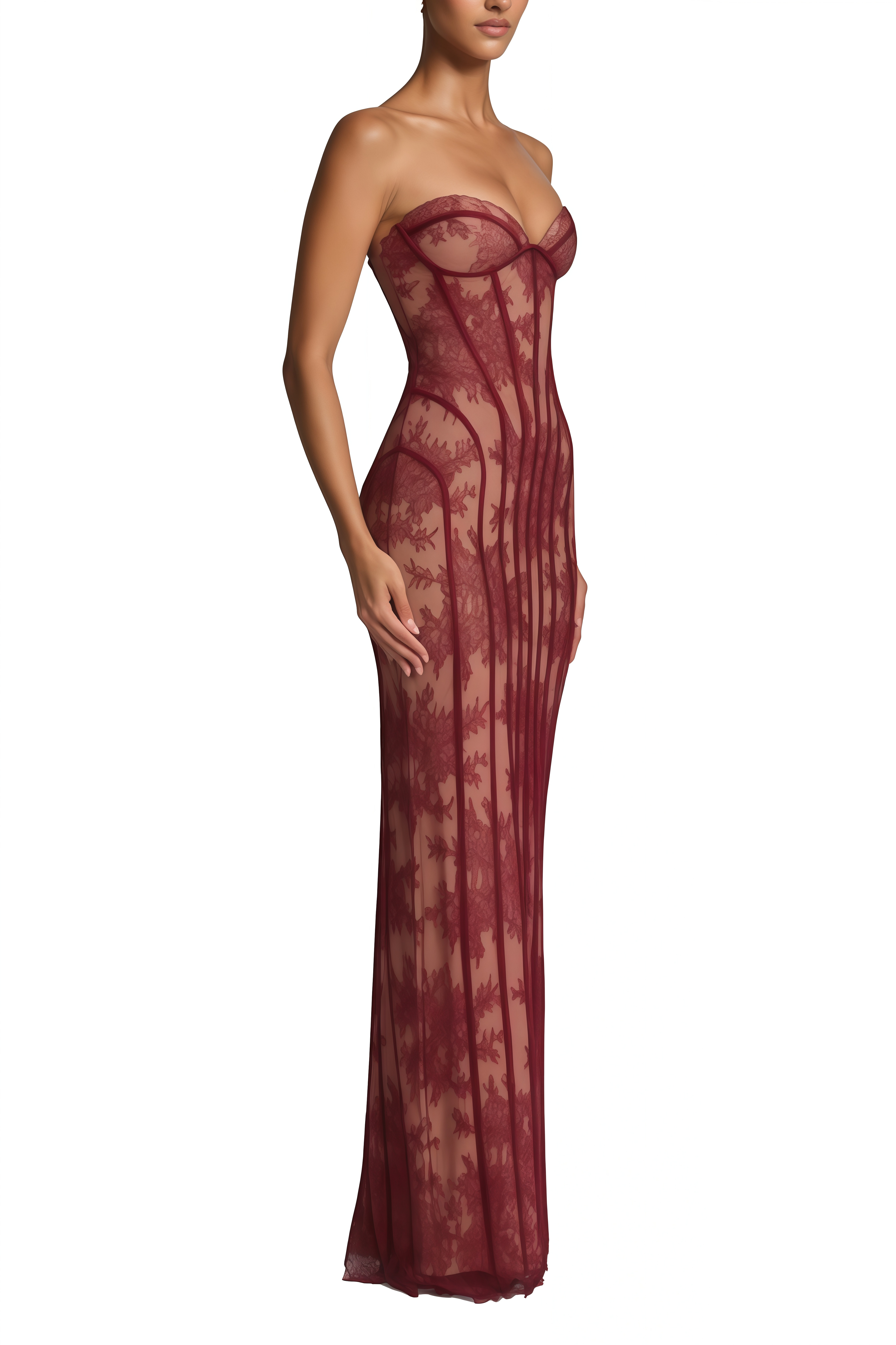 Introducing the Marcia Burgundy Floral Corset Maxi Dress, a must-have addition to your wardrobe. This sleeveless black dress features a sweetheart neckline that can be worn off the shoulder, elegant floral lace paneling, corset boning detailing, a rear lace-up fastening, a rear slit, and a fitted silhouette in a graceful maxi length. Elevate your style with this elegant and versatile piece.