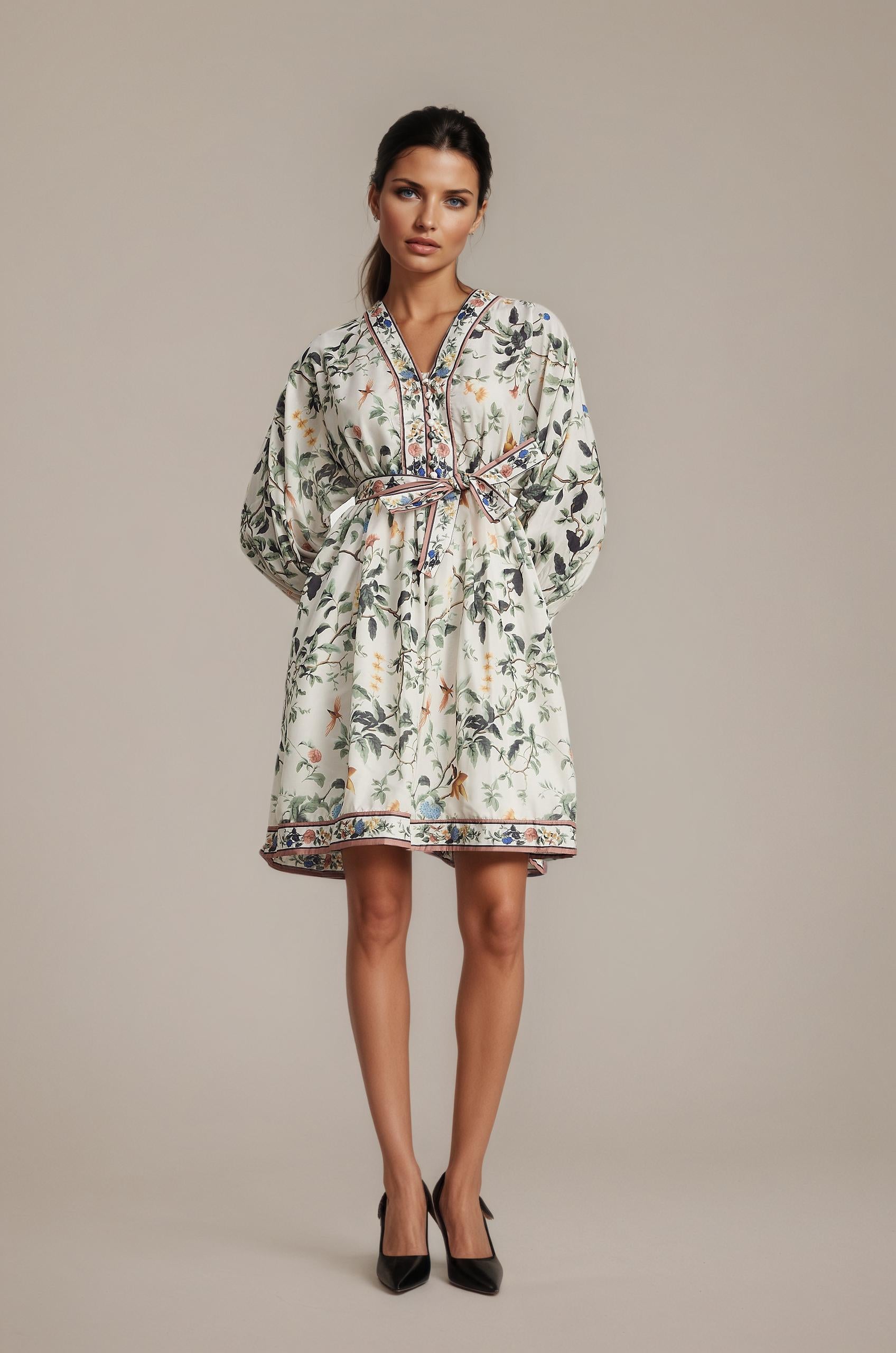 Introducing the Mathilde V-Neck Floral Print Mini Dress , a must-have addition to your wardrobe. This dress features a delicate floral print and elegant puff sleeves with elasticated cuffs. With its flattering V-neck and belted waist, it offers a perfect fit. Elevate your style with this elegant and versatile dress.