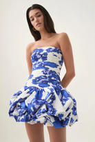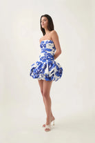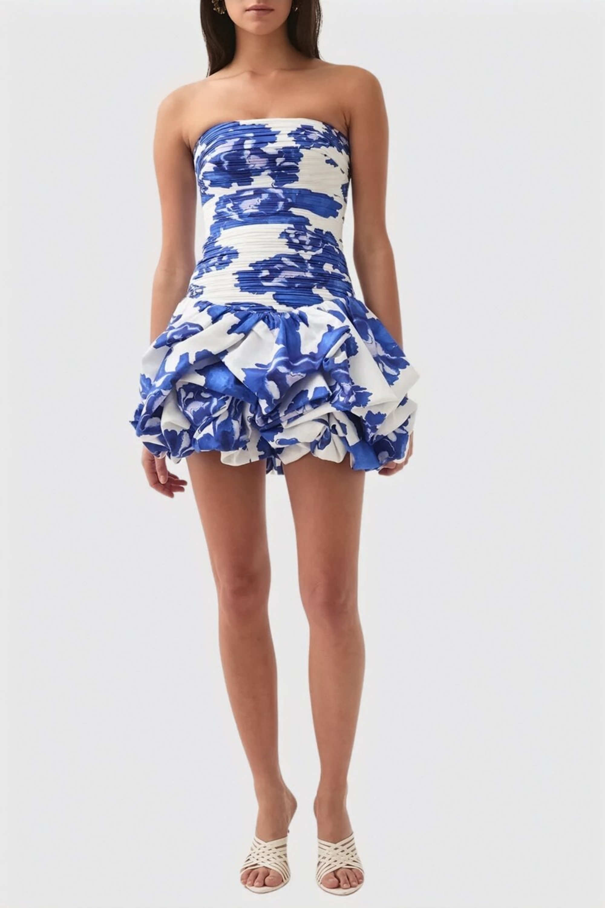 Introducing the Mélissa Blue Mini Dress With Bubble Hem, a must-have addition to your elegant wardrobe. This blue dress features a delicate floral print with sophisticated pleated detailing and a playful bubble hem. Designed with a boat neck and strapless sleeveless silhouette, its high waist and fitted waistline create a flattering shape. Complete with rear zip fastening, this mini-length piece combines romantic charm with contemporary design.
