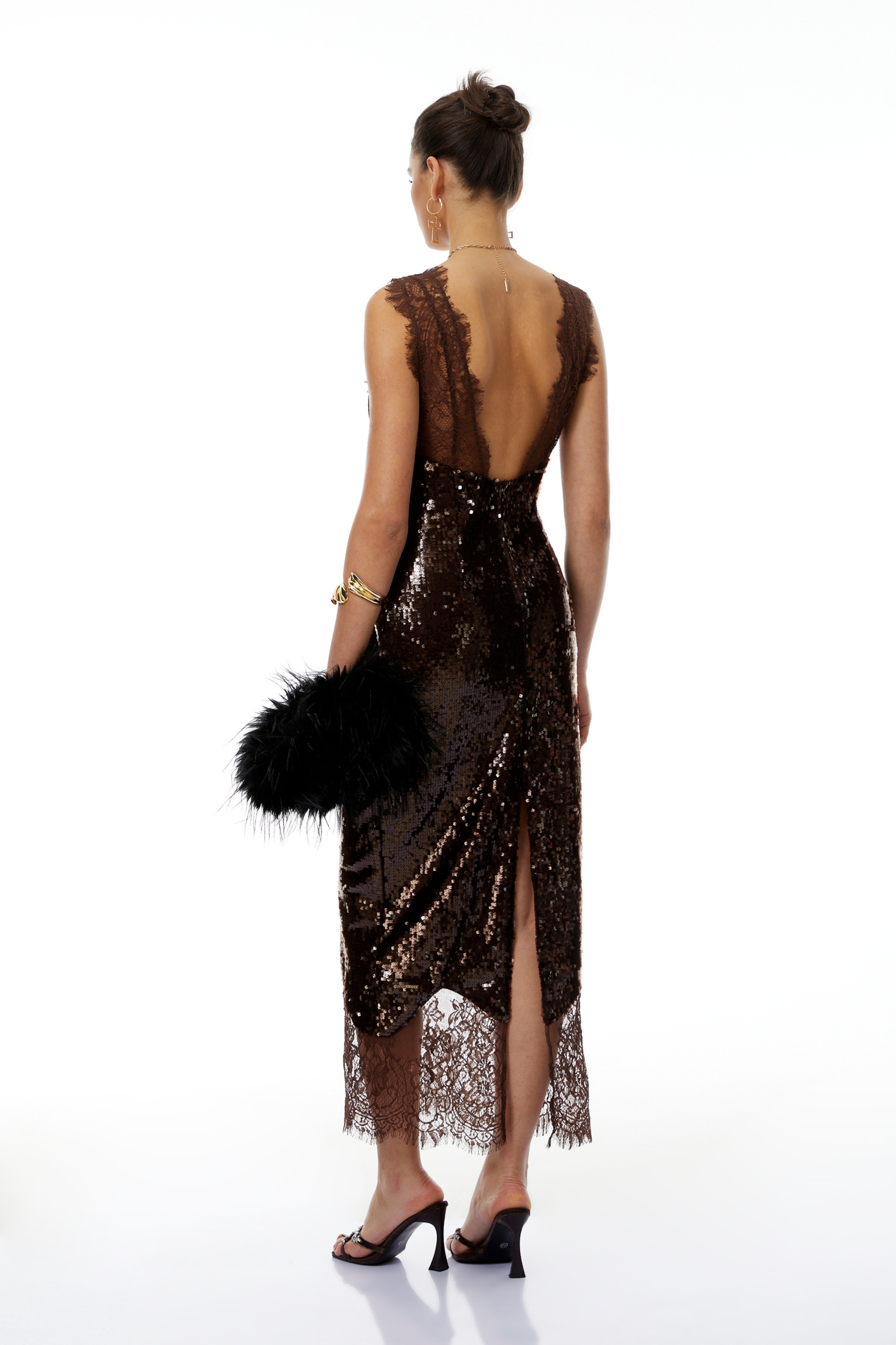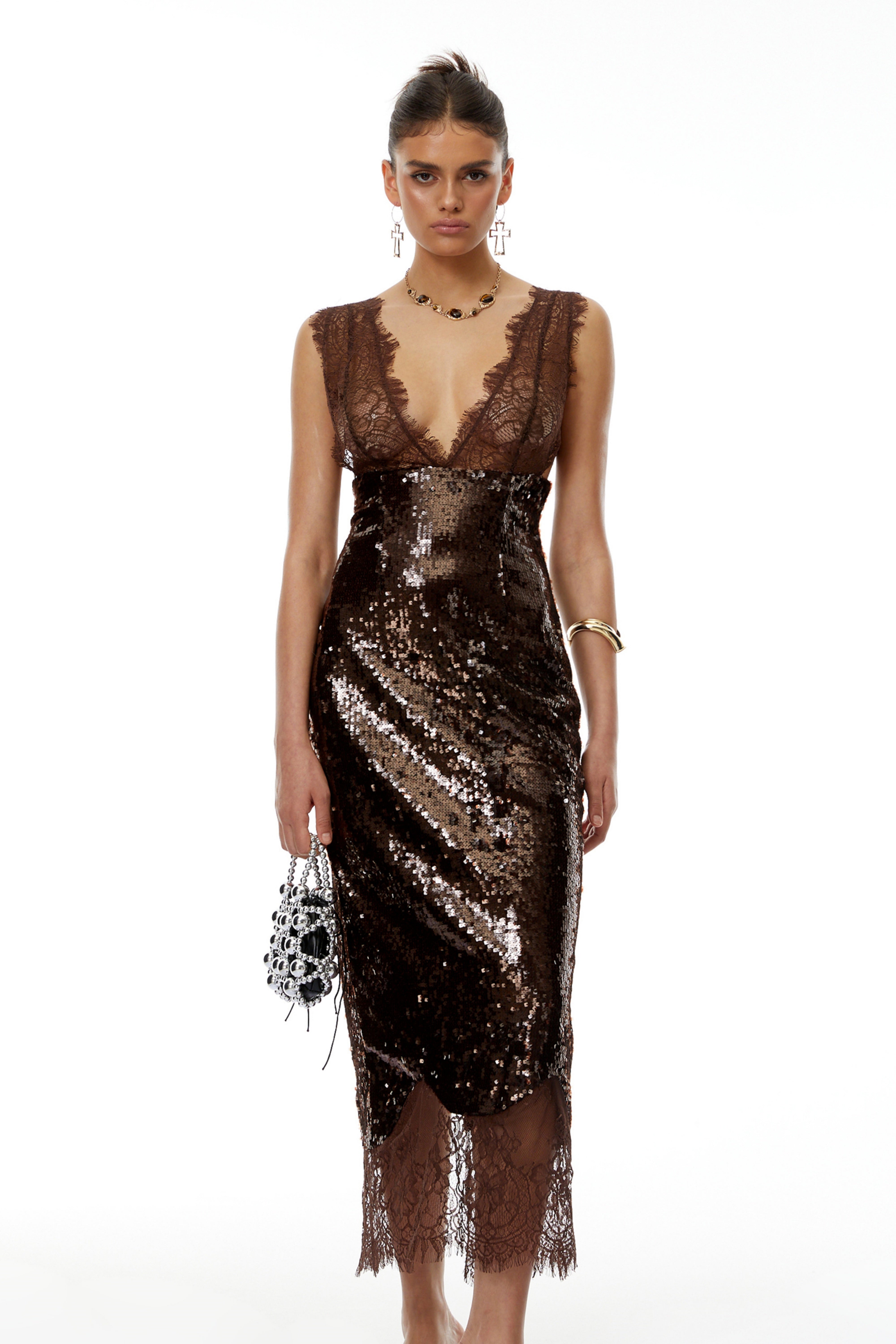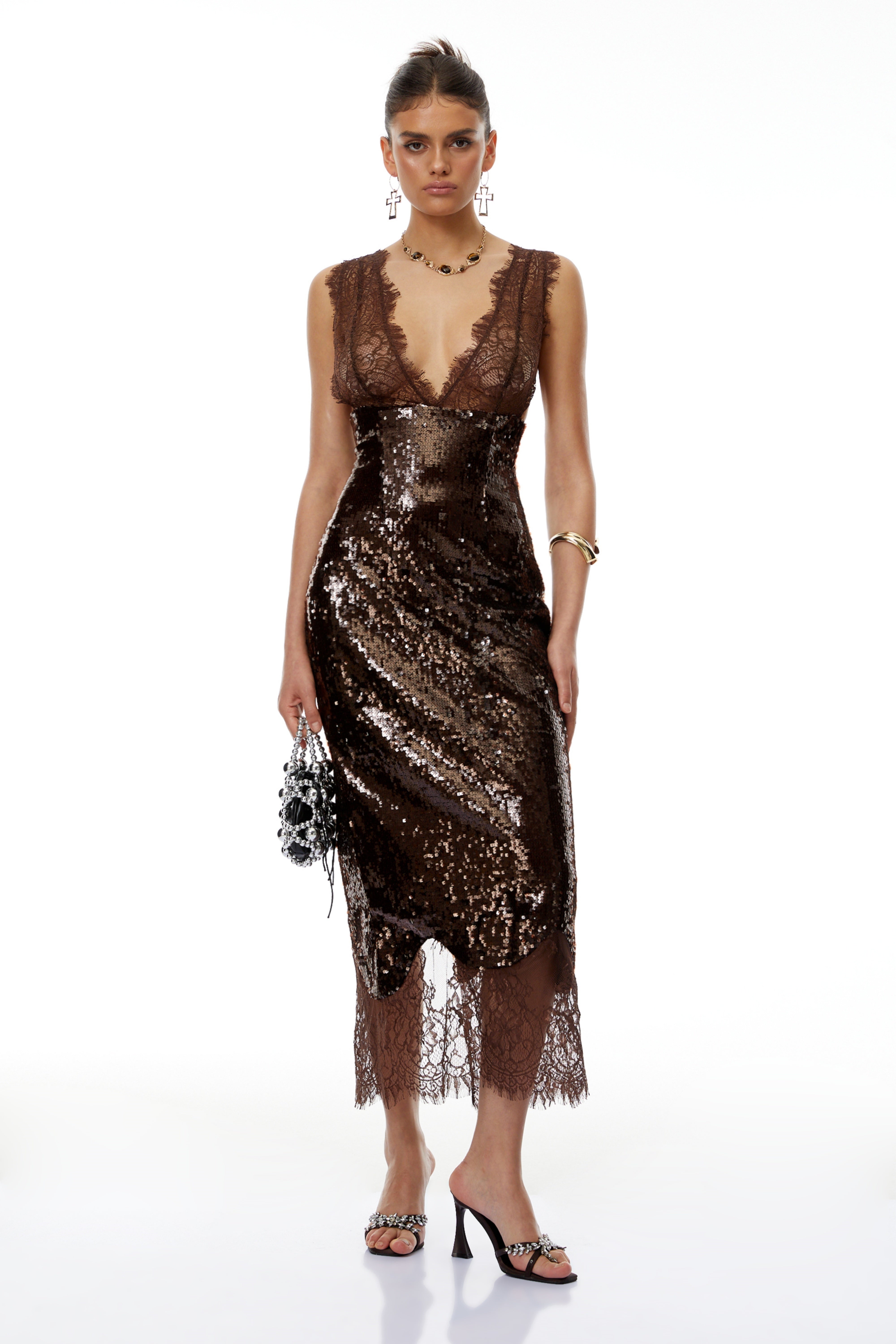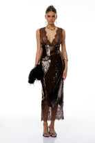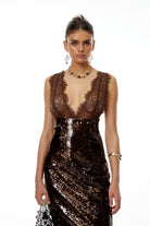 Agathe Brown Lace Panel Sequined Maxi Dress