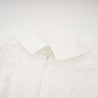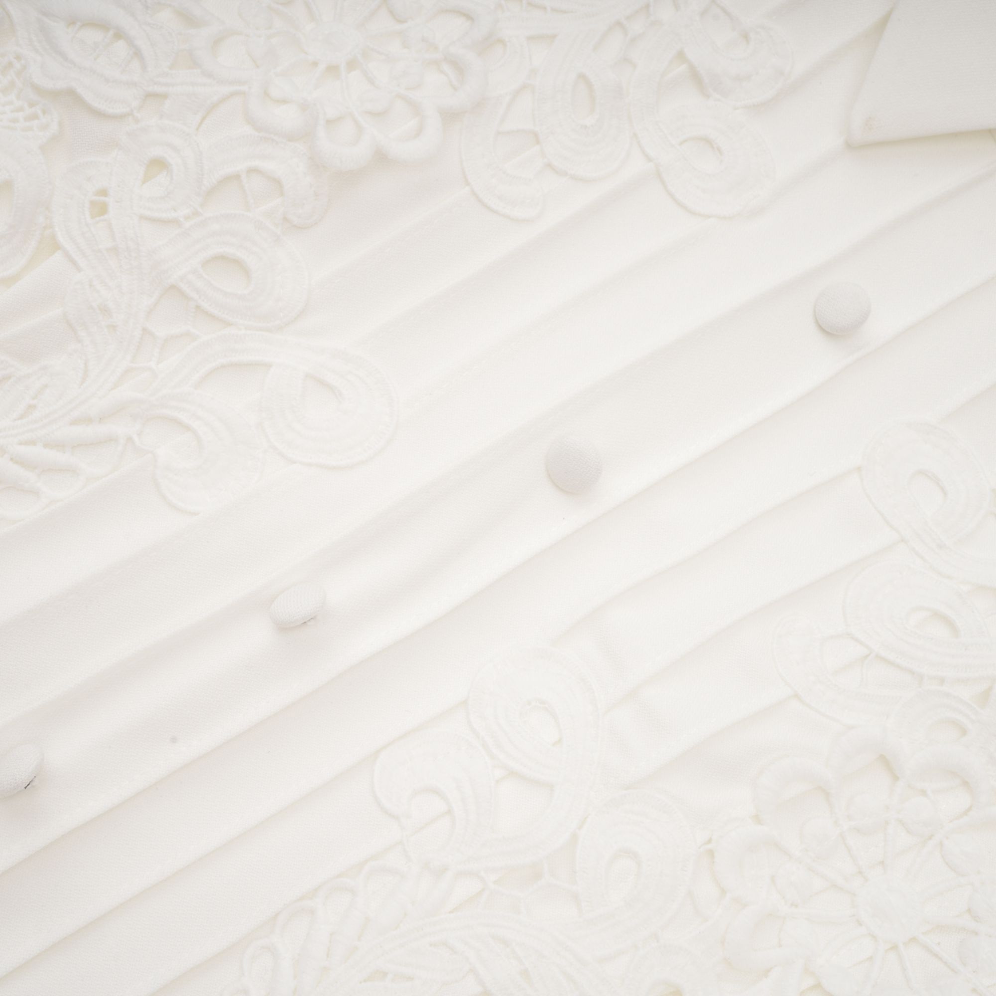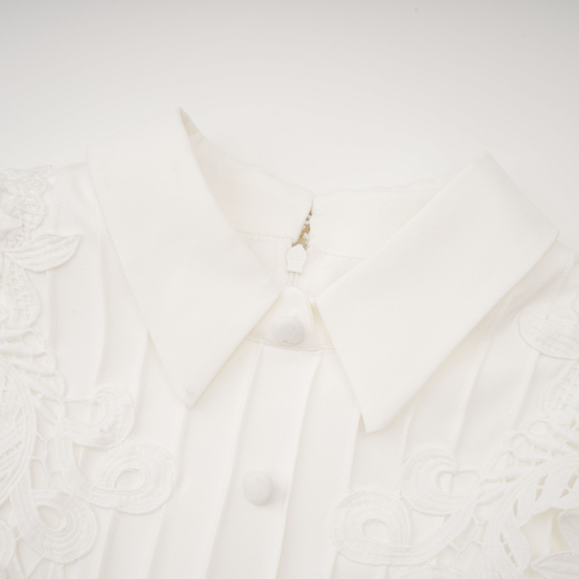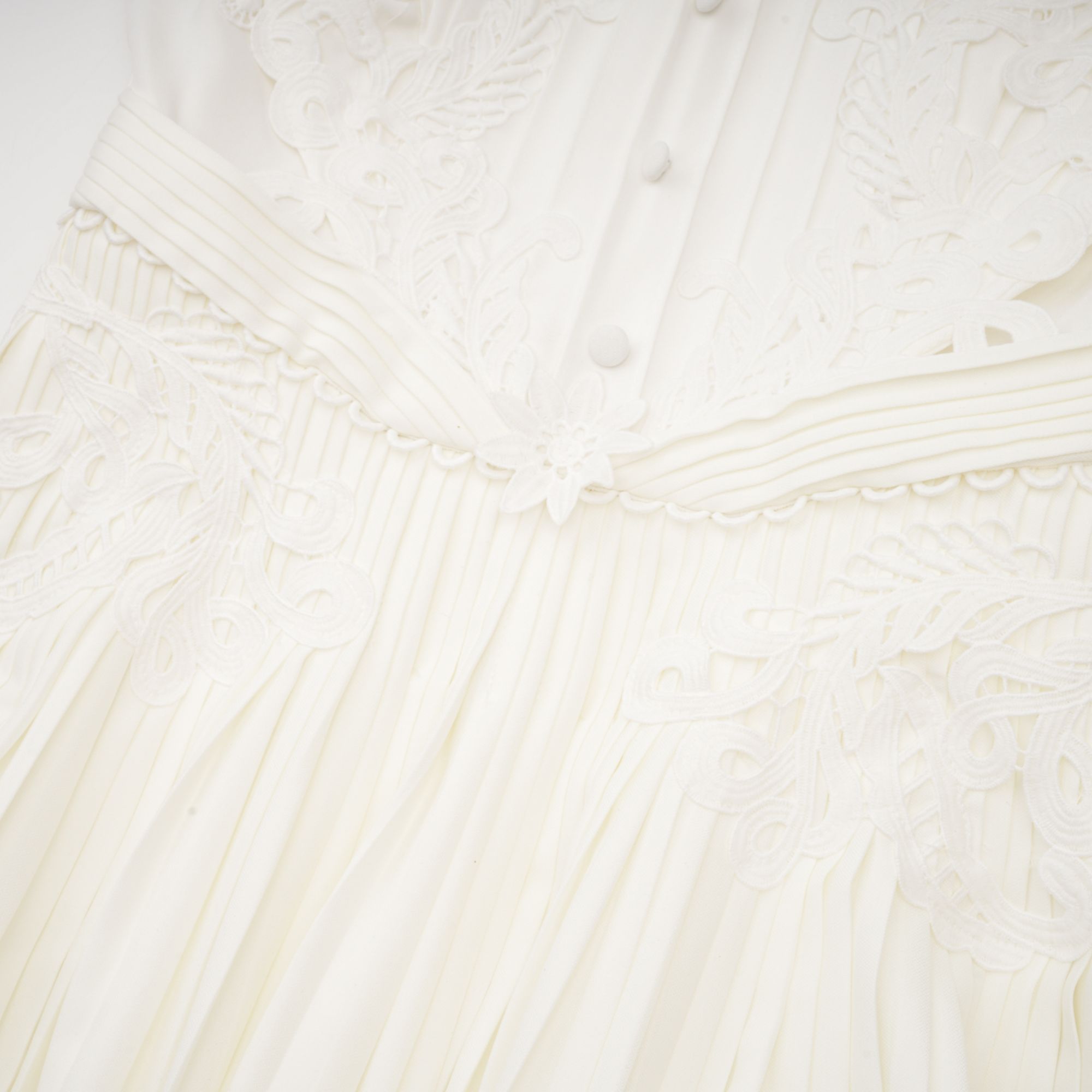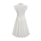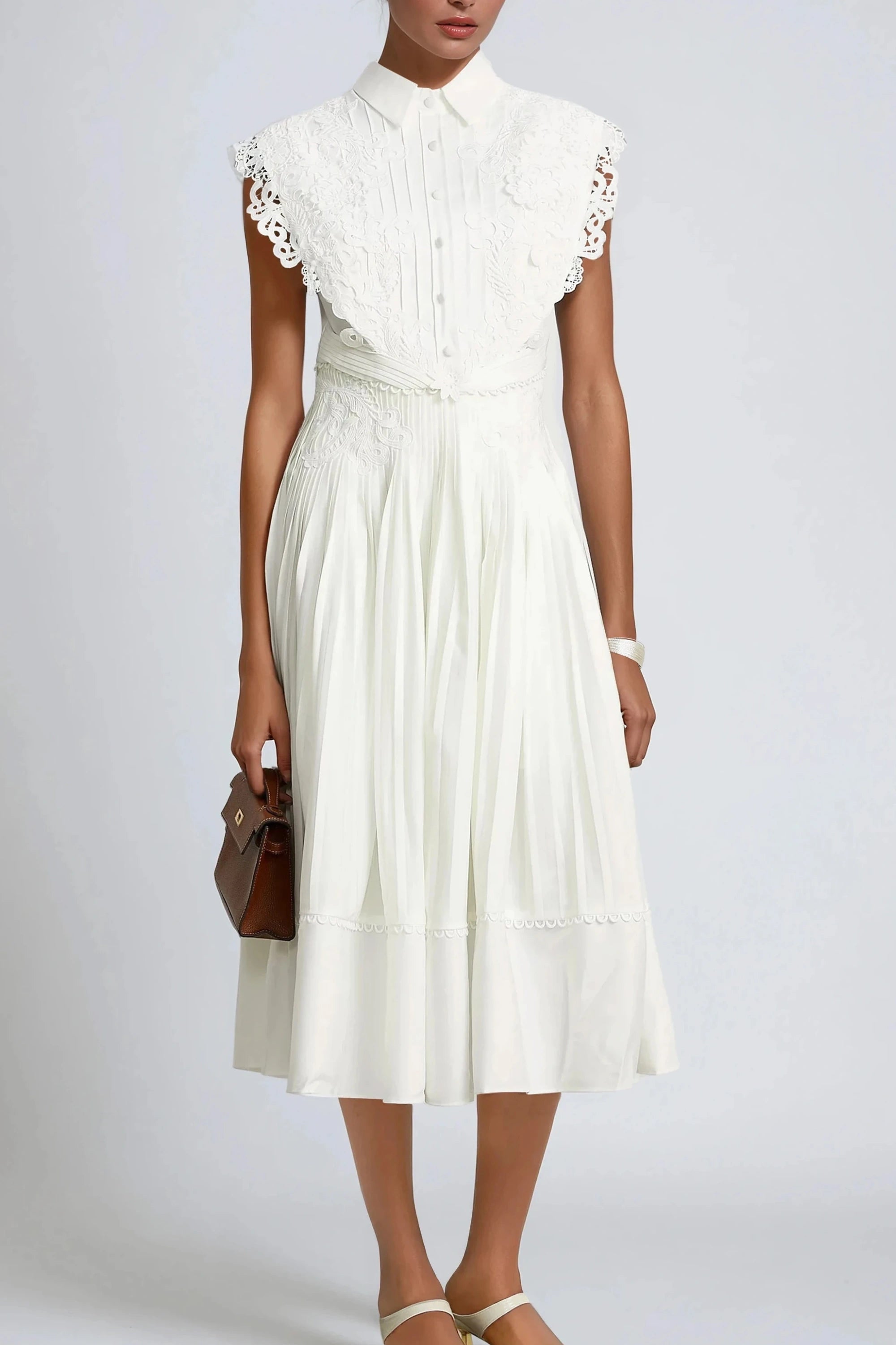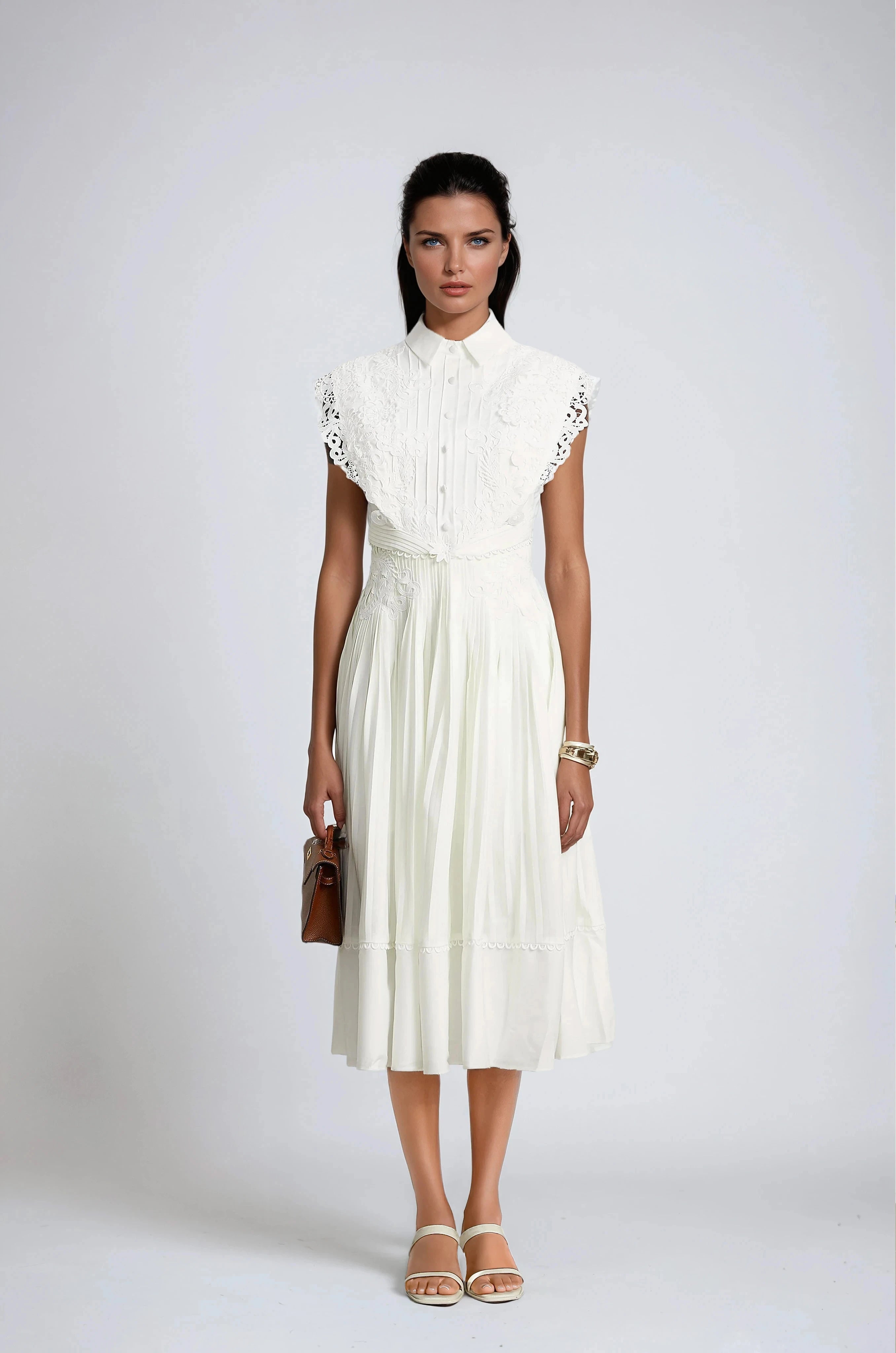 Introducing the Avalon Midi Dress With Lace And Pleated Details, a refined staple for your wardrobe. This dress showcases a classic collar, delicate flower motif, and elegant pleated design. Its sleeveless cut, front button fastening, and waist-tightened silhouette offer a tailored fit, while the midi length adds timeless grace.
