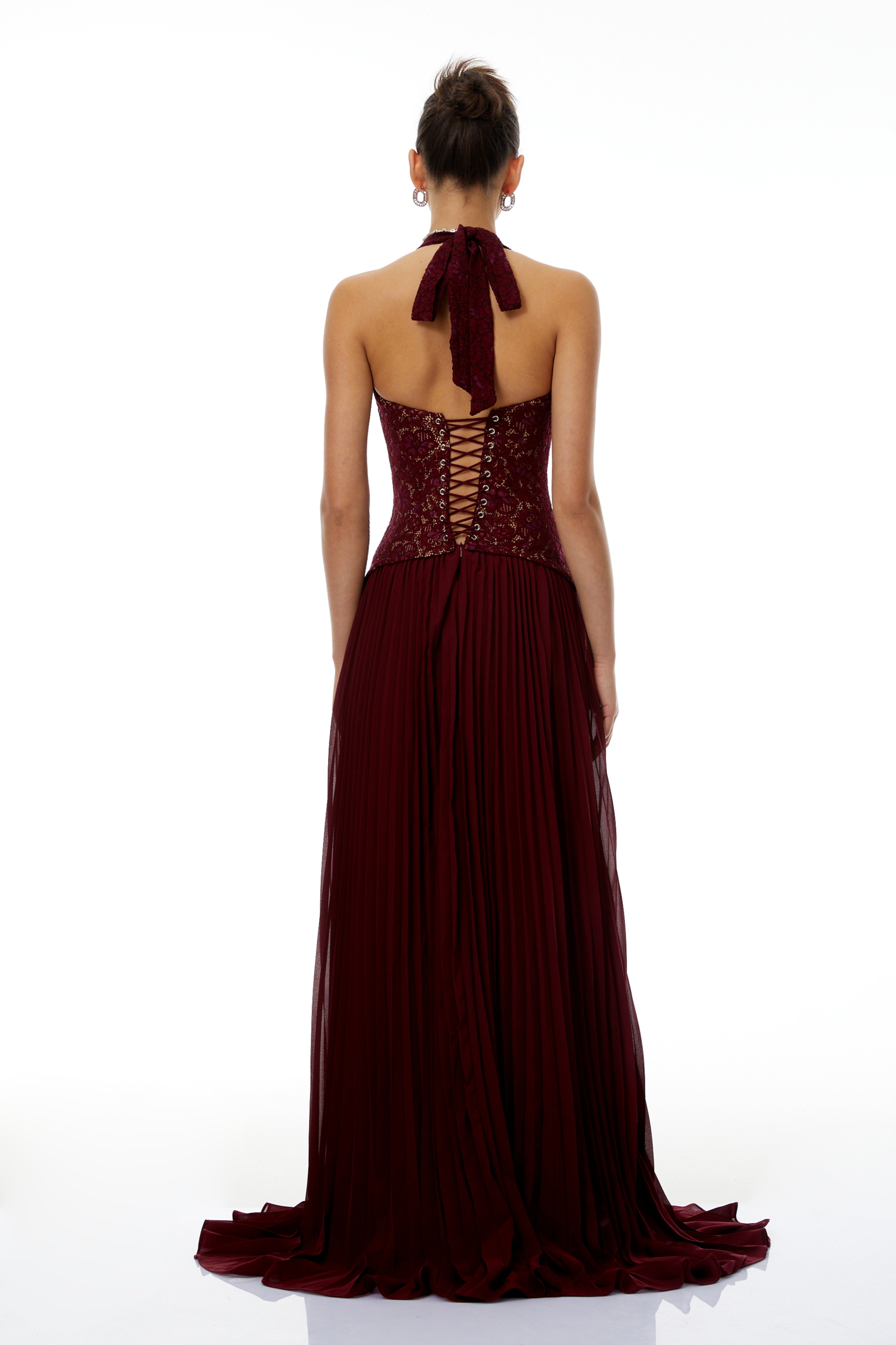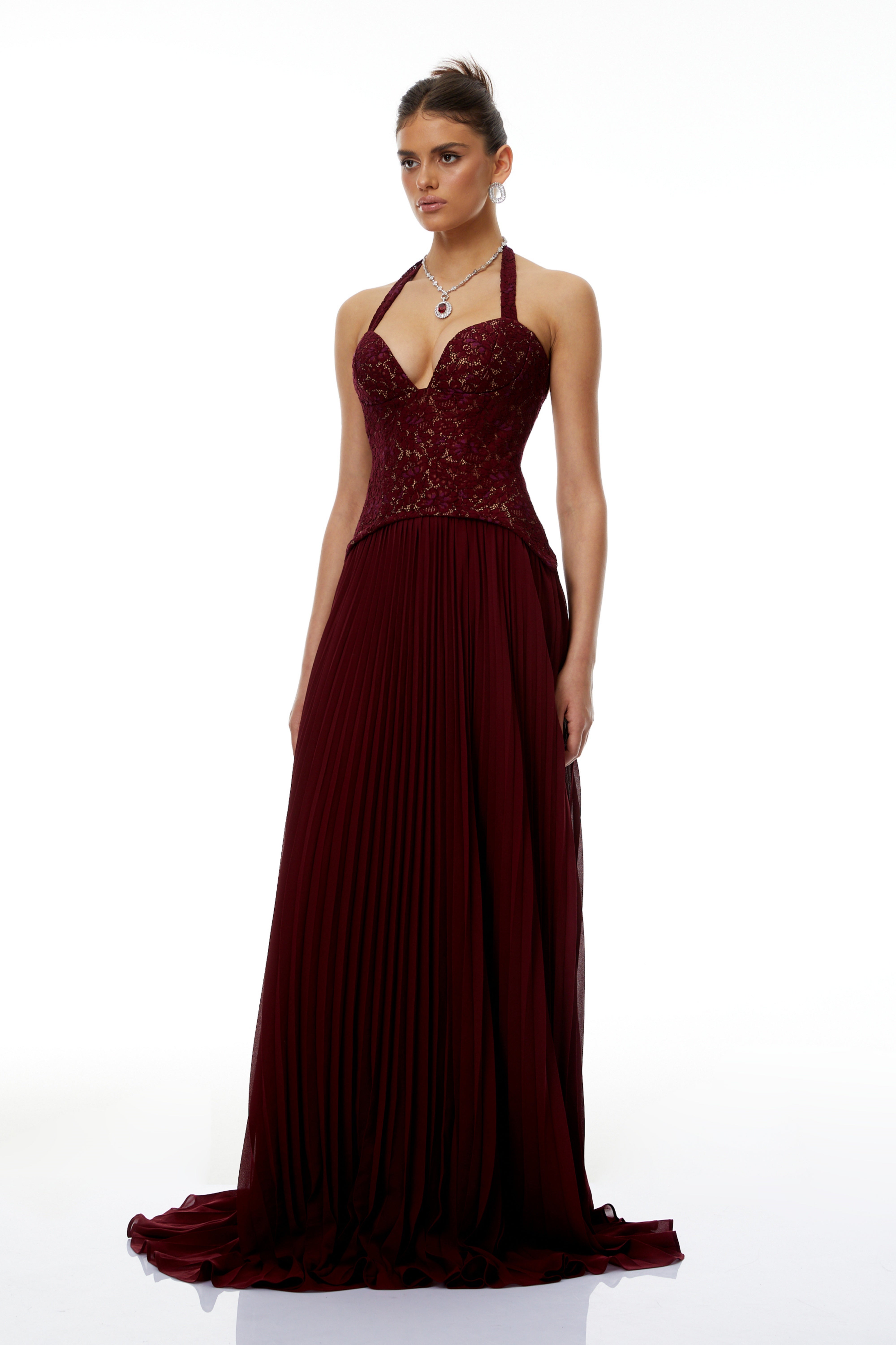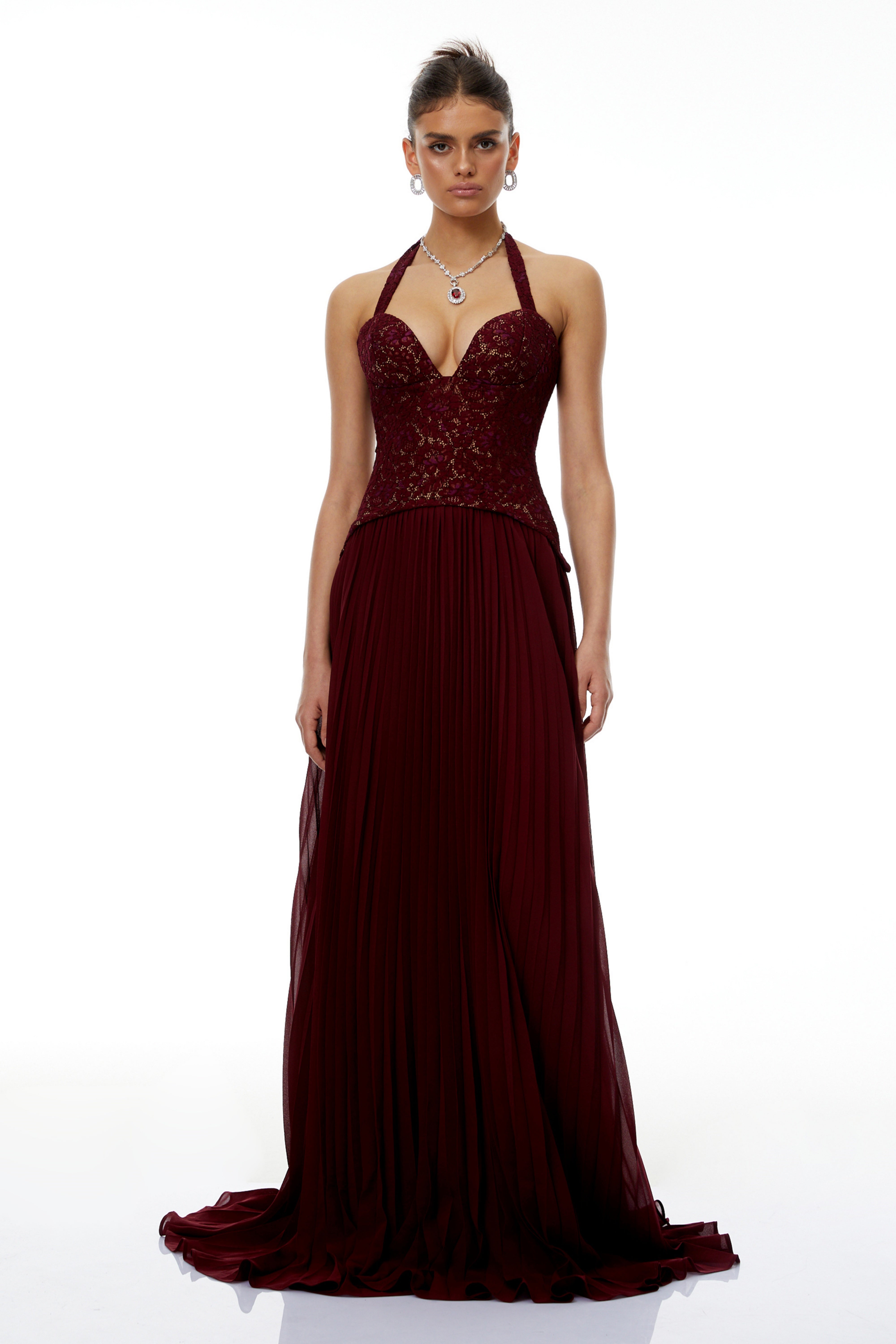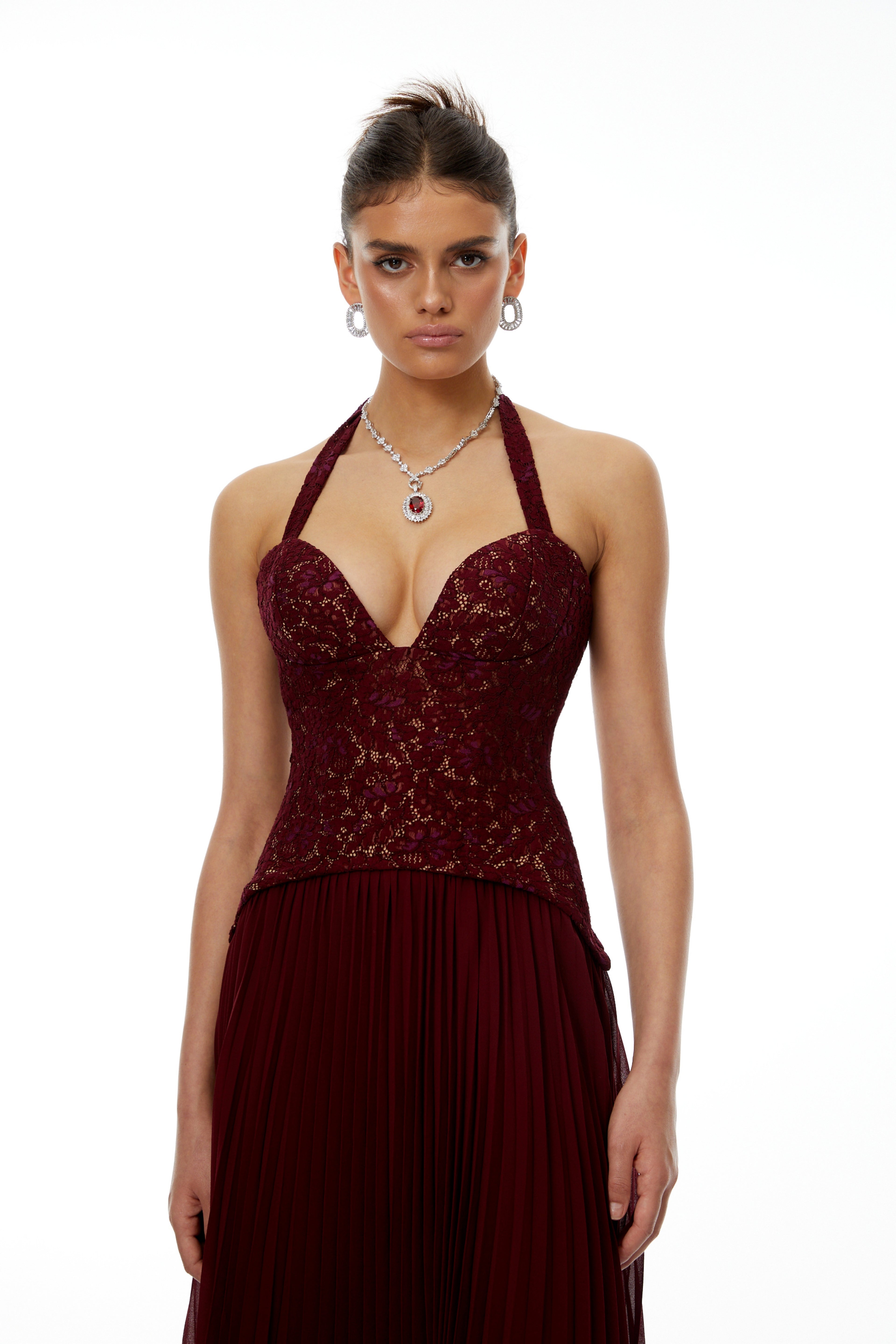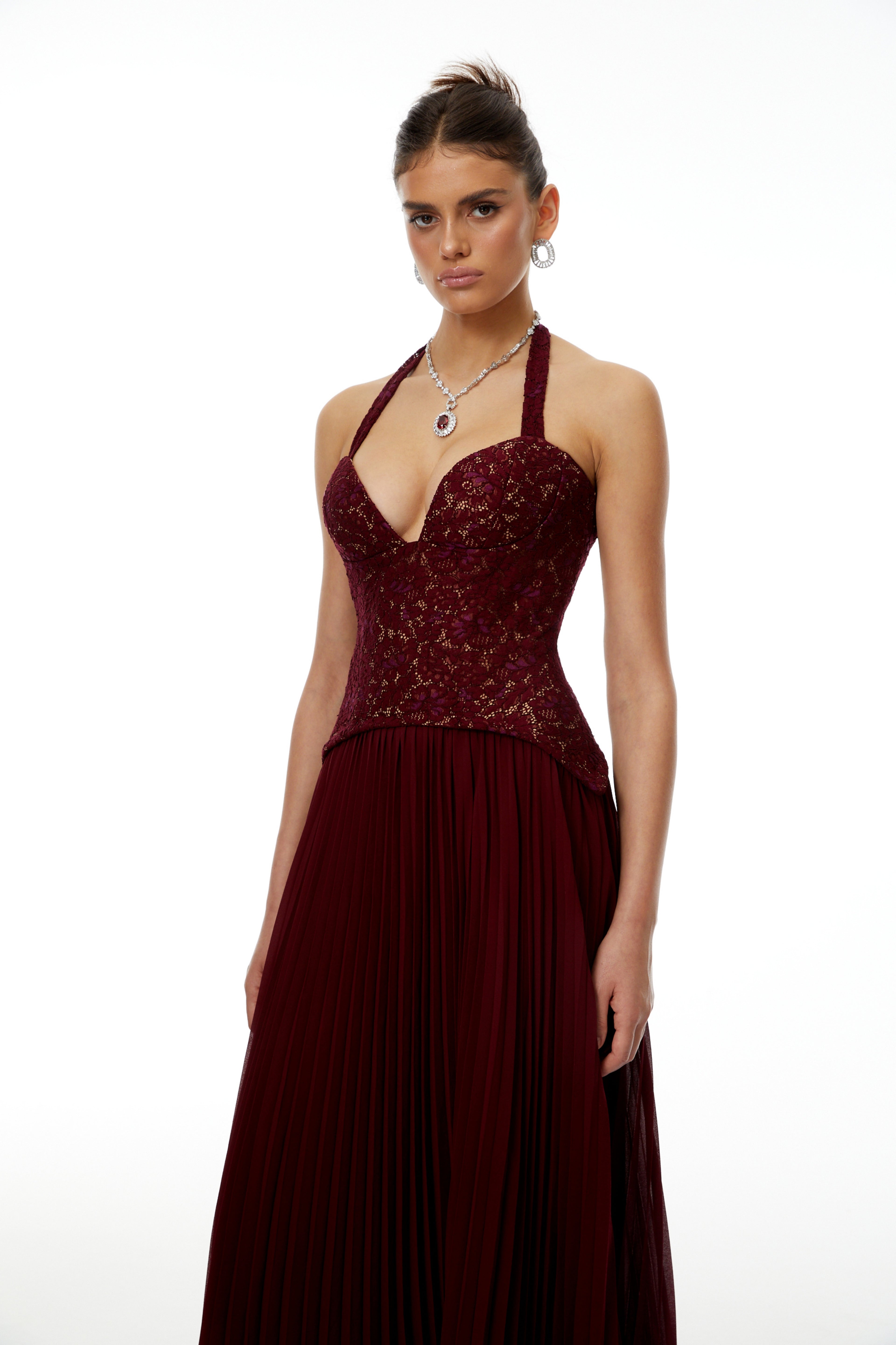 Elena Red Halter Neck Lace Maxi Dress