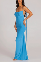 Introducing the Laverda Blue Open Back Ruched Maxi Dress, a must-have addition to your wardrobe. This elegant design features a sweetheart neckline with sleeveless spaghetti straps and an open back, enhanced by delicate ruched detailing. The fitted silhouette flows into a graceful maxi-length hem and is secured with adjustable self-tie fastening for a customized fit. Elevate your style with this sophisticated and versatile dress.