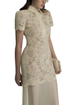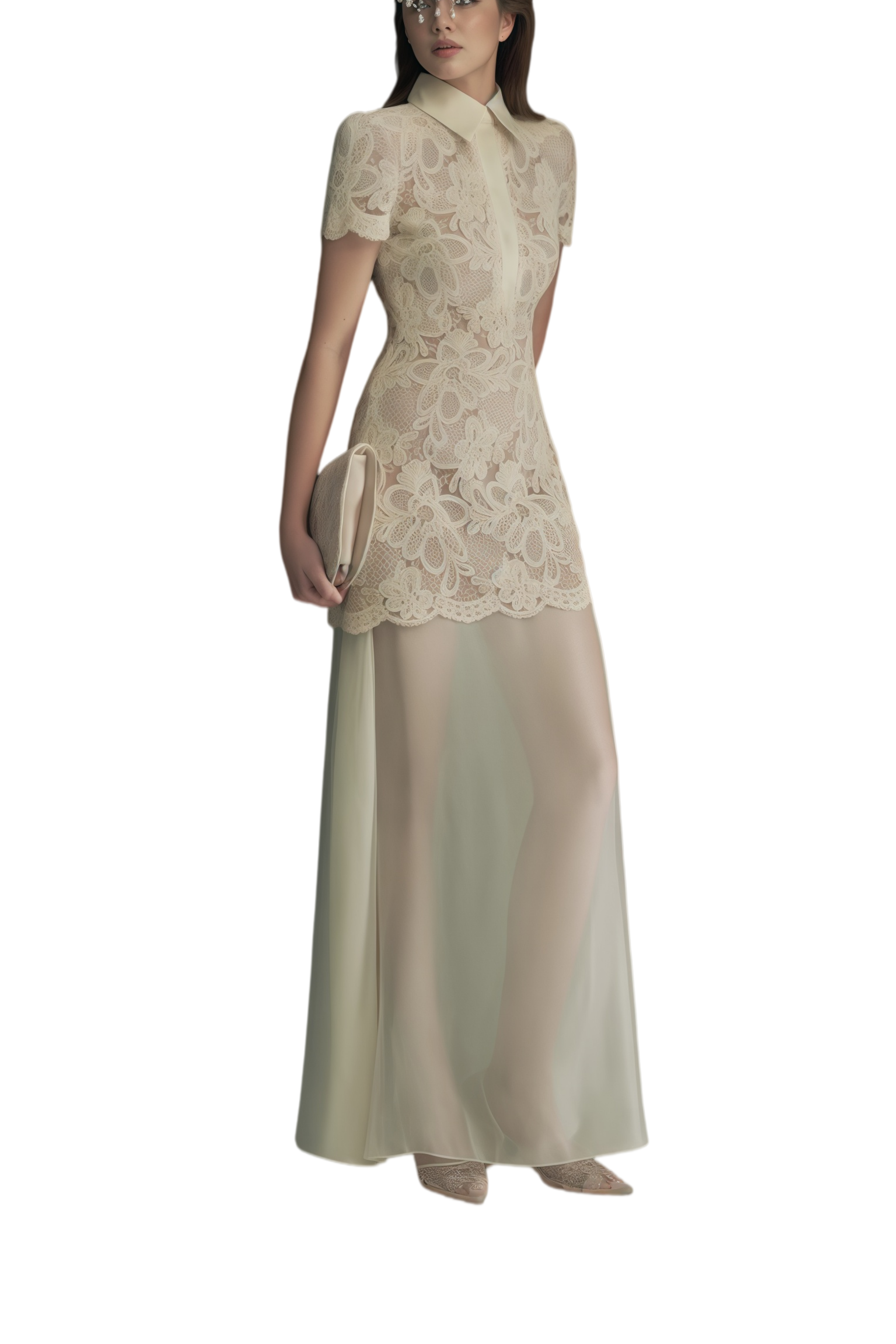 Introducing the Regina Neutral Lace Sheer Panel Maxi Dress, a must-have addition to your wardrobe. This elegant design features a polo collar with short sleeves, crafted from delicate floral lace and enhanced with sheer panel detailing. The gown flows into a graceful maxi-length silhouette and is secured with classic front button fastening. Elevate your style with this refined and versatile dress.