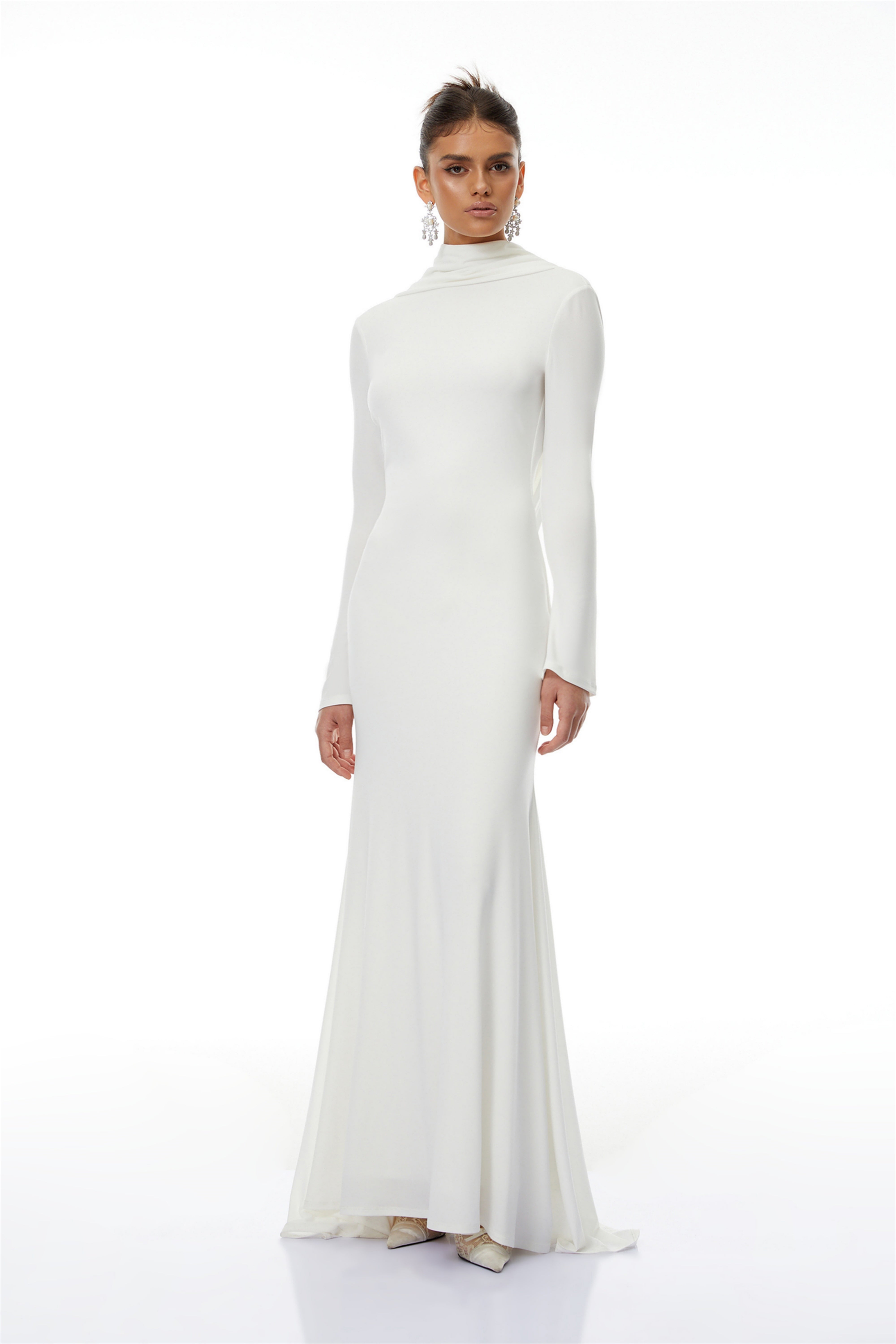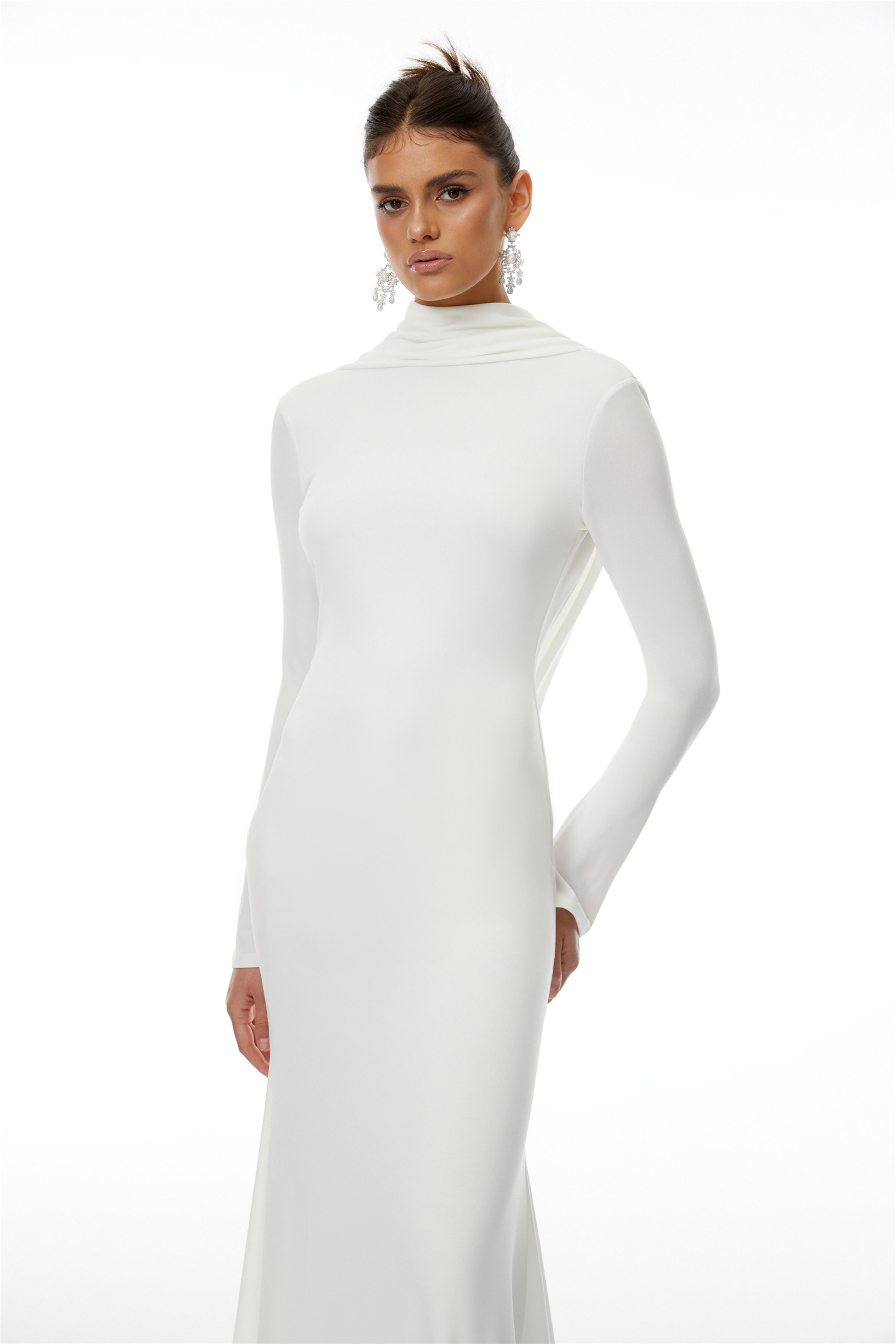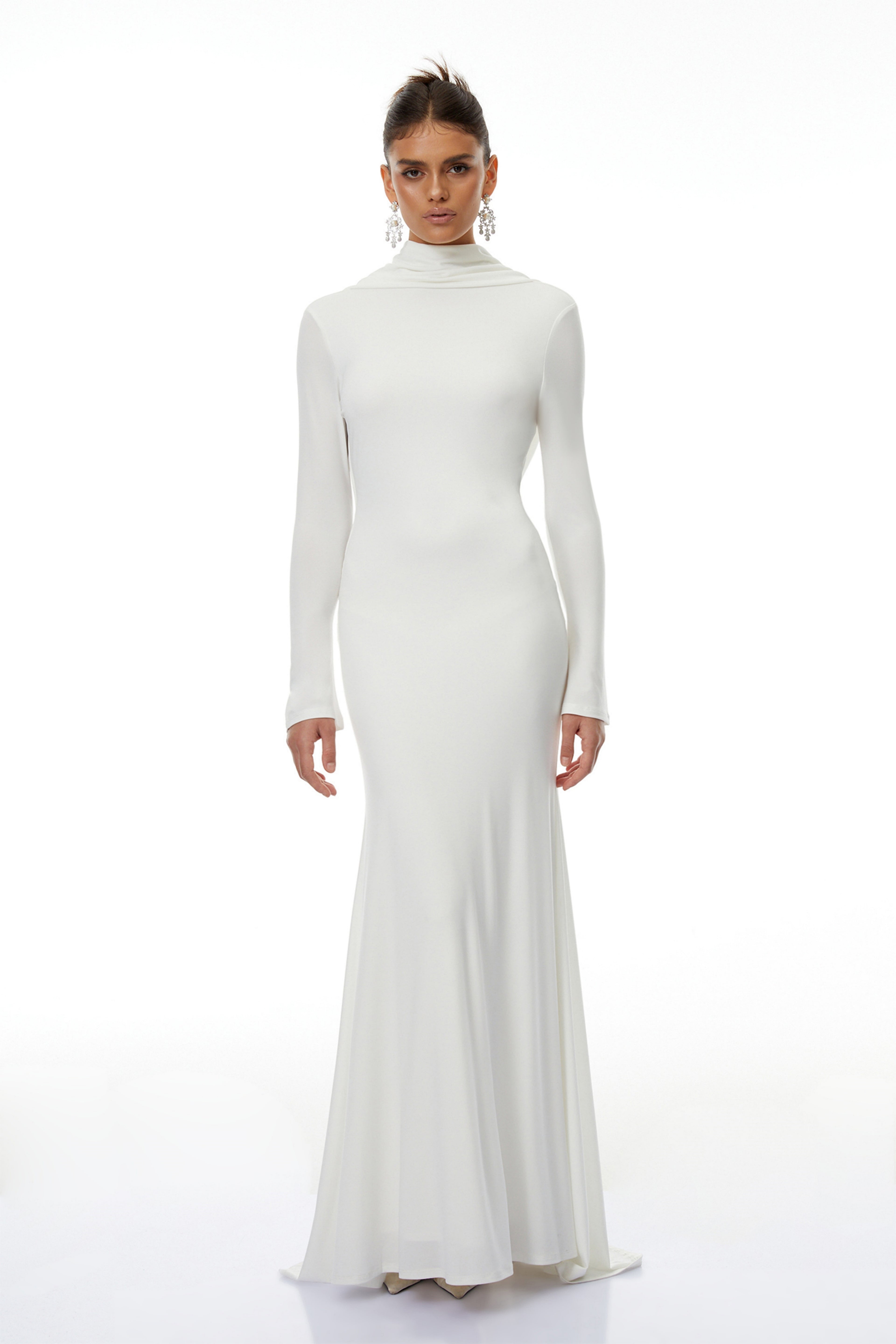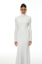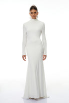 Introducing the Vanessa White Stretch Knit Open Back Maxi Dress, a must-have addition to your wardrobe. This dress features a soft stretch knit finish in a pure white hue, complete with a chic turtleneck and long sleeves. With its fitted waistline and striking open back design, it offers a comfortable and flattering fit. Elevate your style with this elegant maxi-length dress, finished with a graceful train design.