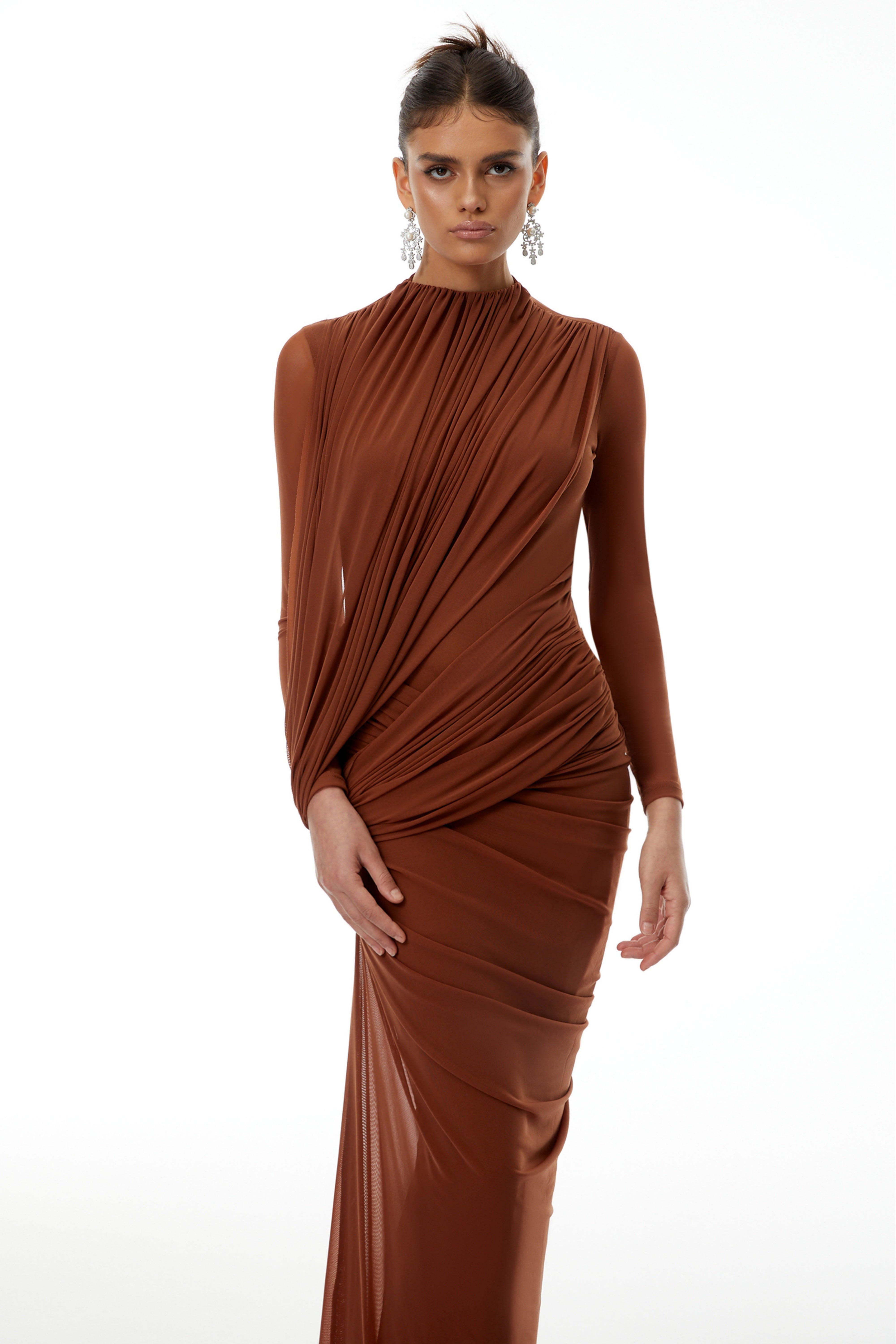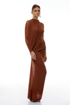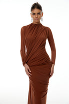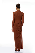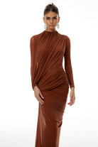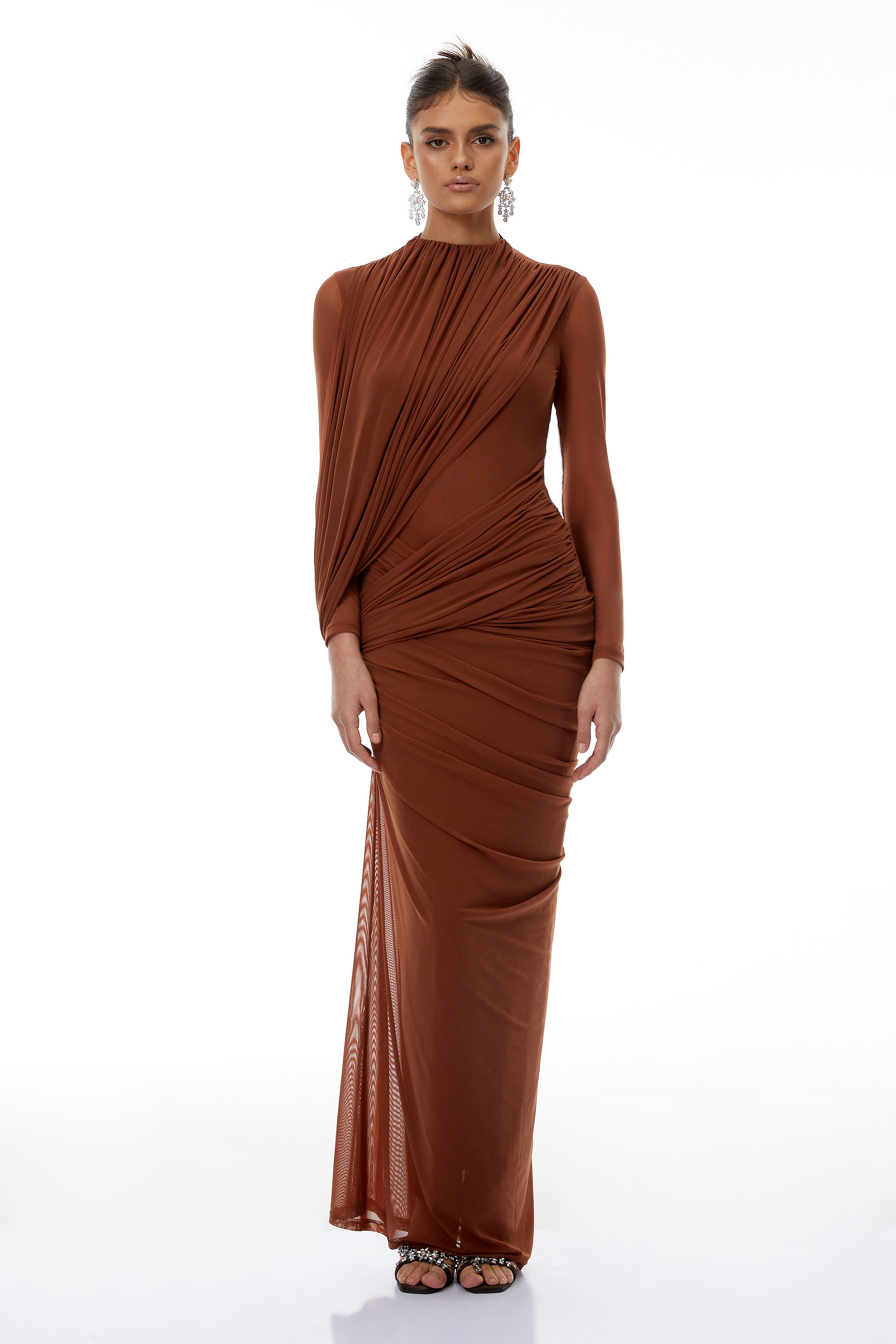 Veronica Brown Mesh Ruched Maxi Dress