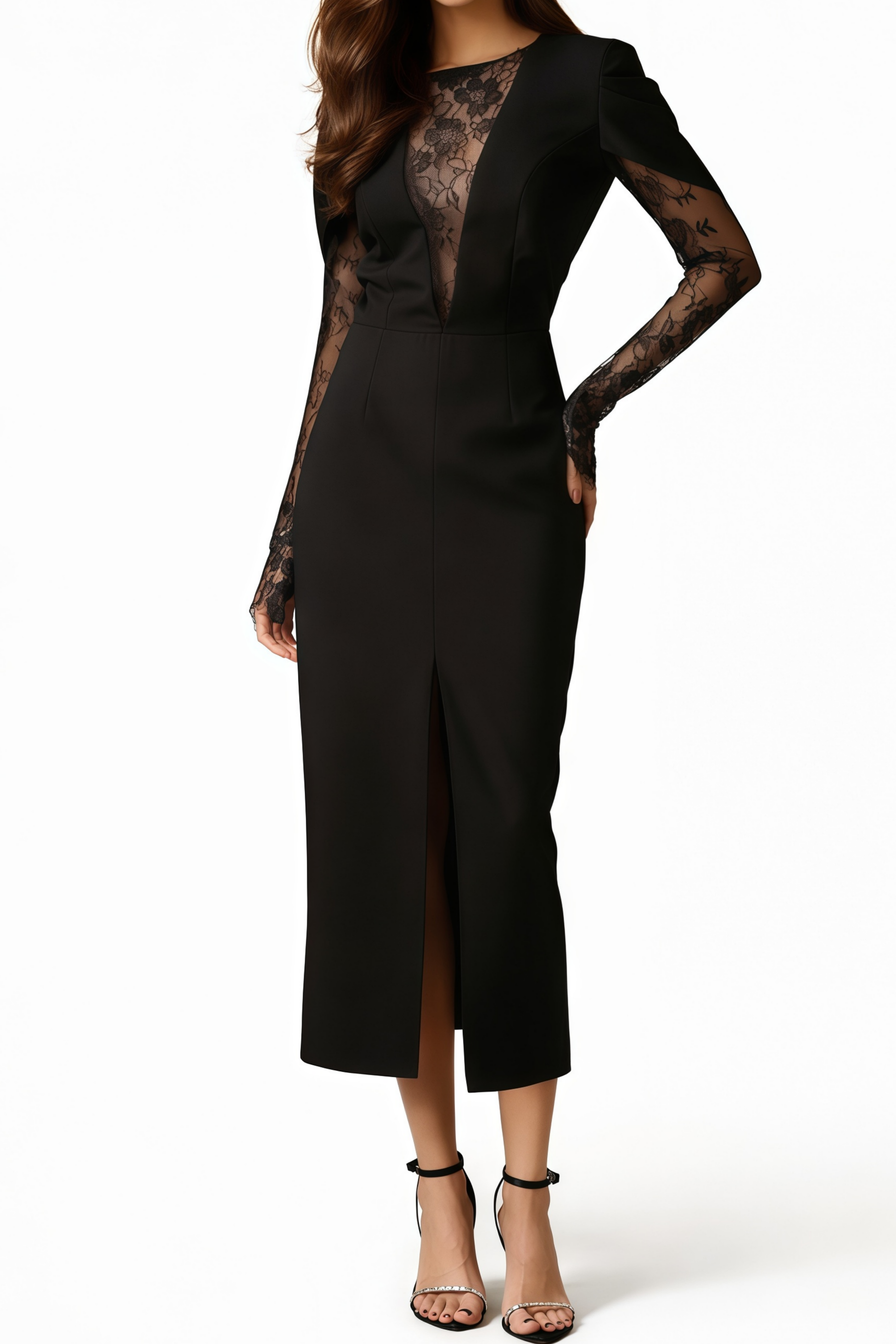 Constance Black High Slit Lace Panel Midi Dress