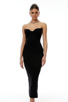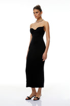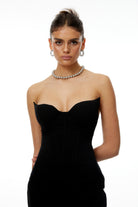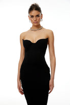 Introducing the Devon Black Off Shoulder Corset Midi Dress, a must-have addition to your wardrobe. This dress features a classic black hue, an off-shoulder neckline and sleeveless styling. With its open back, rear zip fastening and corset style, it offers a sculpted fit. A midi length and fitted silhouette complete the look. Elevate your style with this elegant and versatile dress.