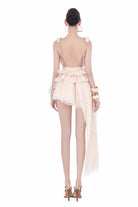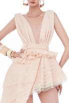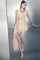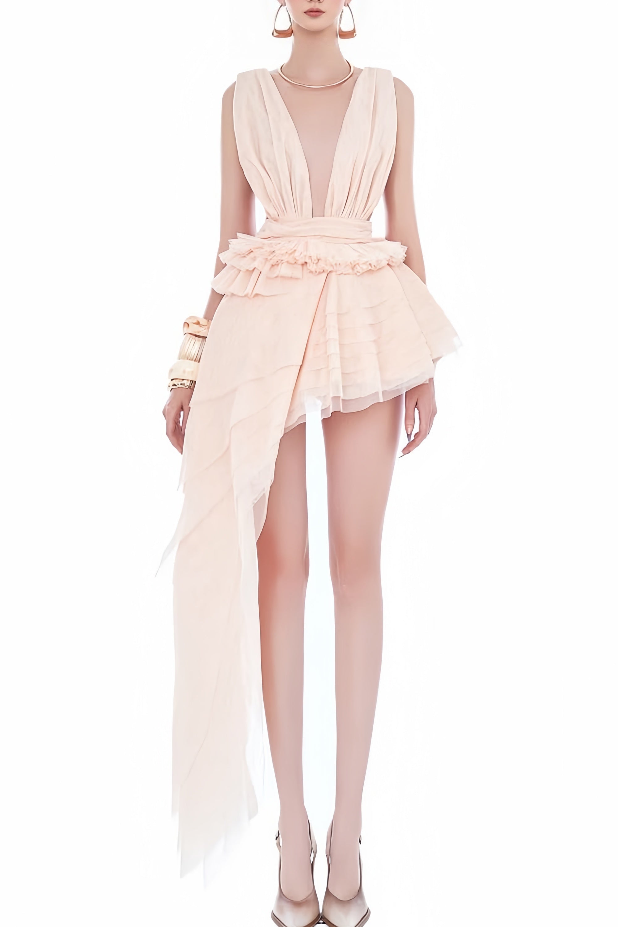 Isoline Neutral-Tone Asymmetric Mini Dress With Ribbon Detail
