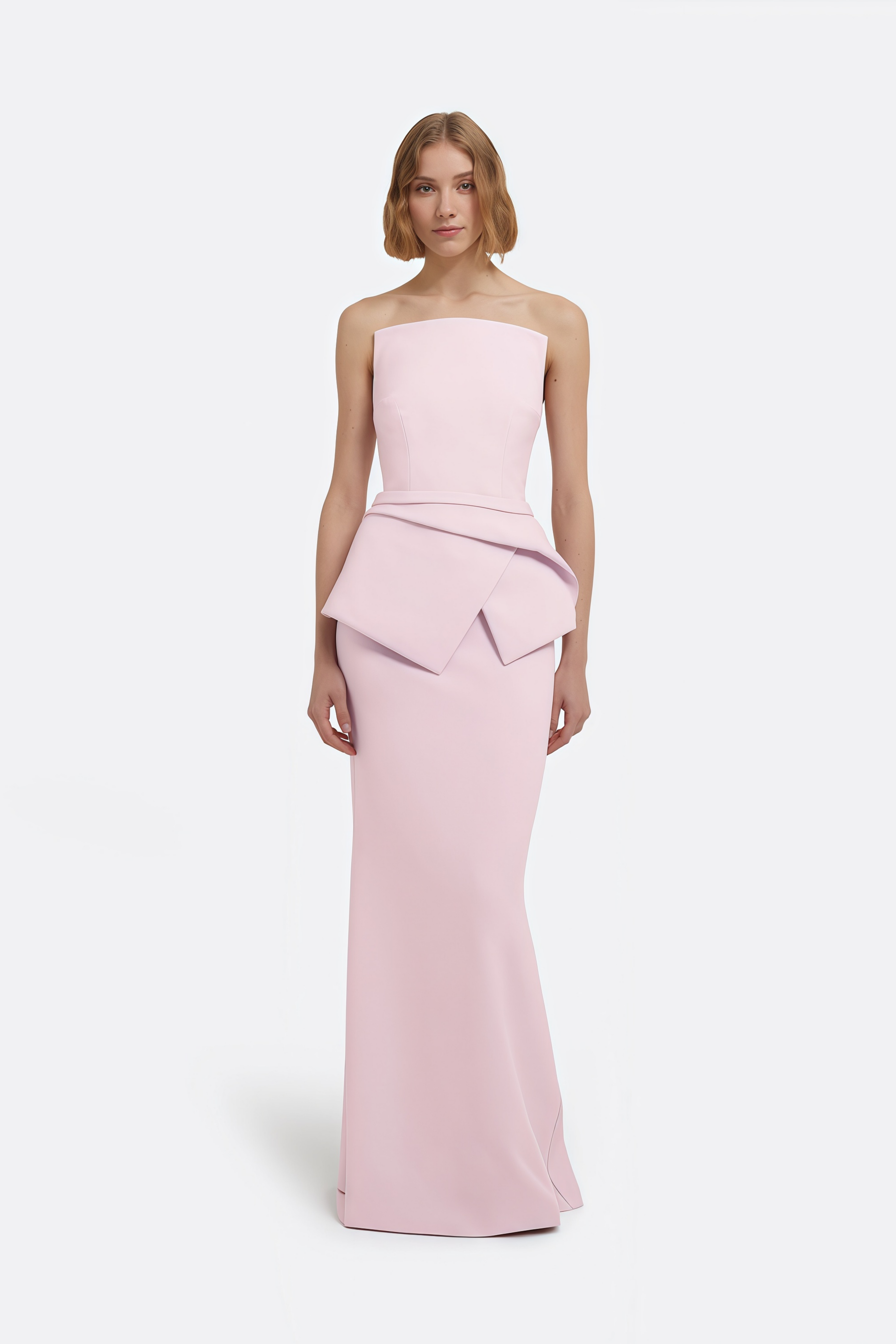 Introducing the Daphne Pink Strapless Asymmetric Peplum Maxi Dress, a must-have addition to your wardrobe. This sleeveless design combines an off-the-shoulder strapless neckline with a striking asymmetric peplum waist. The dress extends into a dramatic mermaid hem that flows into a graceful floor-length silhouette, secured with discreet rear zip fastening for a seamless fit. Elevate your style with this elegant and versatile dress.