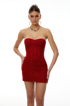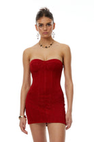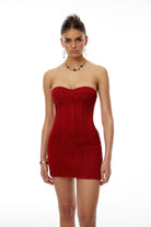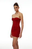 Introducing the Hunter Red Off Shoulder Lace Up Mini Dress, a must-have addition to your wardrobe. This dress features a vibrant red hue, an off-shoulder neckline and sleeveless styling. With its open back, rear lace up fastening and boned bodice, it offers a sculpted fit. A fitted silhouette and mini length complete the look. Elevate your style with this elegant and versatile dress.