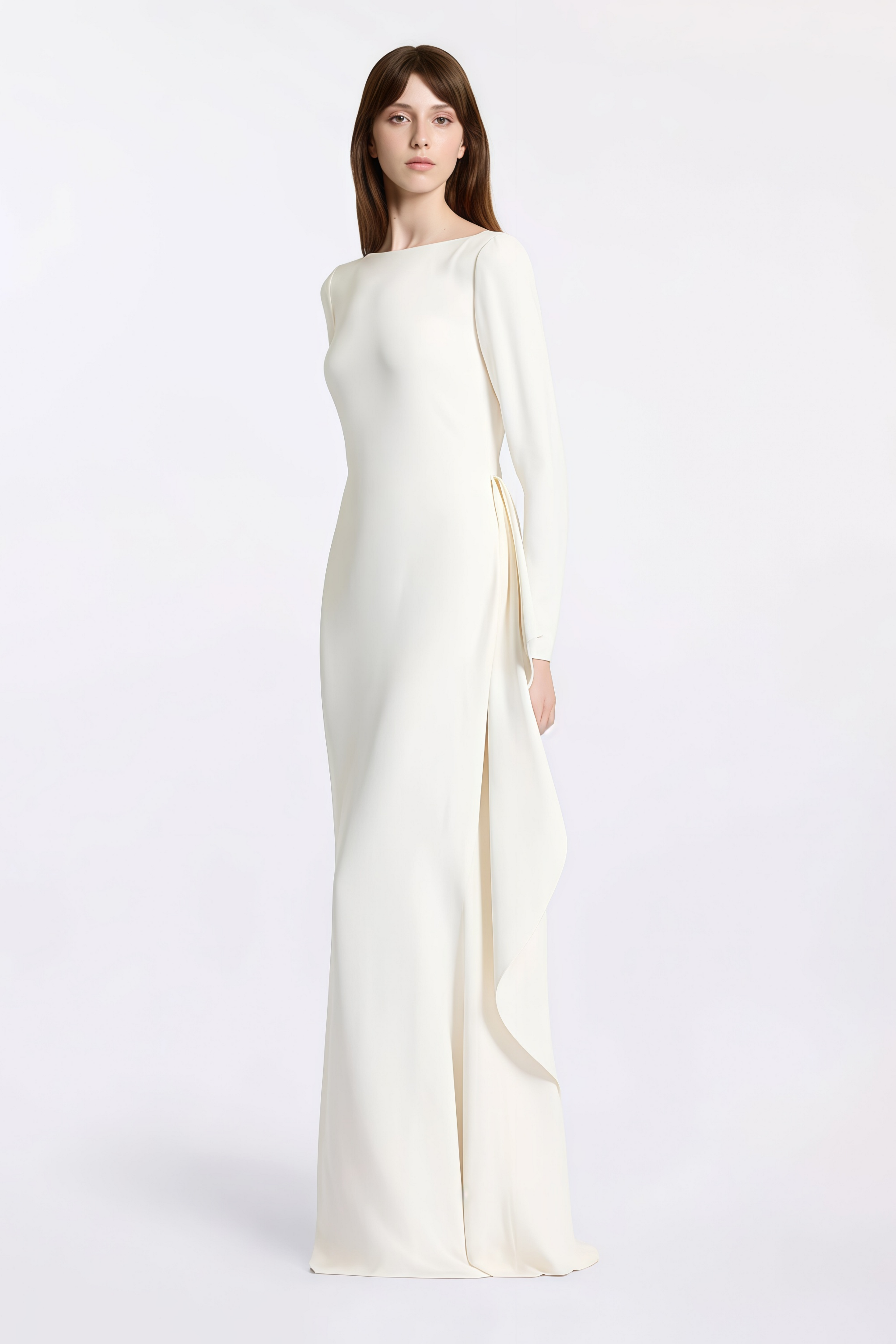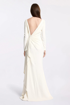 Introducing the Sybil White Ruffled Open Back Maxi Dress, a must-have addition to your wardrobe. This elegant design features a refined boat neckline with long sleeves, complemented by a sophisticated open back and delicate ruffled detailing. The dress contours to a sculpted fitted silhouette that flows into a graceful floor-length skirt. Elevate your style with this elegant and versatile dress.