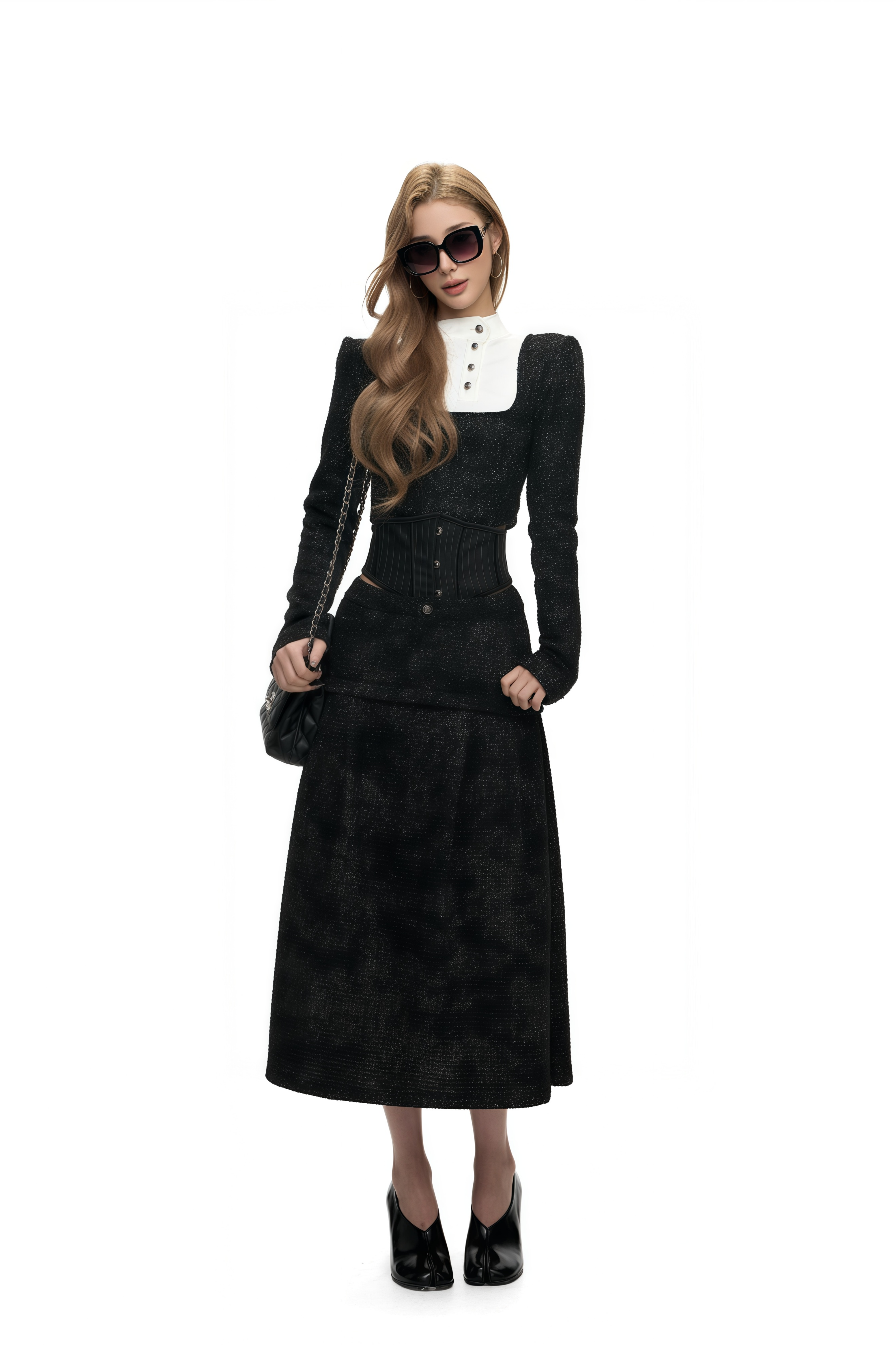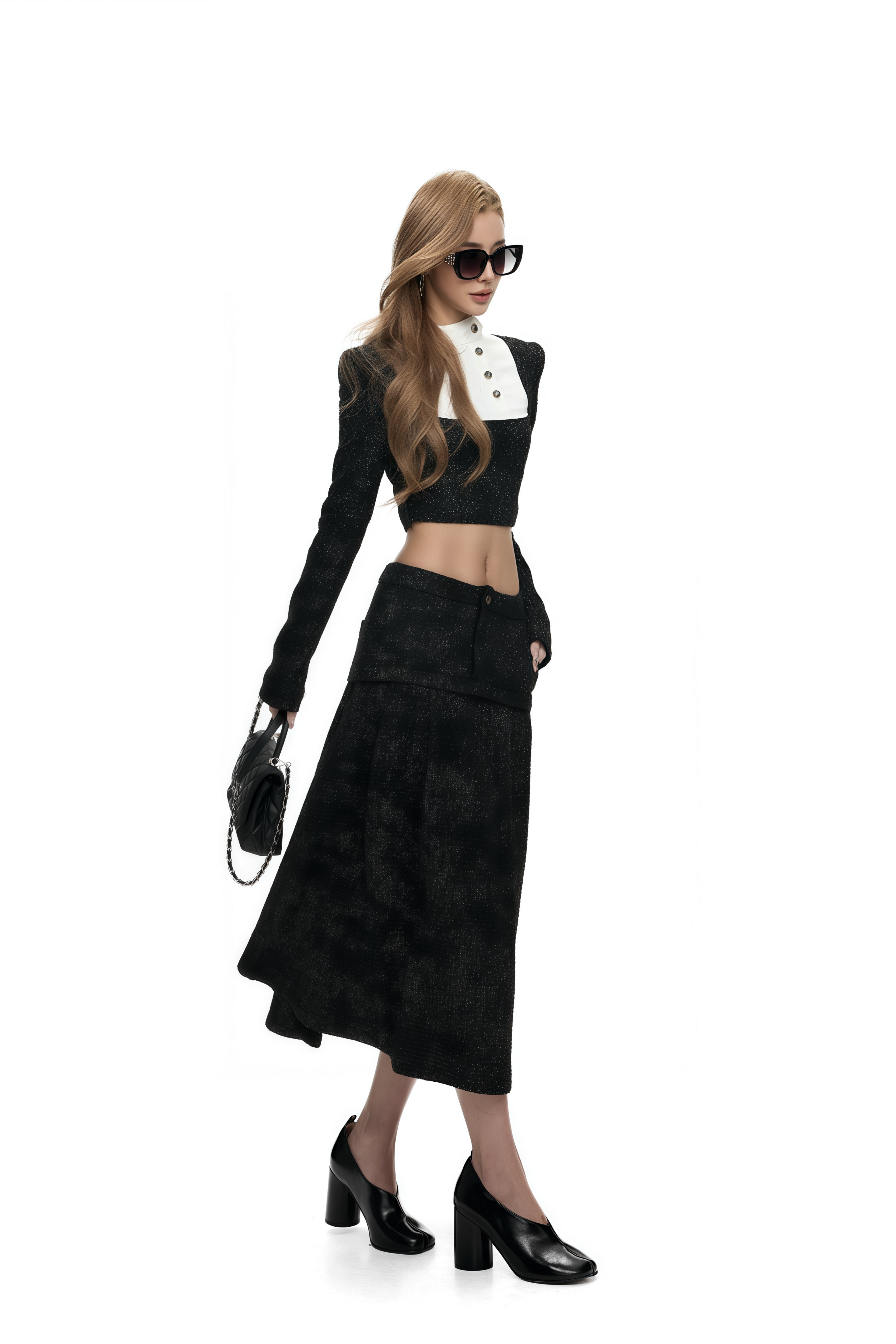 Introducing the Marlowe Black Stand-Up Collar Top, a must-have addition to your wardrobe. This top features sleek black with crisp white stand-up collar and bold color-block design. With its long sleeves, side zip fastening, metallic threading and front button fastening, it offers a chic mini-length silhouette. Elevate your style with this elegant and versatile piece.