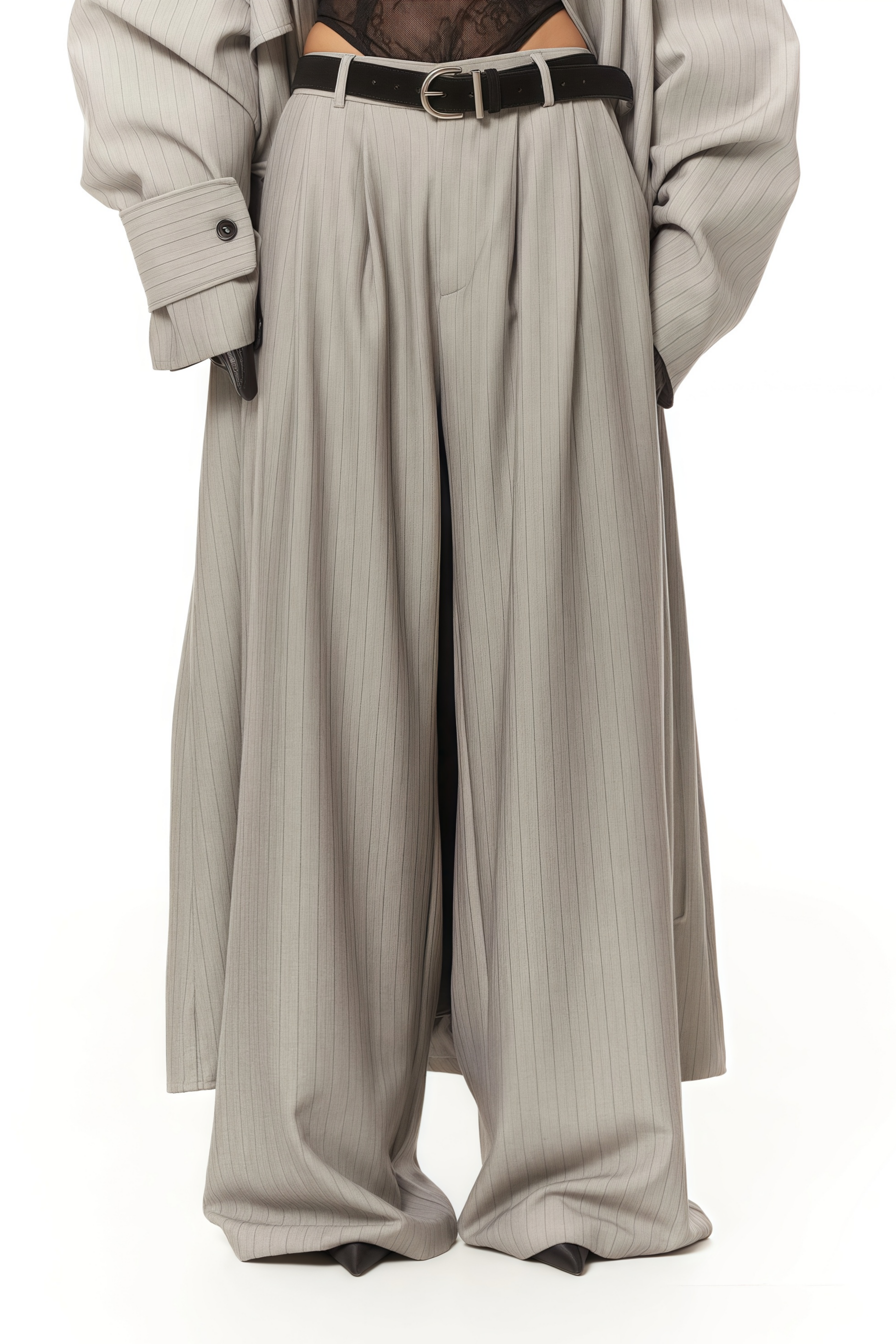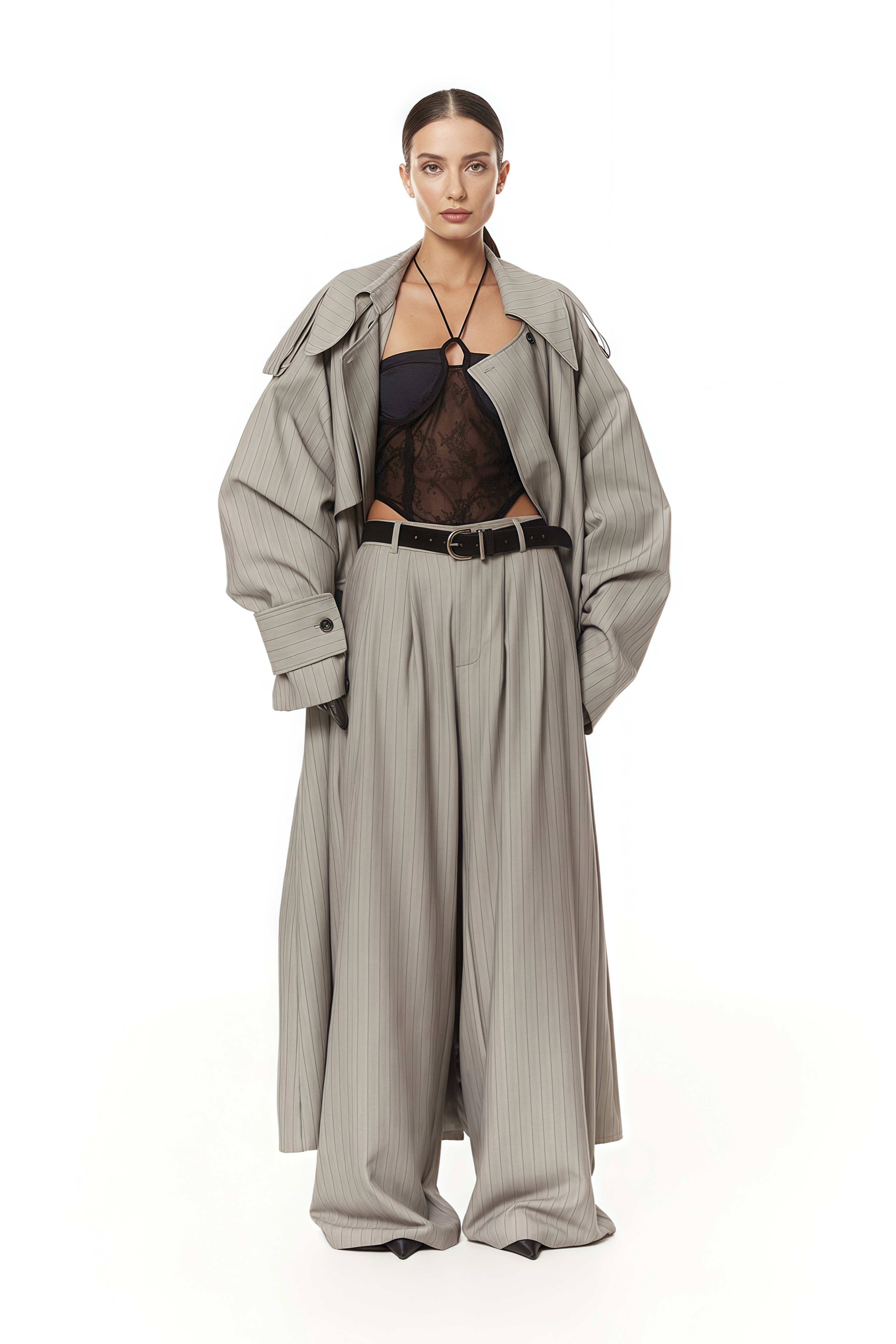 Introducing the Agata Grey Striped Trench Coat & Trousers Set, a must-have addition to your wardrobe. This sophisticated two-piece ensemble features a long trench coat with classic lapels, long sleeves with belted cuffs, a folded edge design, a belted waist, two side slit pockets, a central rear vent, and double-breasted fastening. The matching trousers are designed with a high-rise wide-leg silhouette, complete with belt loops, two side slit pockets, faux pocket detailing, a straight hem, and front button and zip fastening. Both pieces are crafted in a refined vertical stripe pattern for a cohesive and elongated look. Elevate your style with this elegant and versatile set.