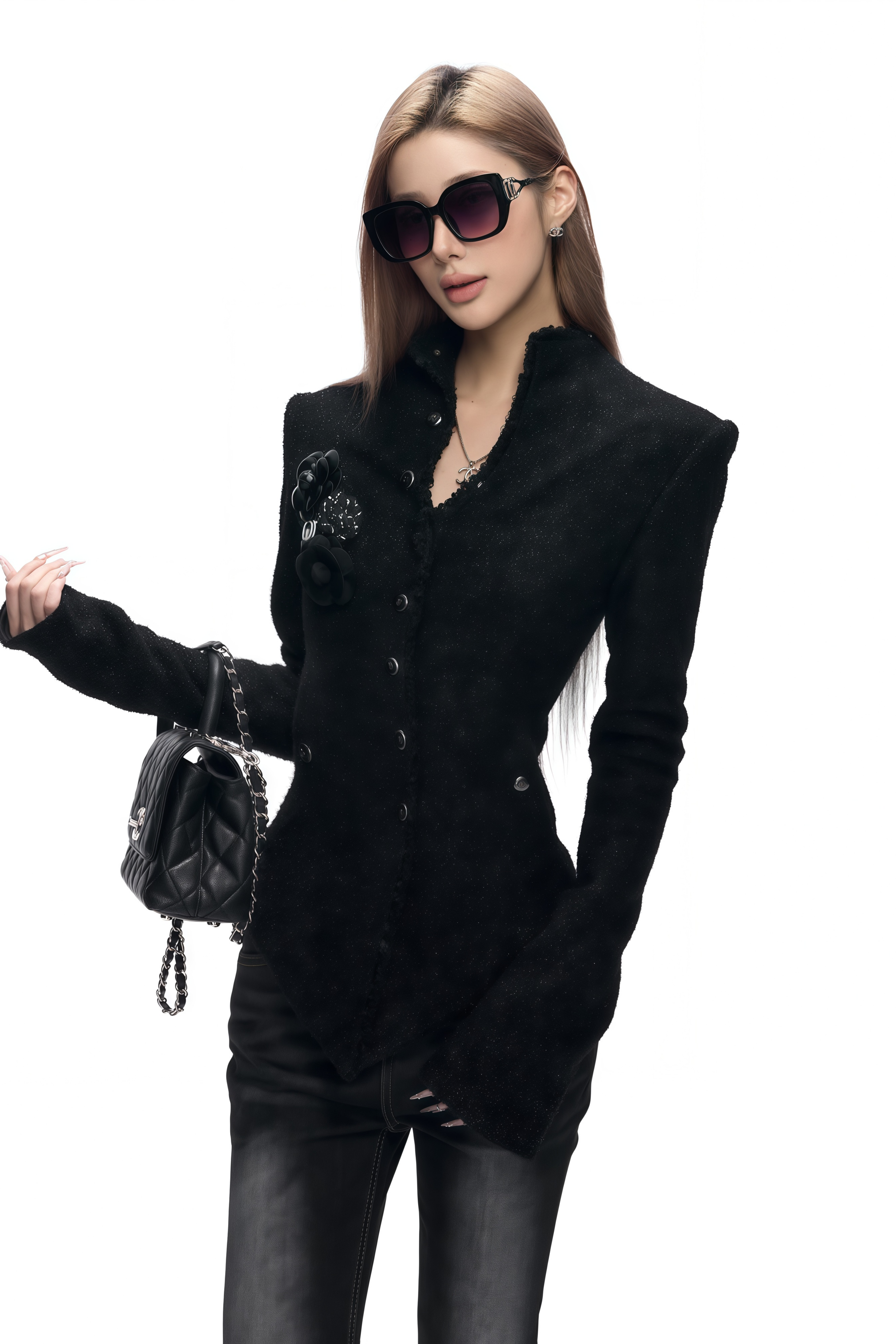 Introducing the Alaia Black Stand-Up Collar Tweed Coat, a must-have addition to your wardrobe. This coat features a timeless black hue, a sculptural stand-up collar and refined tweed finish. With its long sleeves, structured shoulder pads and single-breasted button fastening, it offers polished elegance. A fitted waistline, brooch embellishment and midi length complete the look. Elevate your style with this elegant and versatile coat.