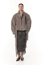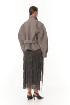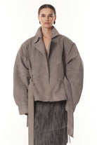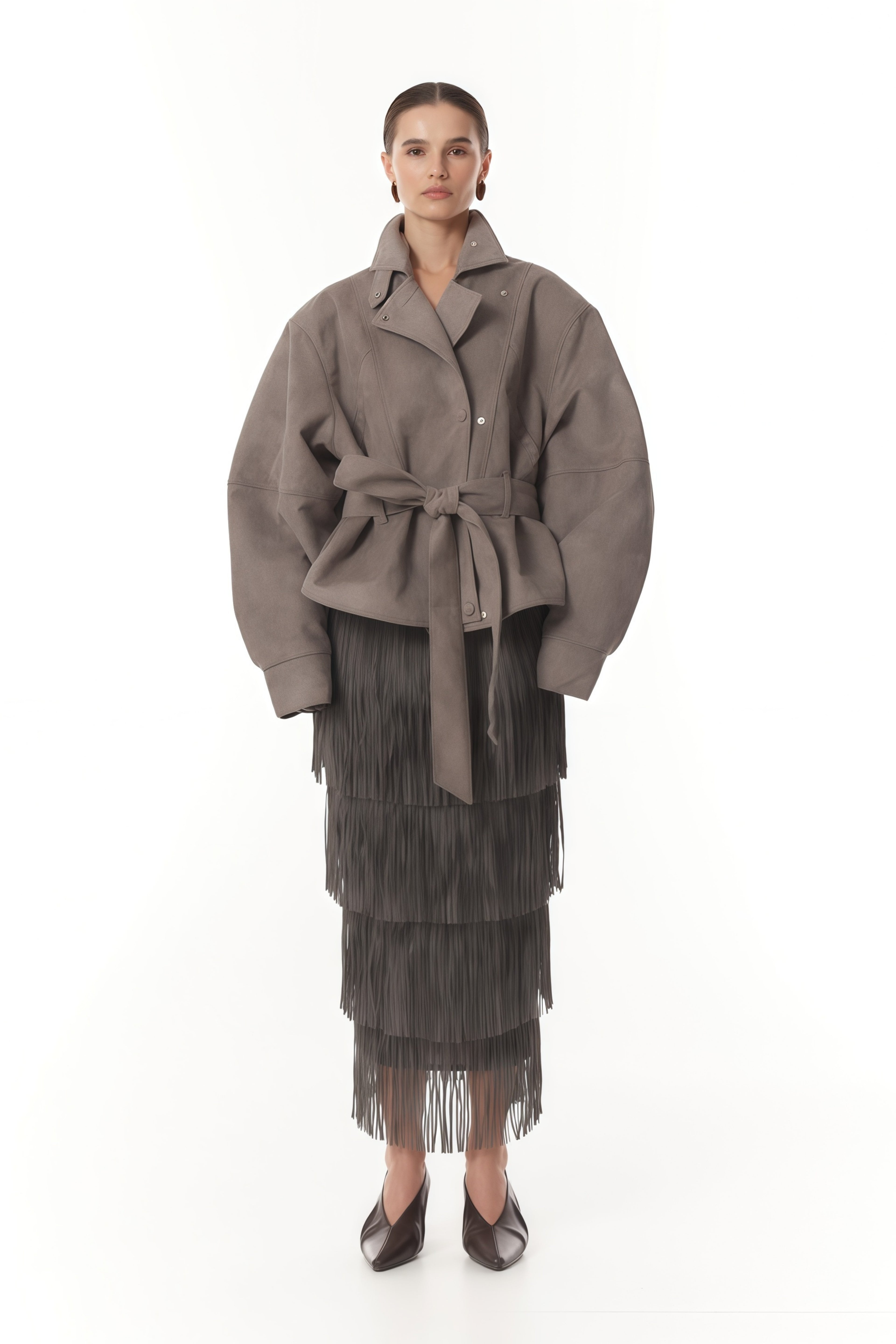 Introducing the Roxanne Grey Belted Suede Biker Jacket, a must-have addition to your wardrobe. This refined design features sharp notched lapels with long sleeves, crafted in a luxurious suede finish. The jacket includes functional belt loops with an adjustable belted waist, two front slit pockets, and is secured with classic front button fastening. Elevate your style with this versatile and sophisticated outerwear piece.