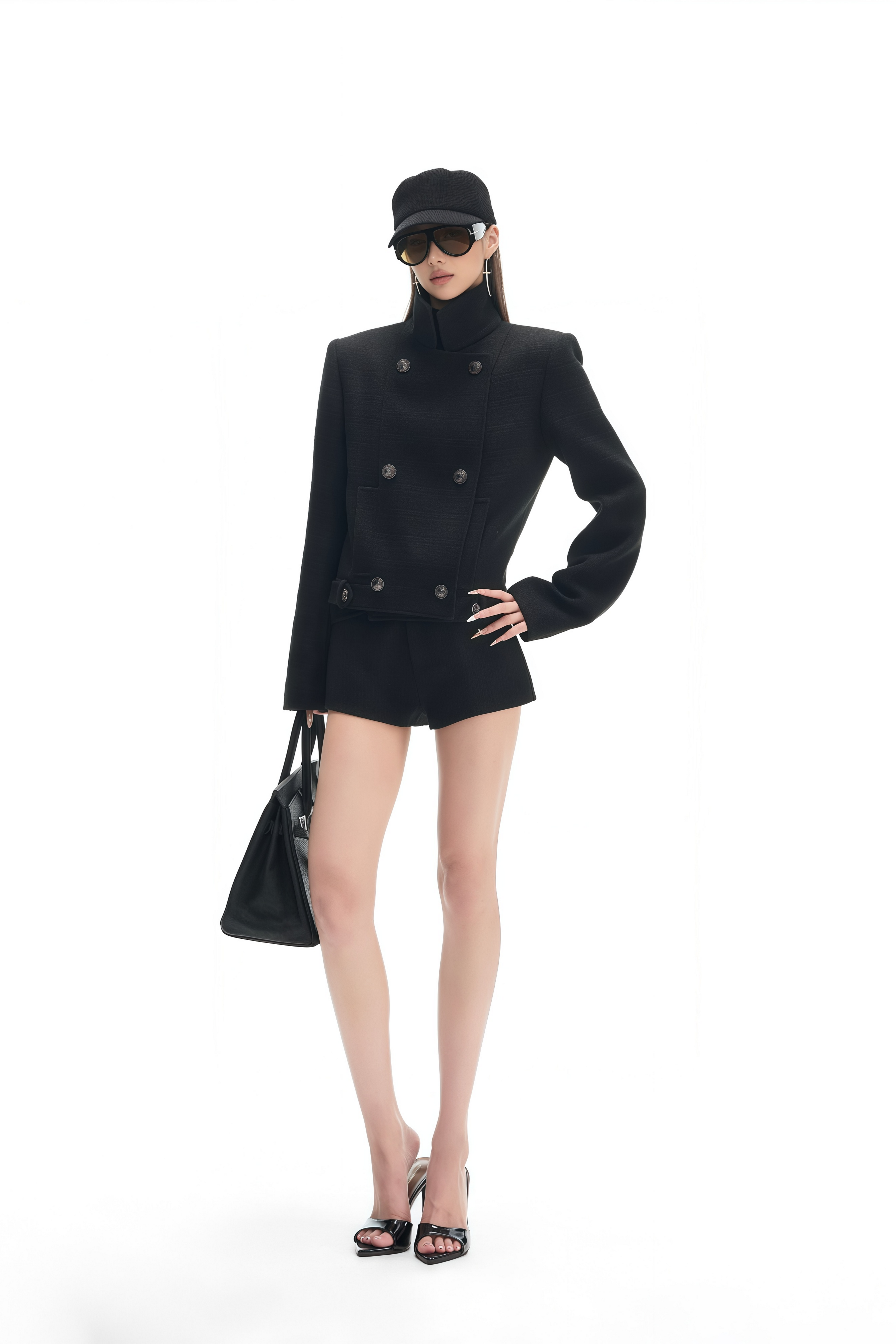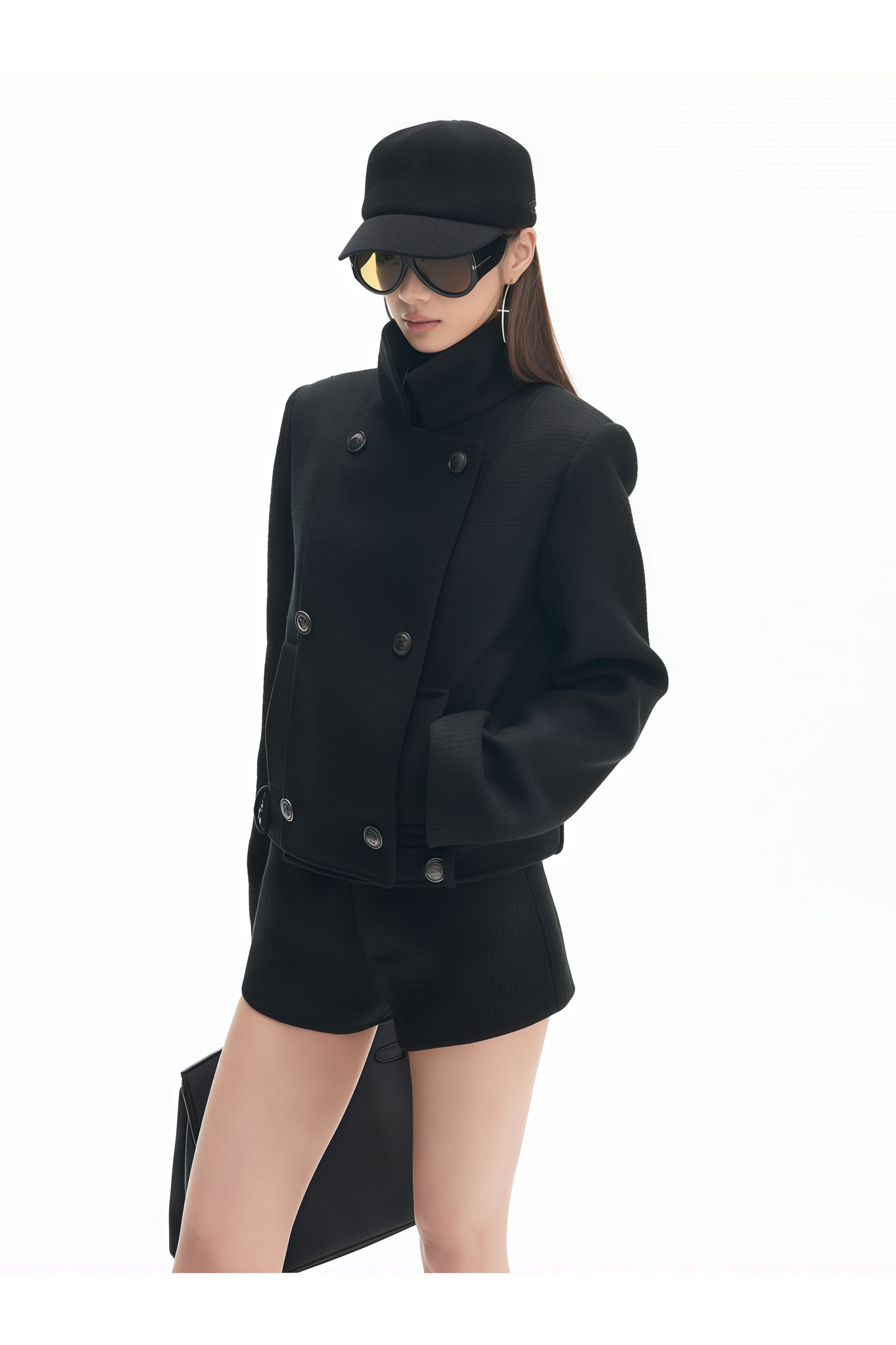 Introducing the Amélia Black Tweed Mini Shorts, a must-have addition to your wardrobe. These shorts feature a classic tweed texture and a sleek fitted silhouette. With its front zip fastening and two side welt pockets, it offers both style and functionality. Elevate your style with this chic and versatile bottom.
