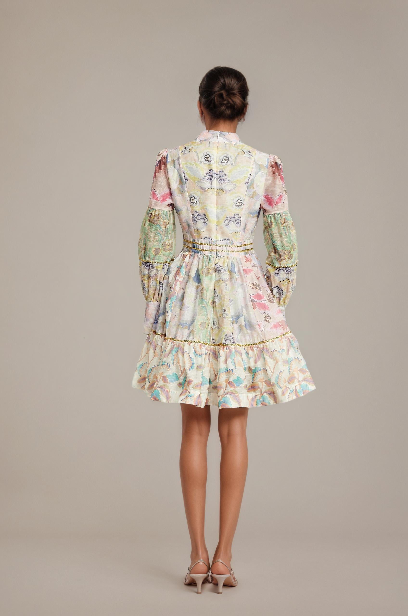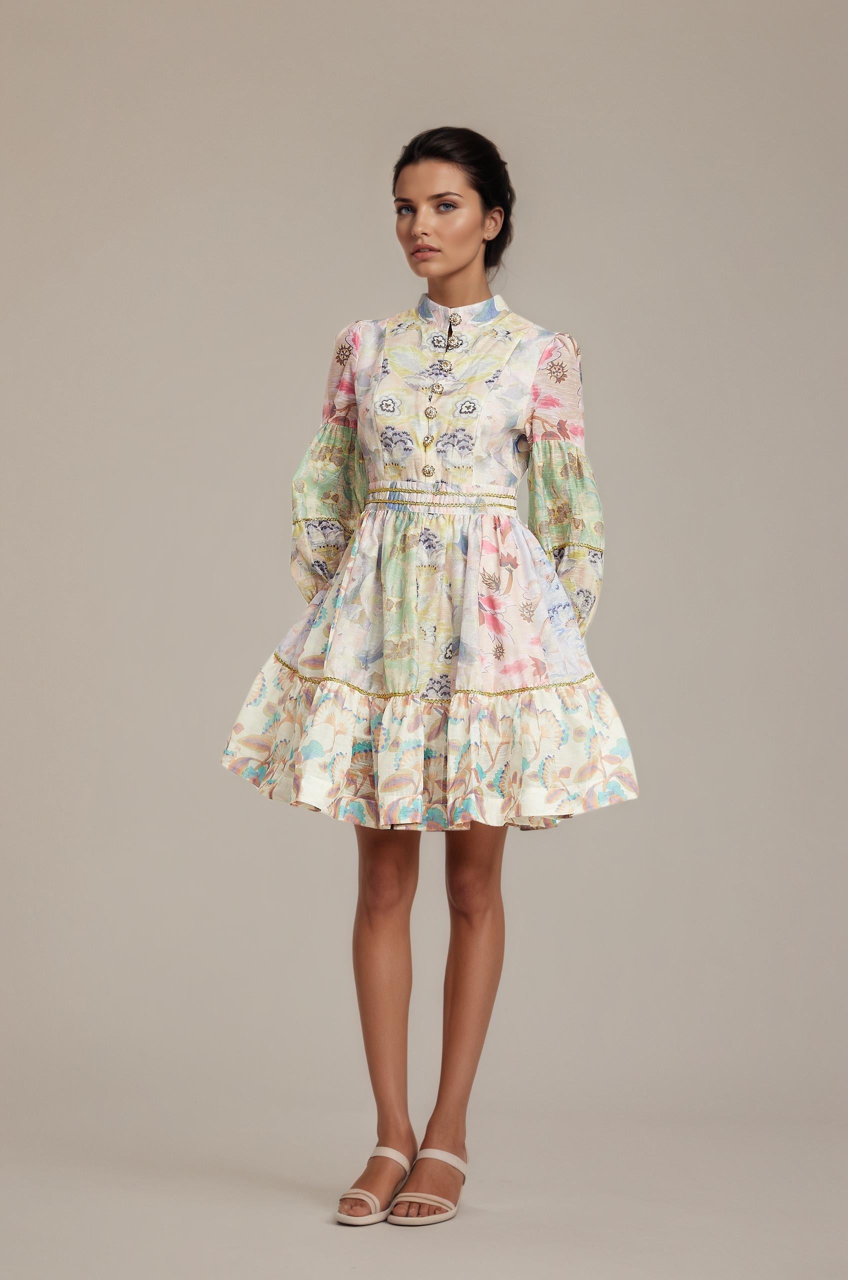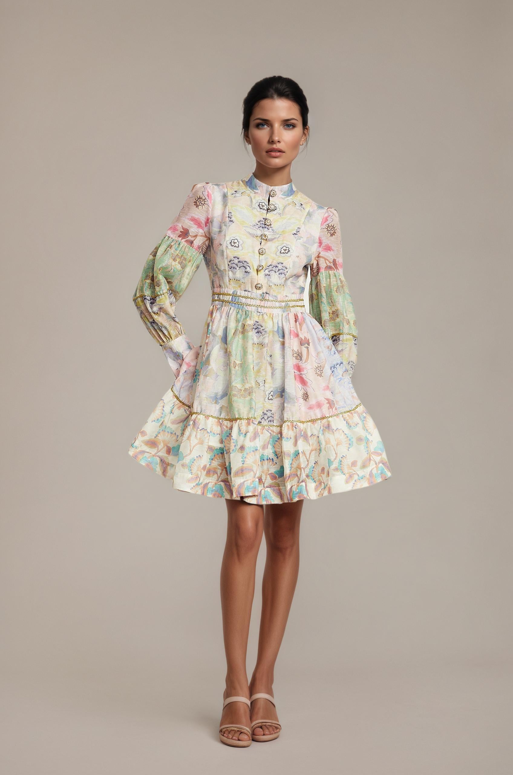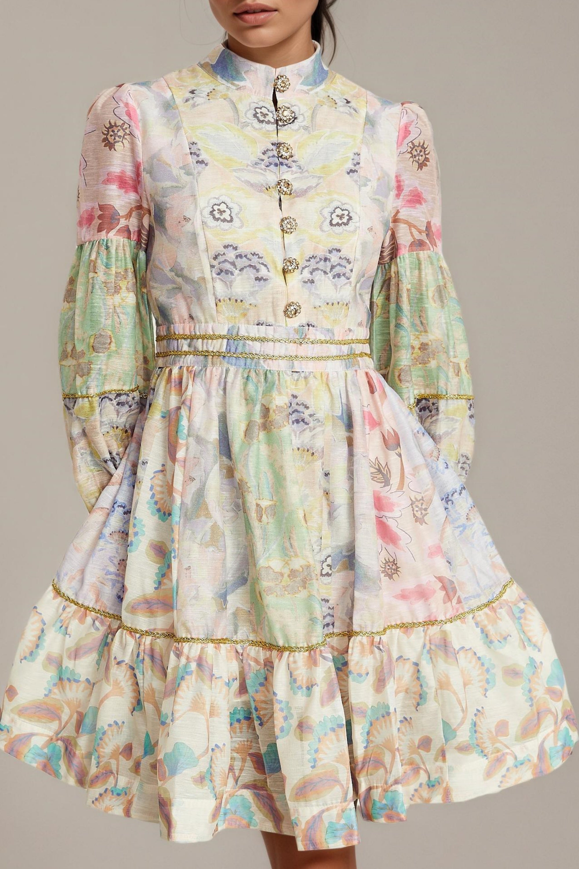 Introducing the Solène Mini Dress With Floral Print, a must-have addition to your wardrobe. This dress features a chic mock neck and statement long balloon sleeves with zippered cuffs. With its all-over floral print, sparkling sequin embellishment, unique patchwork design, and flounce hem, it offers a perfect fit. Elevate your style with this elegant and versatile thigh-length dress.