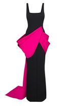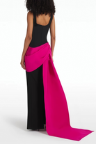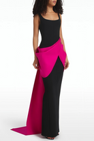 Introducing the Zinnia Black Asymmetric Maxi Gown, a must-have addition to your wardrobe. This sleeveless design features a chic square neckline with wide straps, showcasing a bold color-blocked aesthetic through the dramatic contrast between black and pink, enhanced with artistic asymmetric fold detailing. The gown flows into an elegant floor-length silhouette with a dramatic train design, secured with discreet rear zip fastening for a seamless fit. Elevate your style with this elegant and versatile gown.