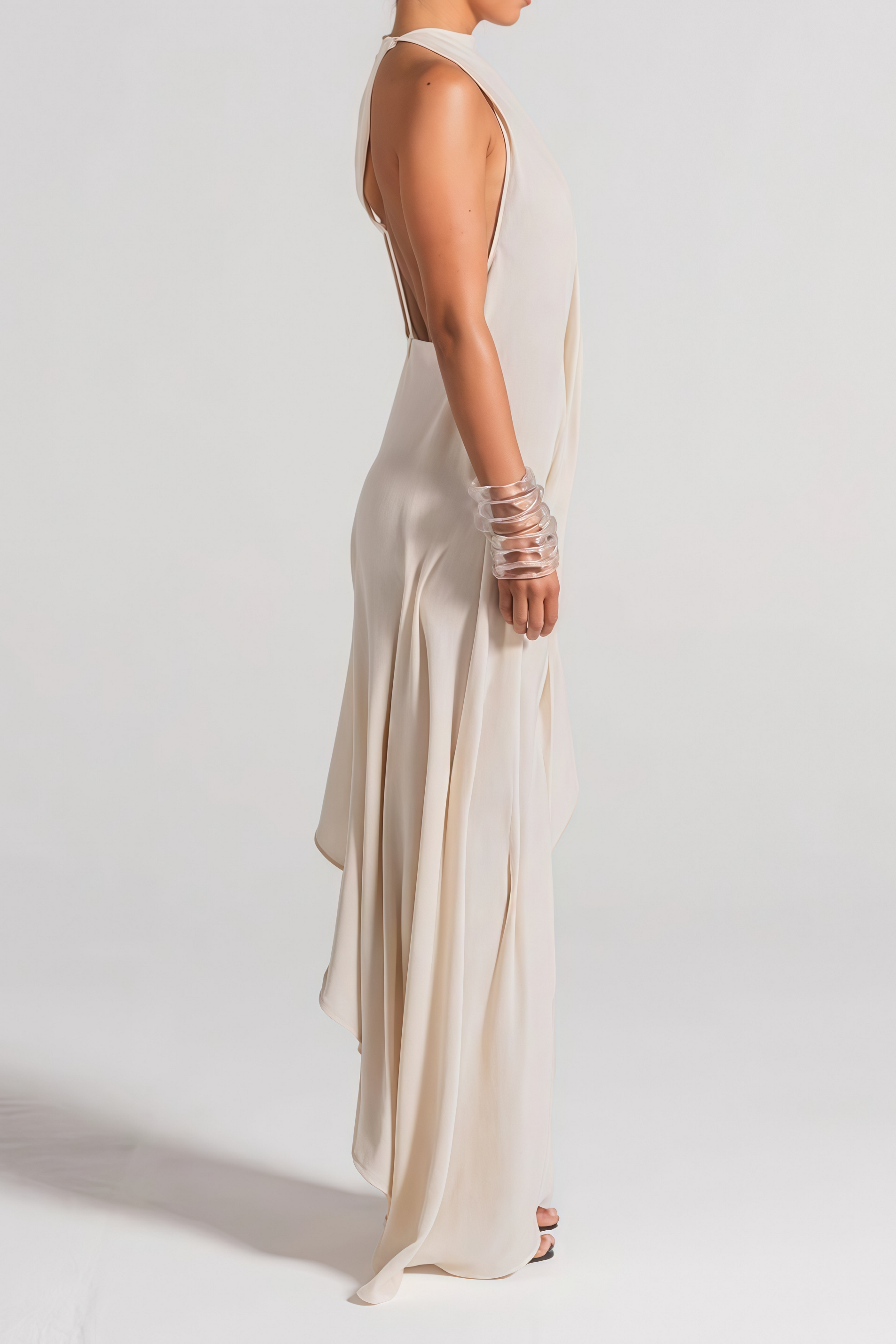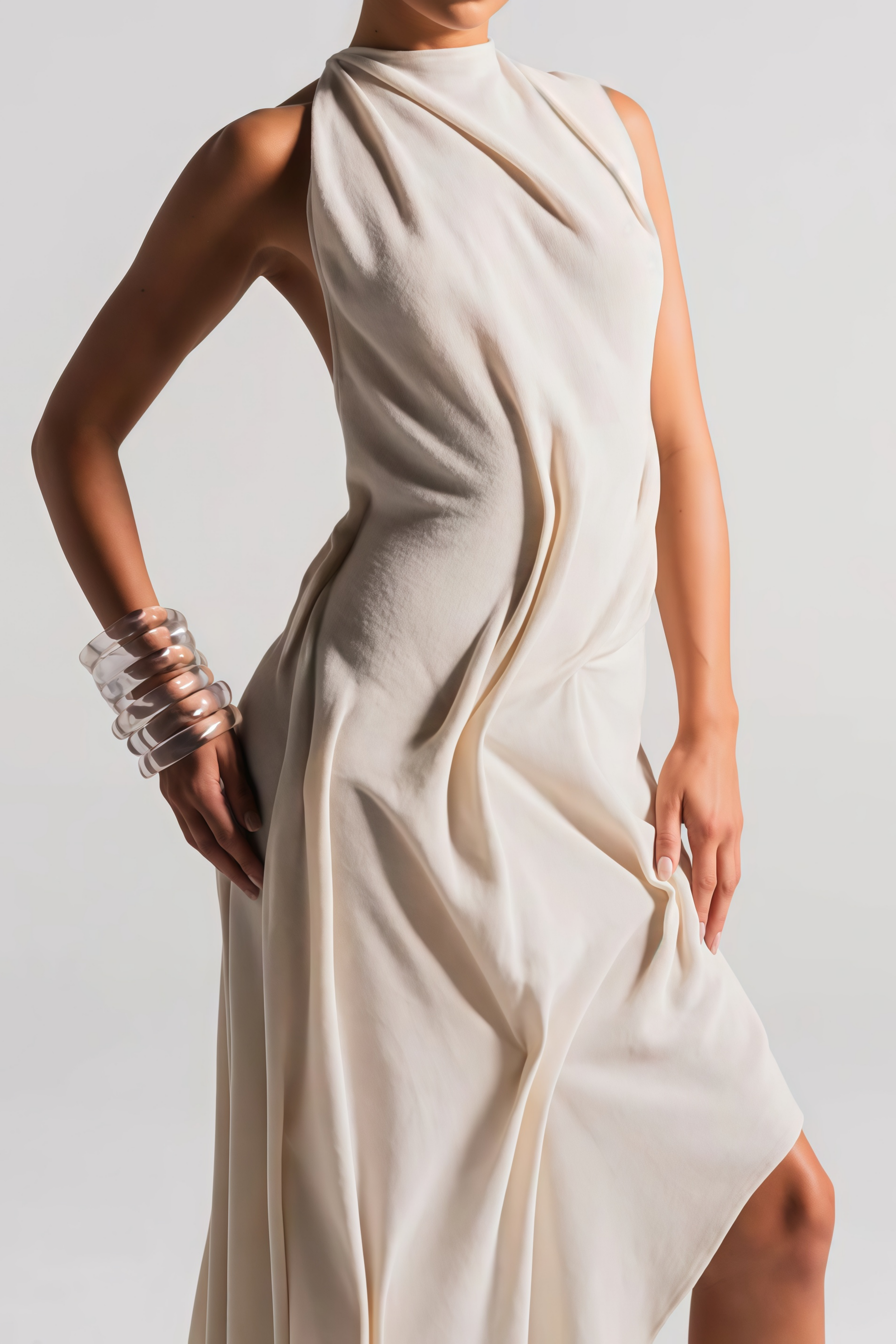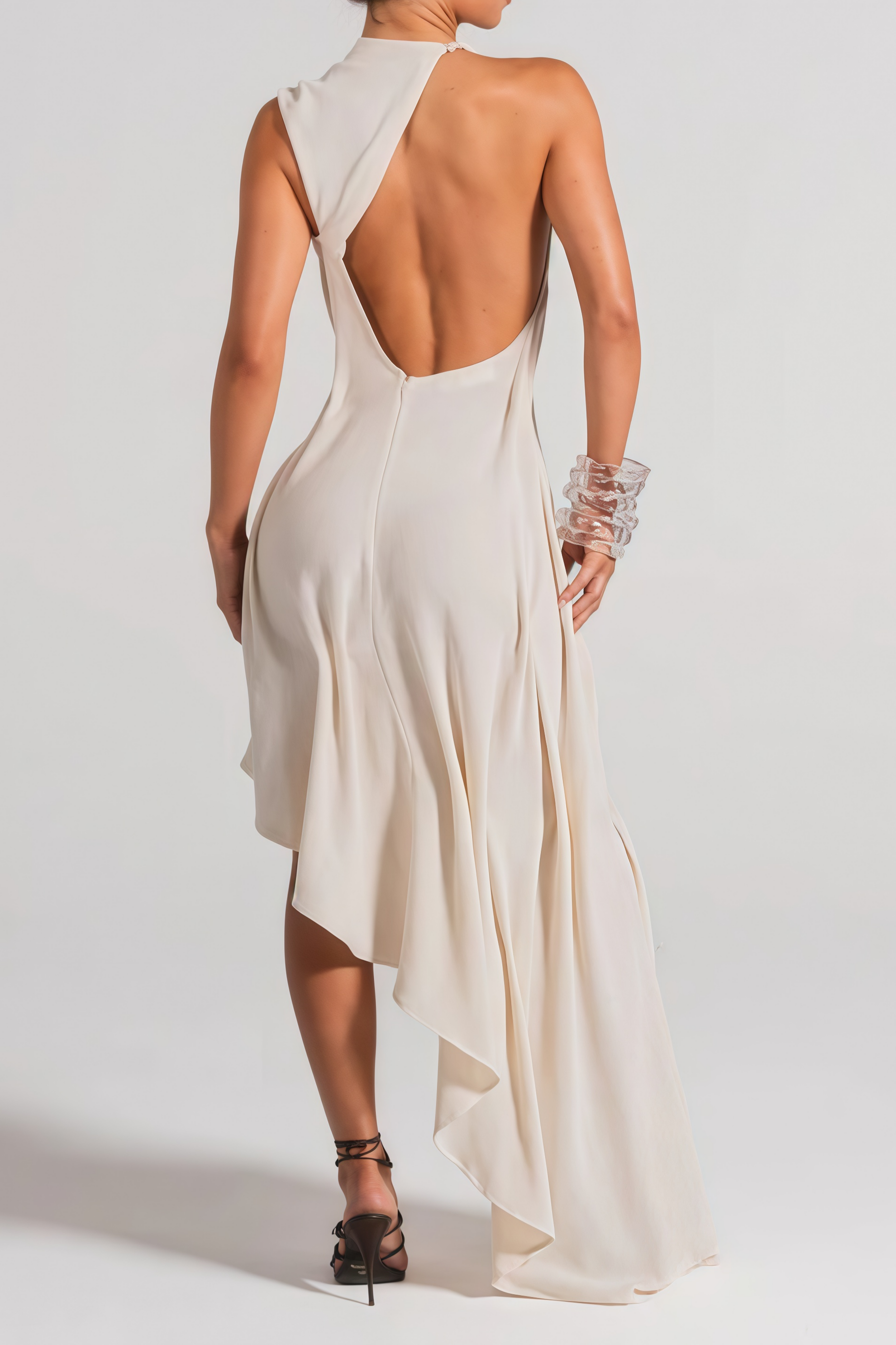Introducing the Christine White Asymmetrical Ruched Midi Dress, a must-have addition to your wardrobe. This elegant design is crafted from comfortable stretch knit with an off-the-shoulder silhouette and an open back for modern allure. Featuring artistic asymmetrical construction and delicate ruched detailing, the dress flows into a graceful midi-length hem and is secured with discreet rear zip fastening. Elevate your style with this sophisticated and versatile dress.