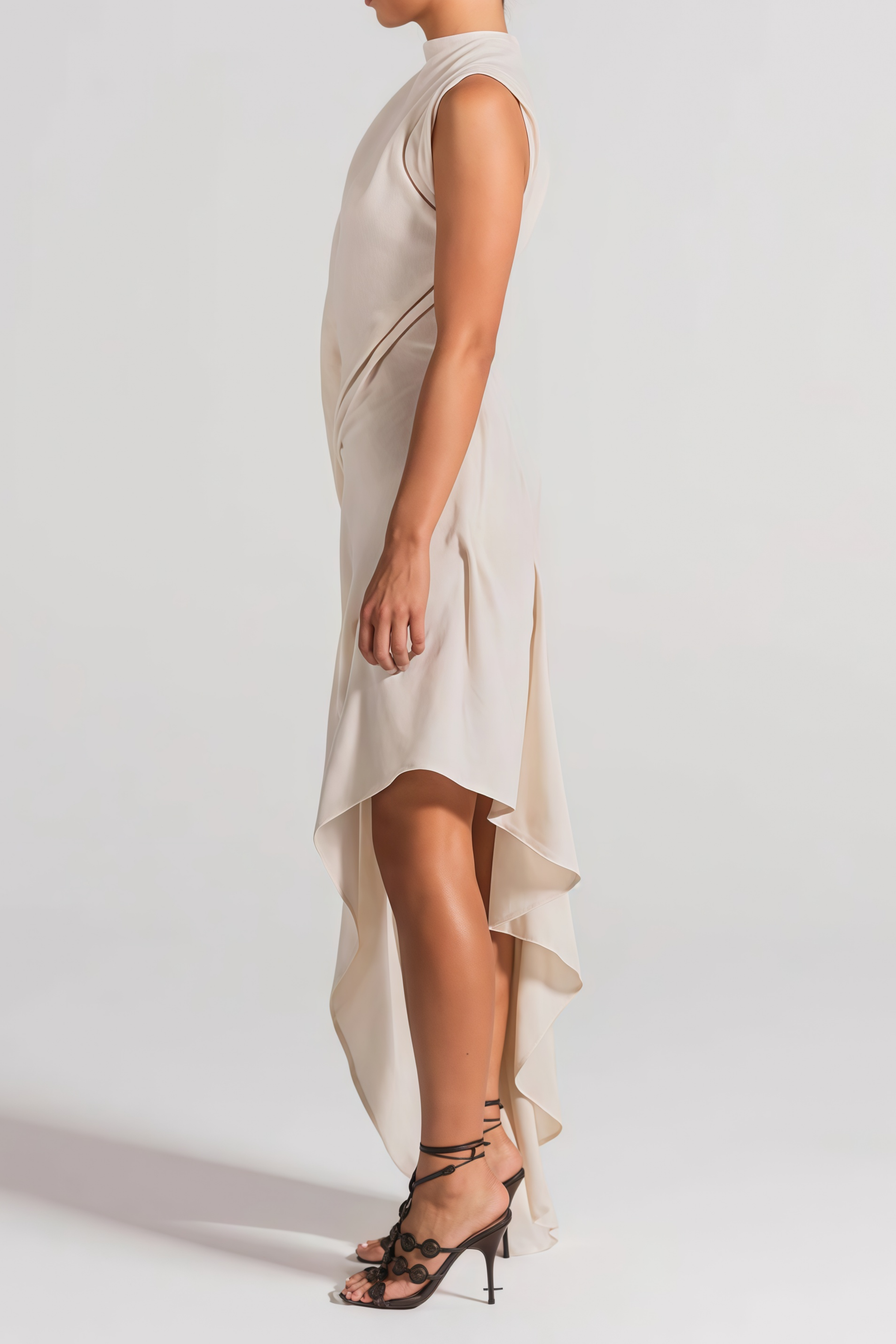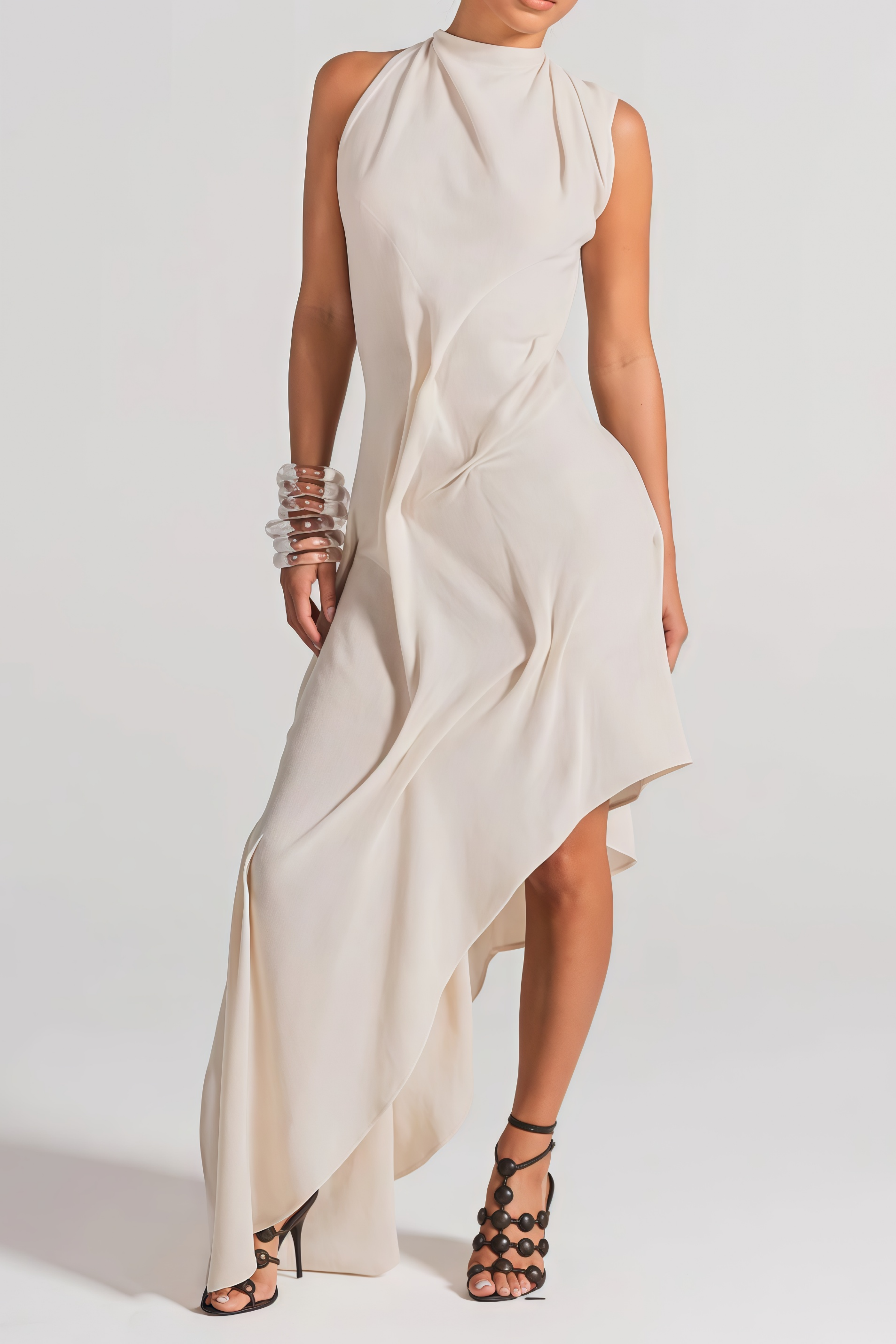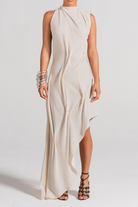 Christine White Asymmetrical Ruched Midi Dress