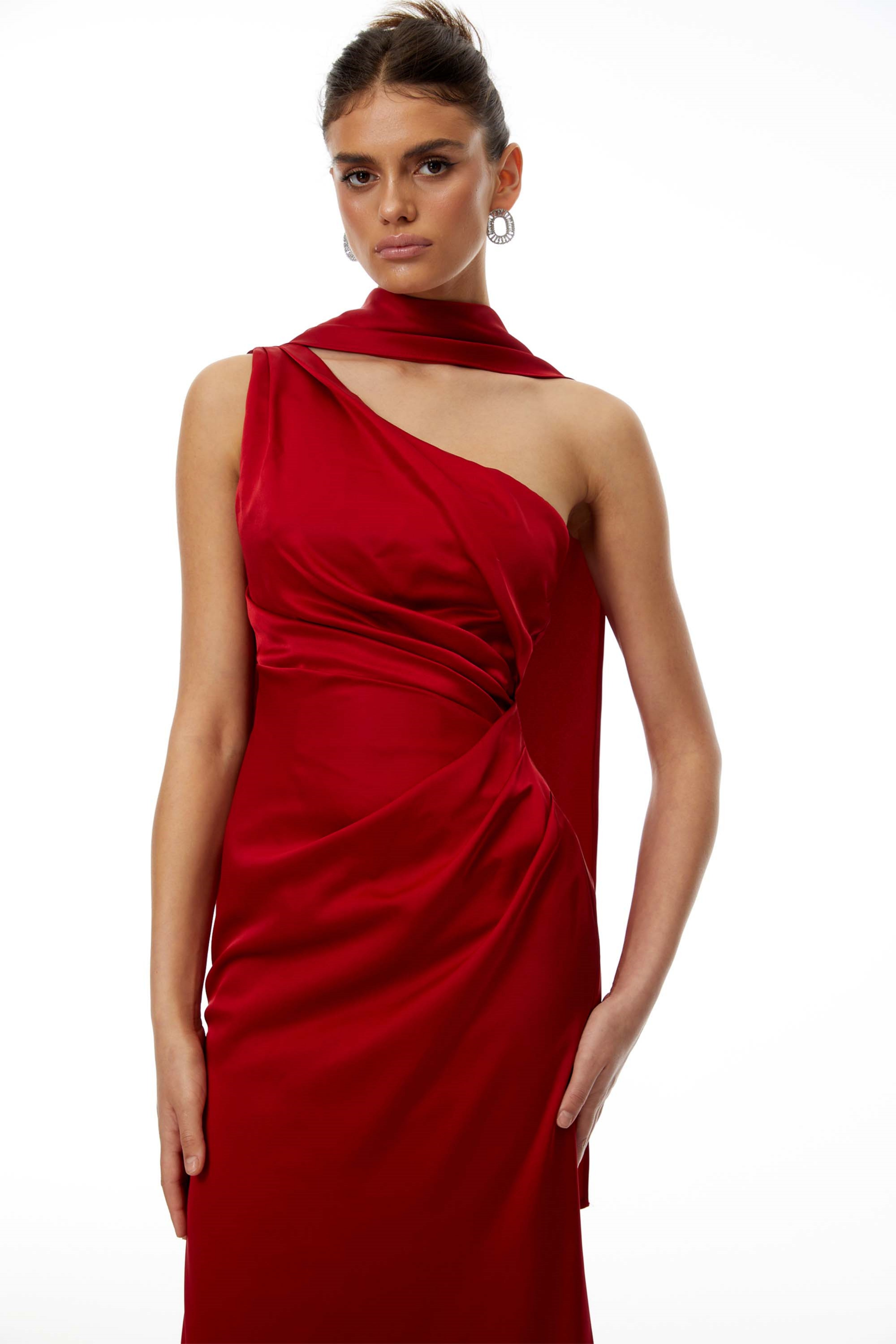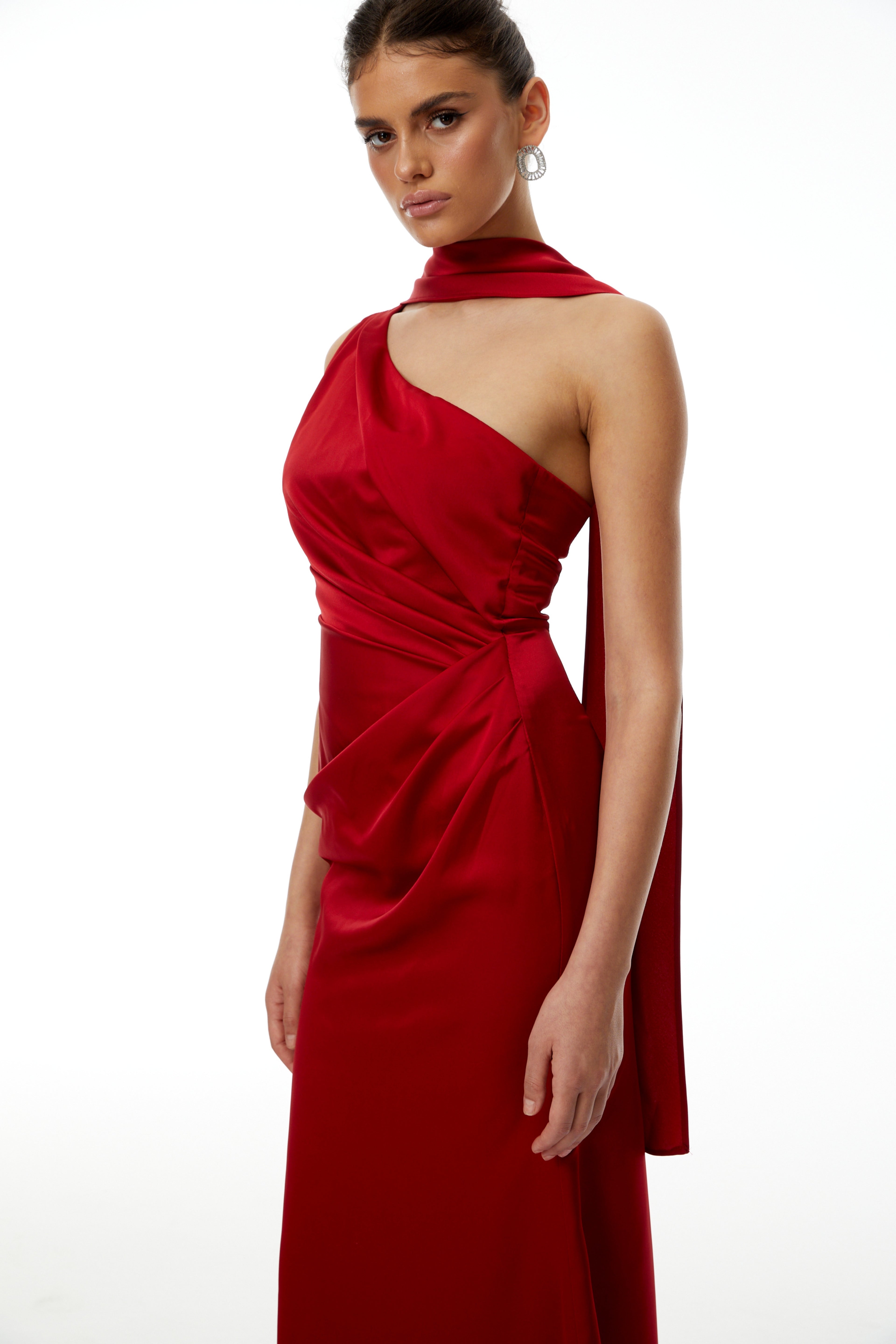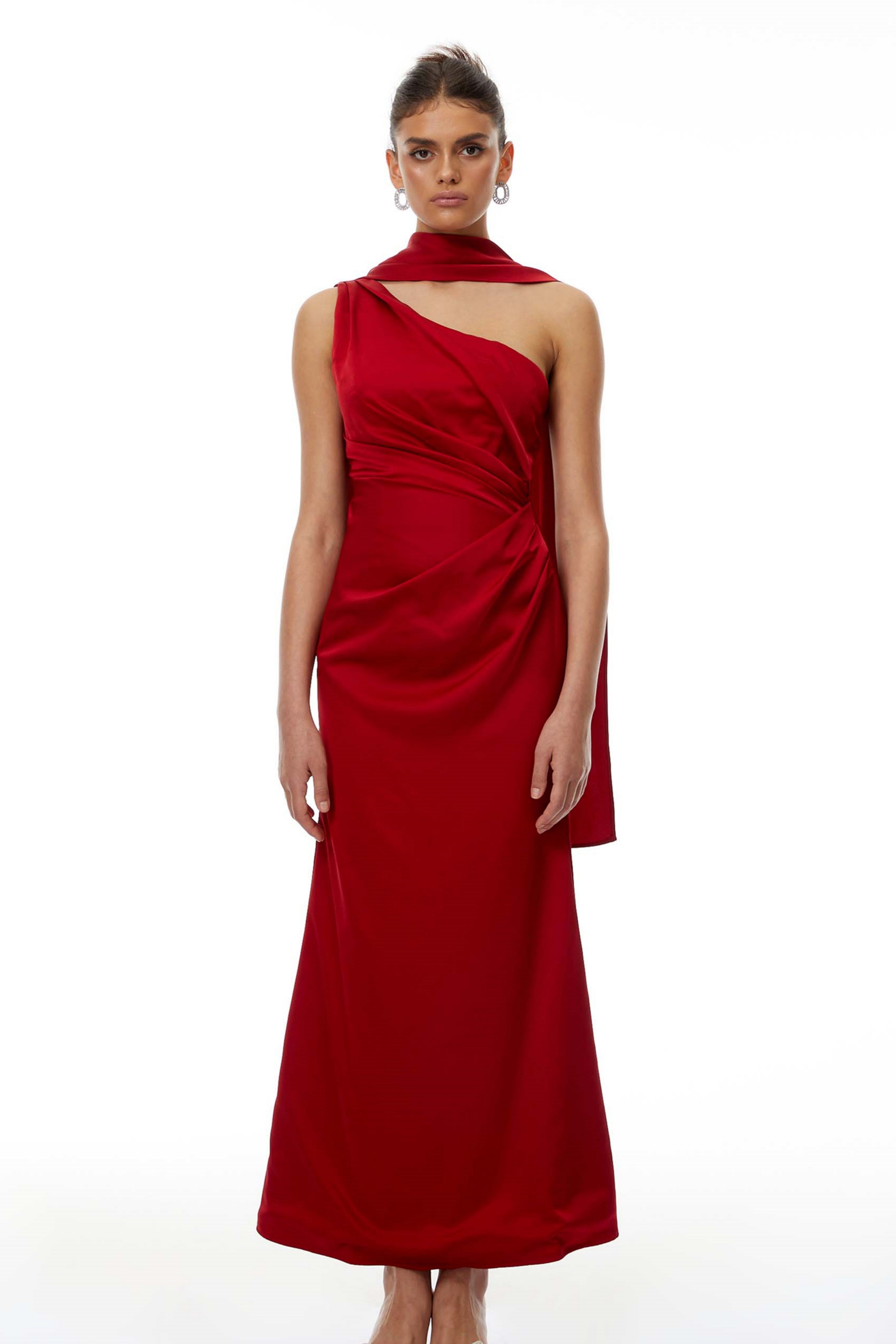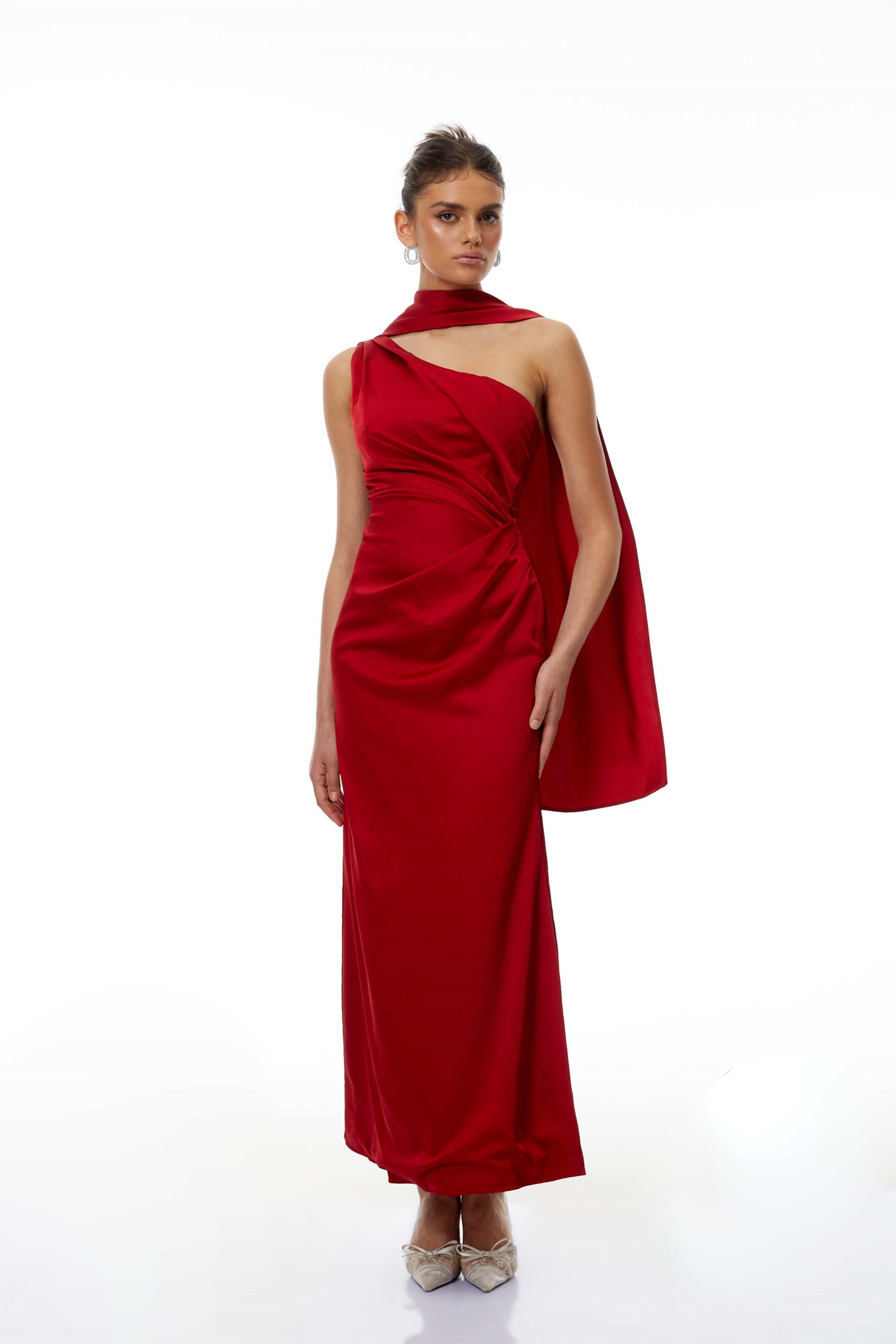 Introducing the Murray Red One Shoulder Ruched Maxi Dress, a must-have addition to your wardrobe. This elegant design features a sophisticated one-shoulder neckline with a sleeveless silhouette, enhanced by delicate ruched detailing and a graceful scarf accent. The dress flows into a straight hem that extends to a graceful maxi length. Elevate your style with this timeless and versatile dress.