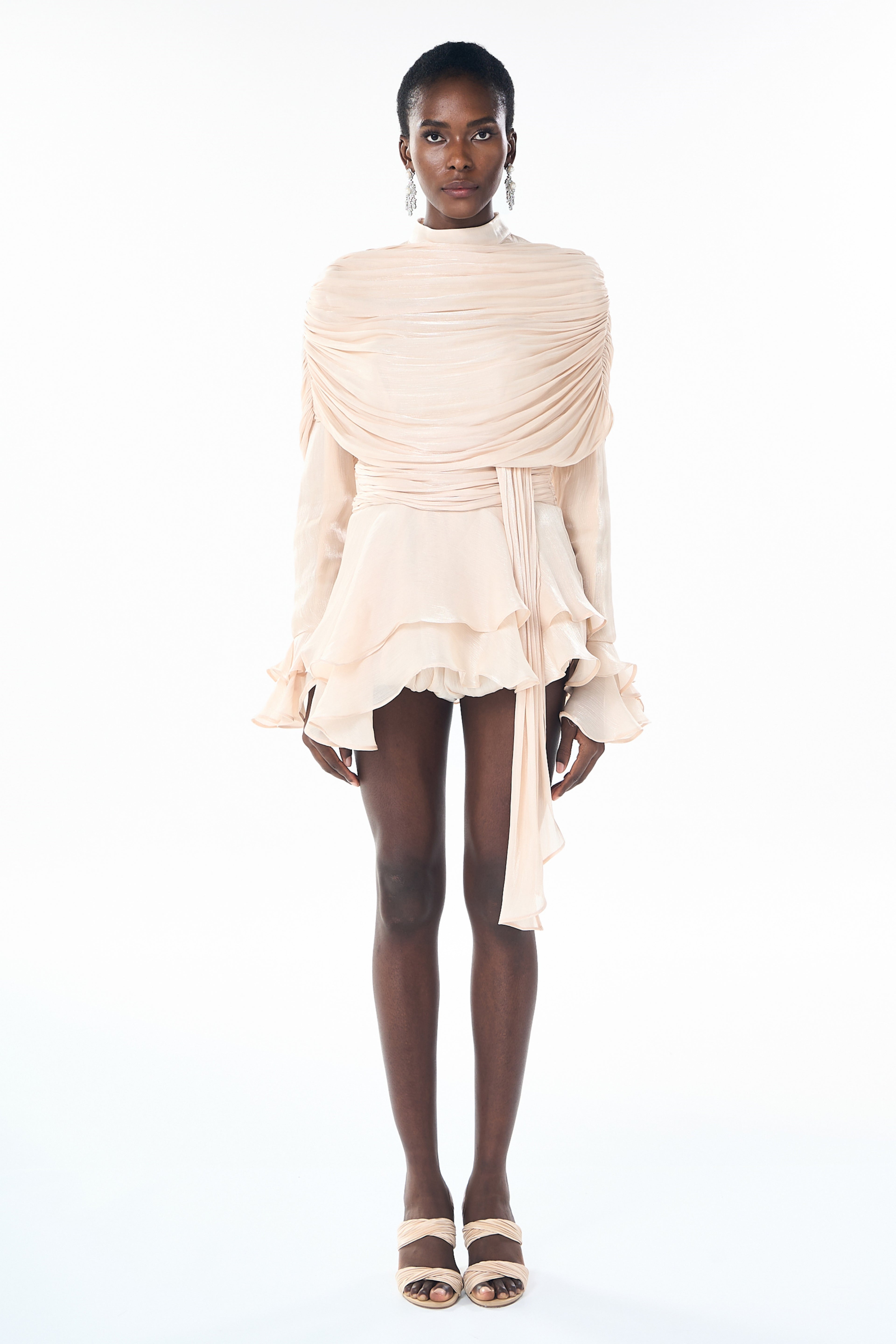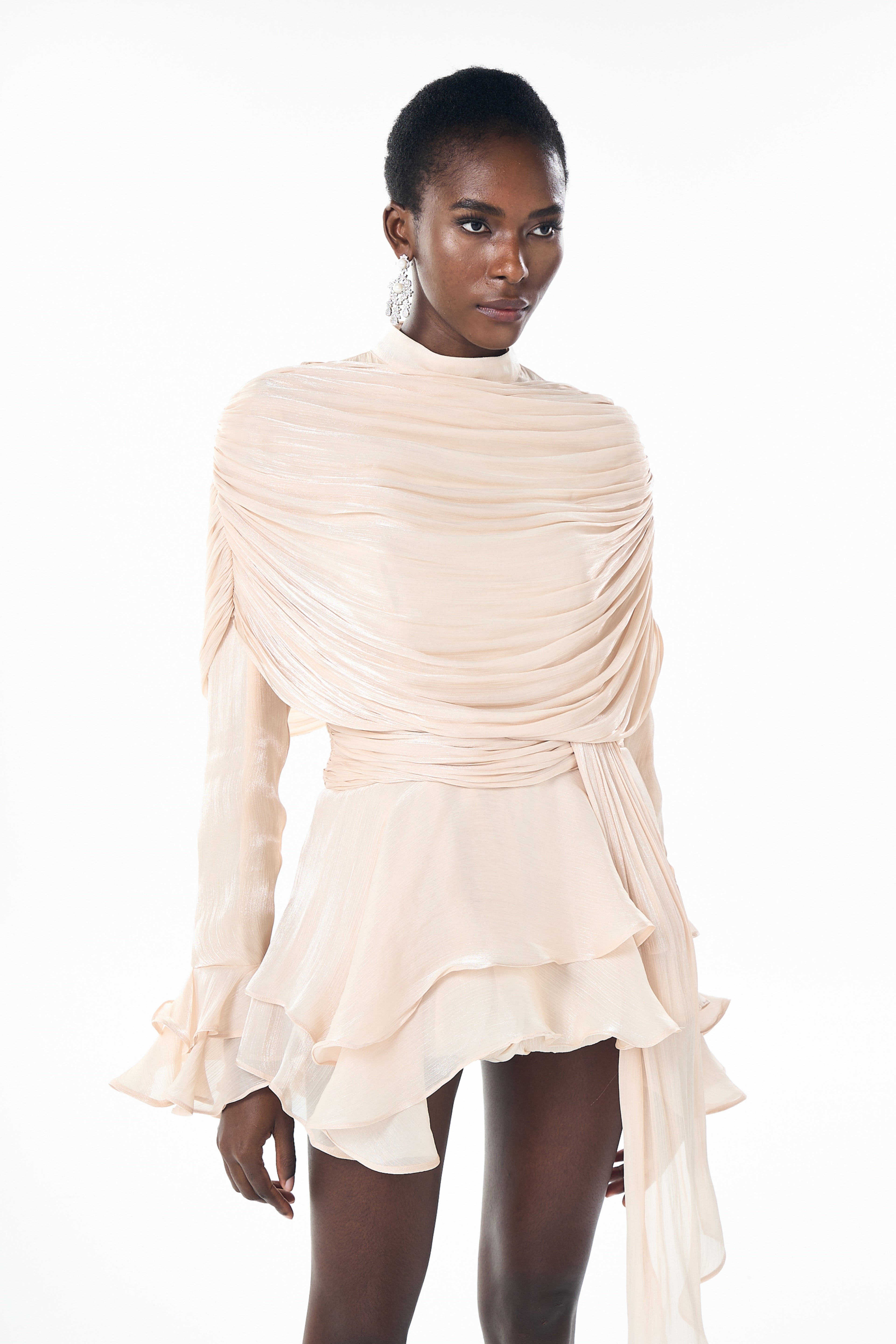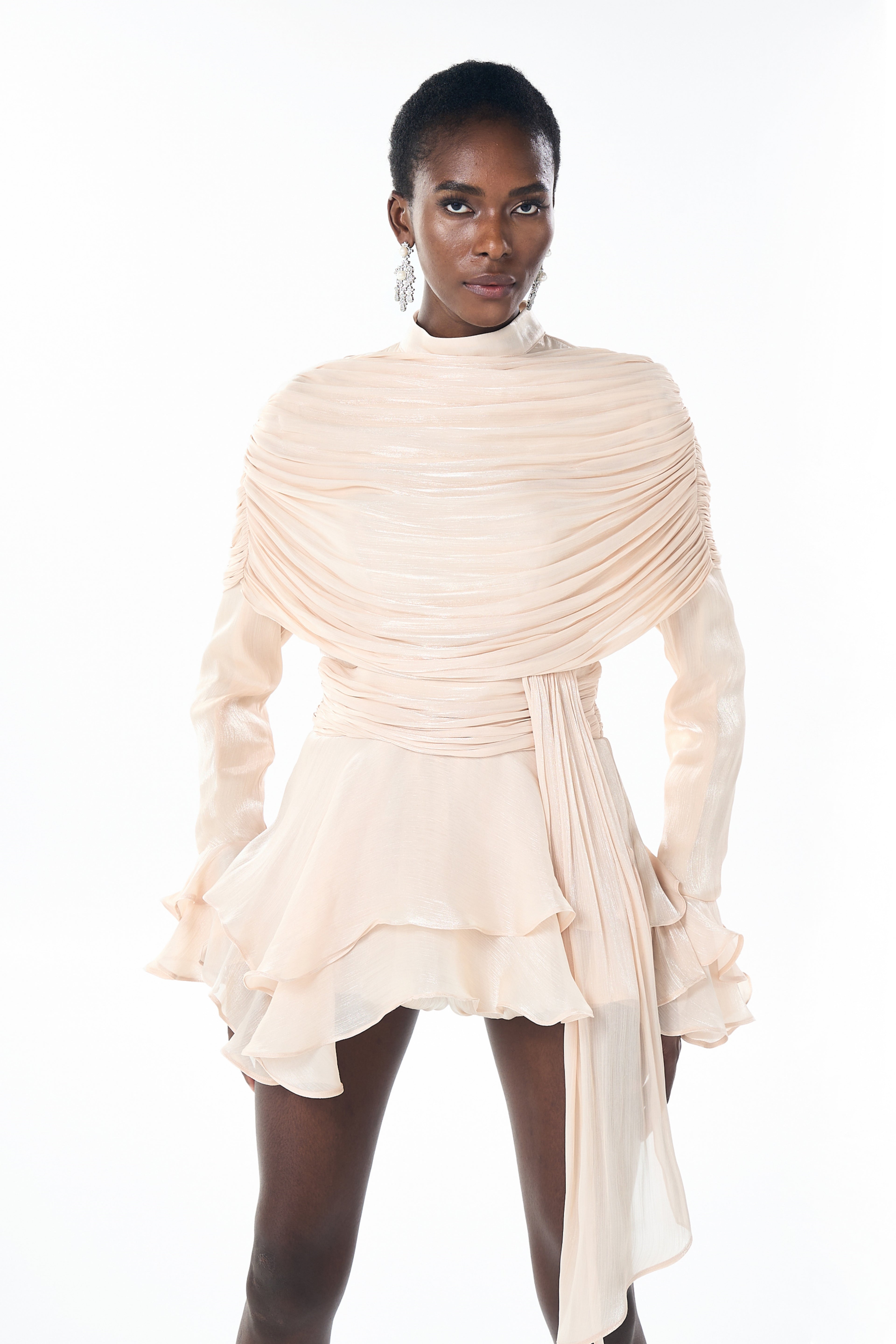 Selena Champagne Ruched Cape & Ruffled Dress Set