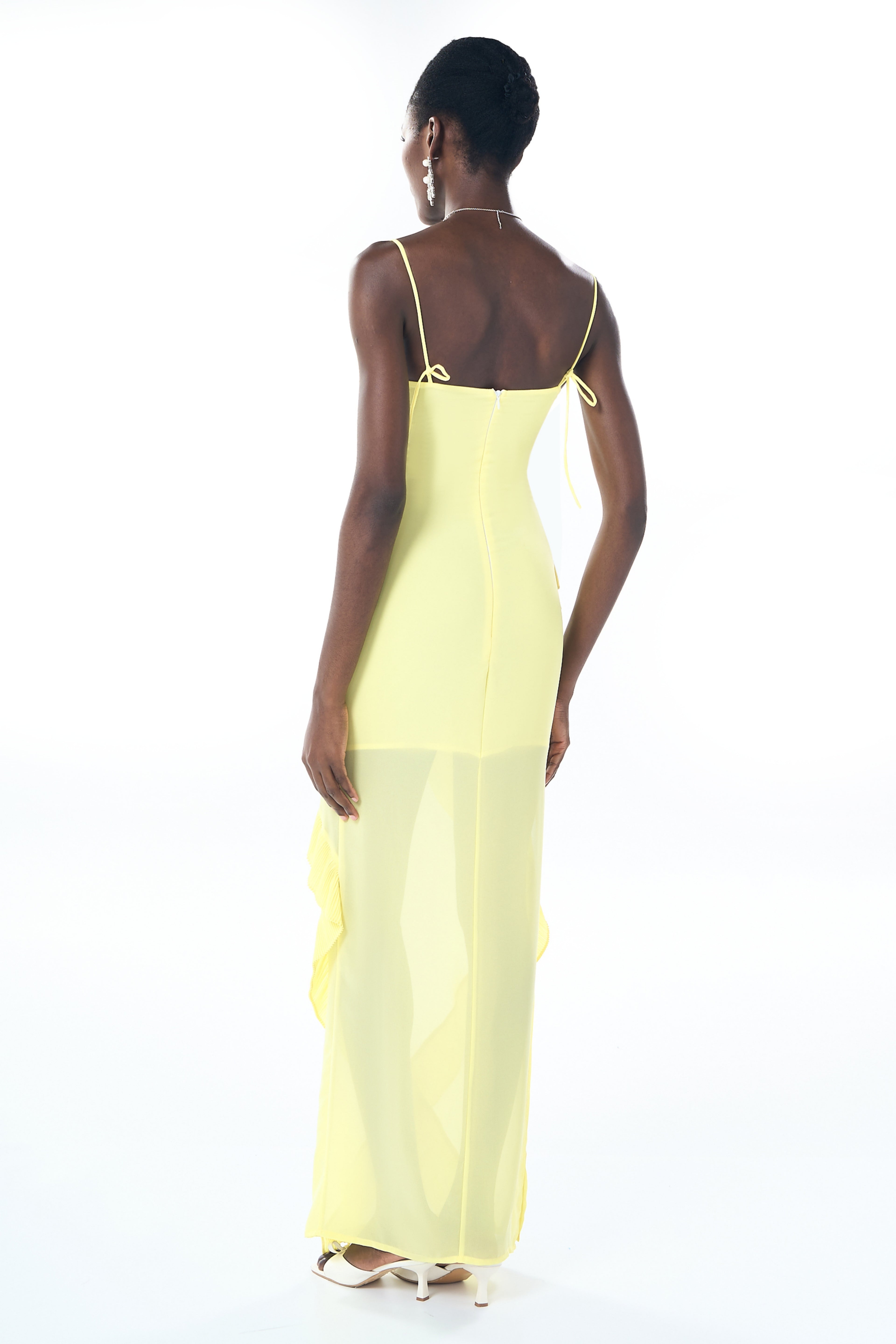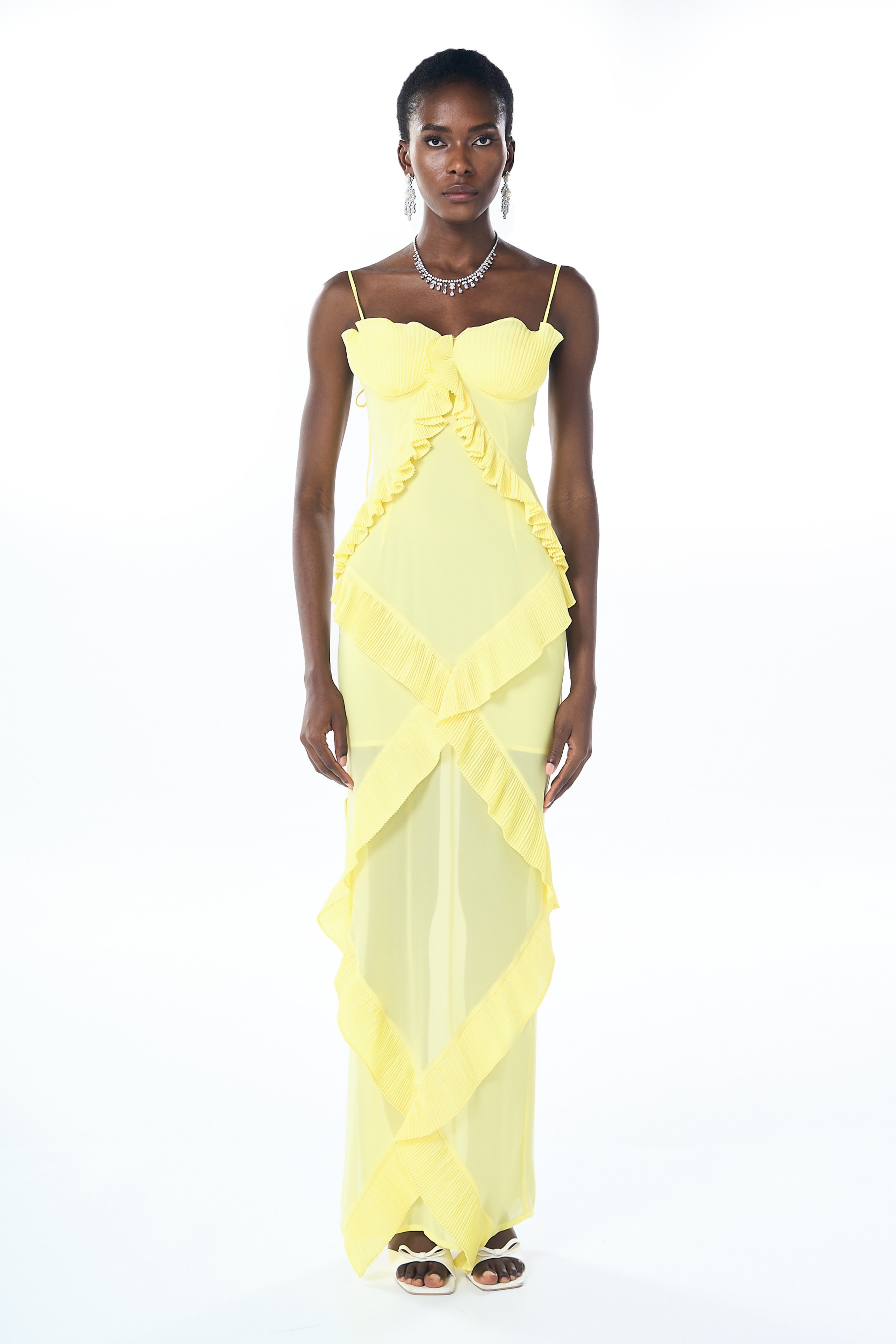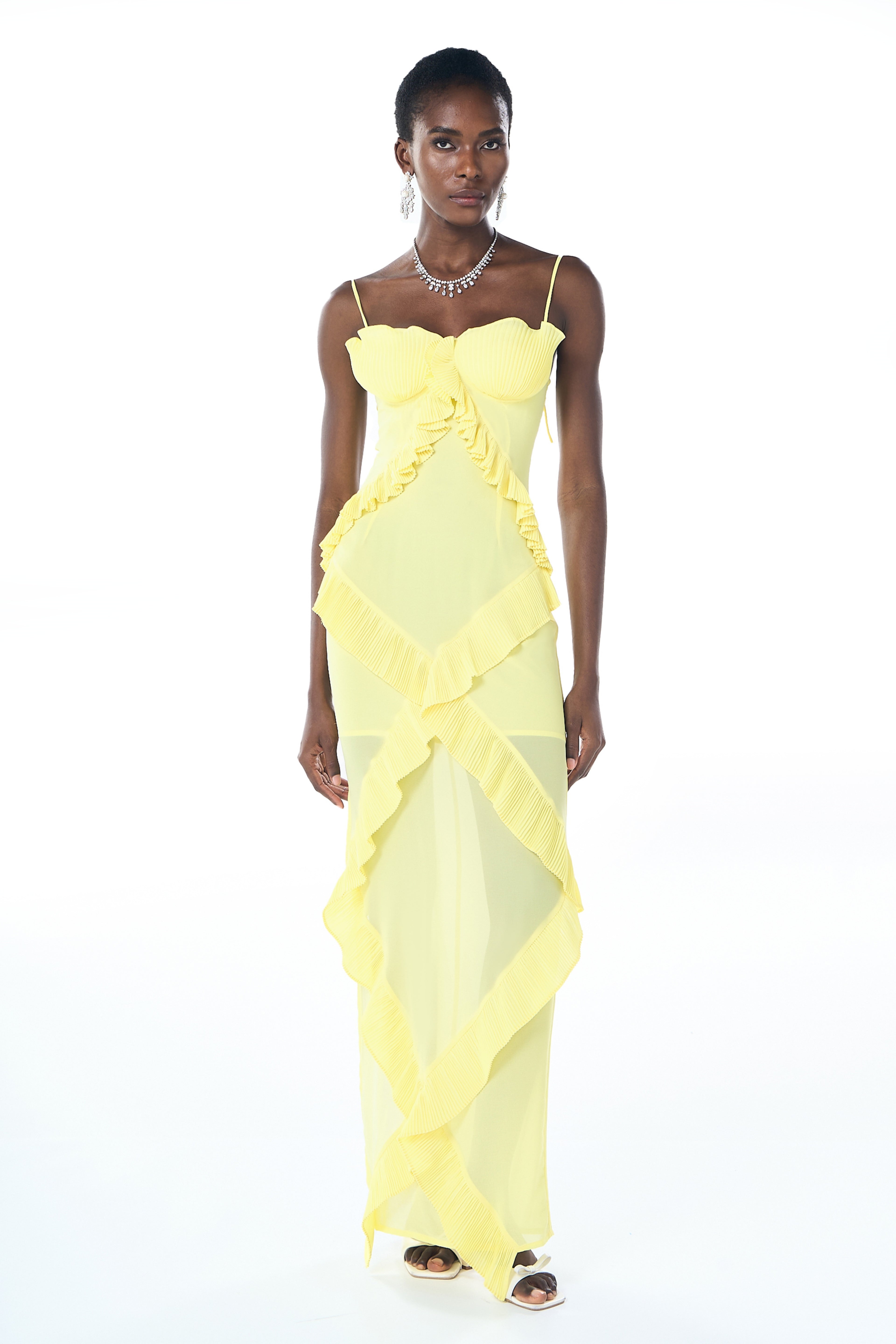 Tiffany Lemon Yellow Ruffled Pleated Maxi Dress