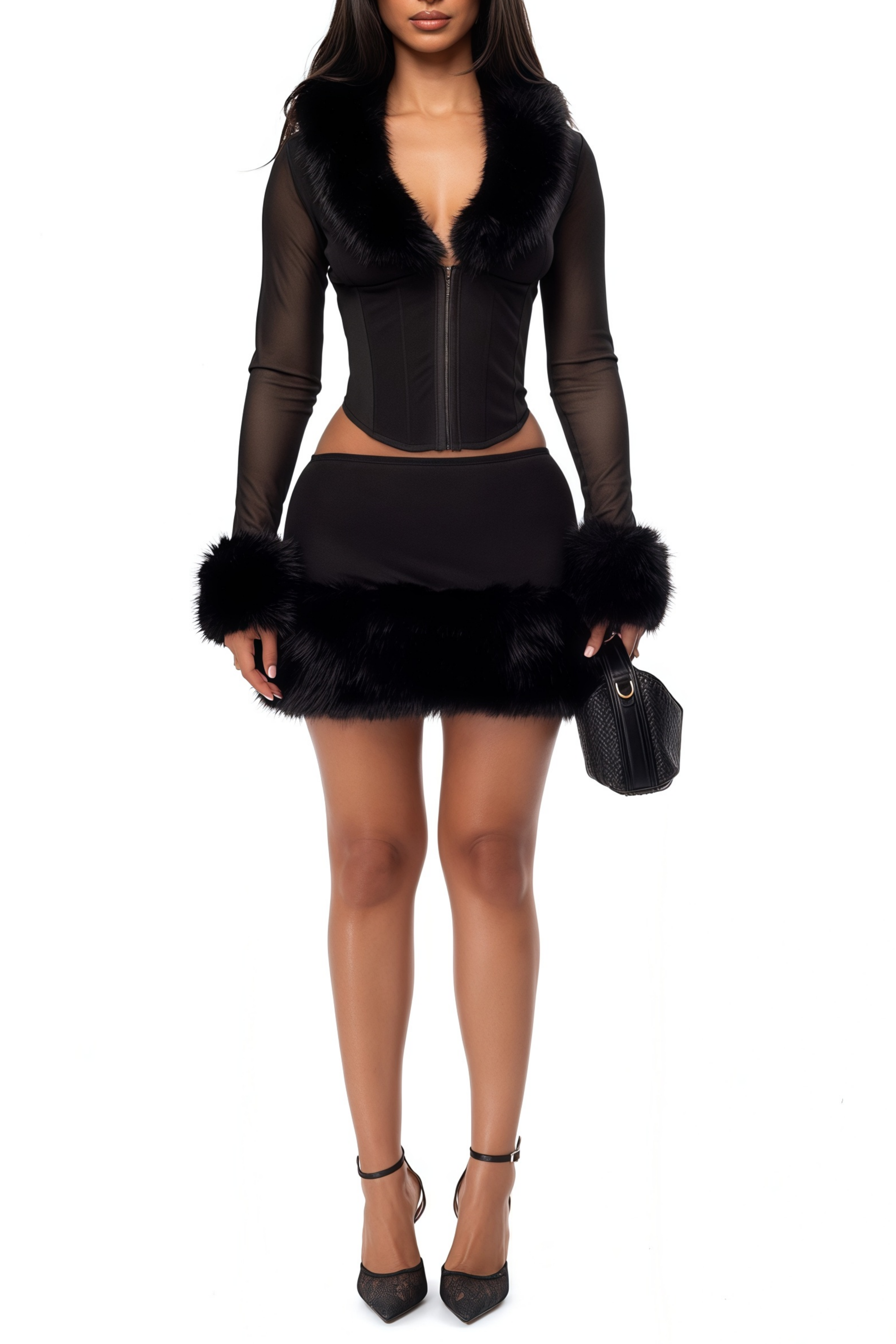 Candice Black Faux-Fur Trim Top & Skirt Set