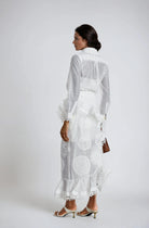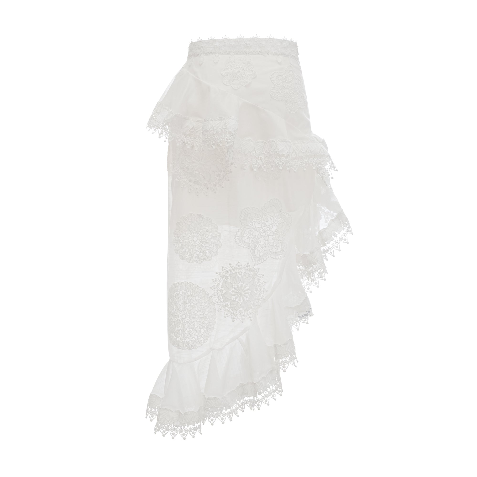 Below, the skirt flares into an asymmetric flounce hem that moves like gentle waves. Fully lined for comfort, it fastens with an invisible side zip for a seamless finish. Wear together for ethereal elegance, or style each piece solo for endless warm-weather possibilities.