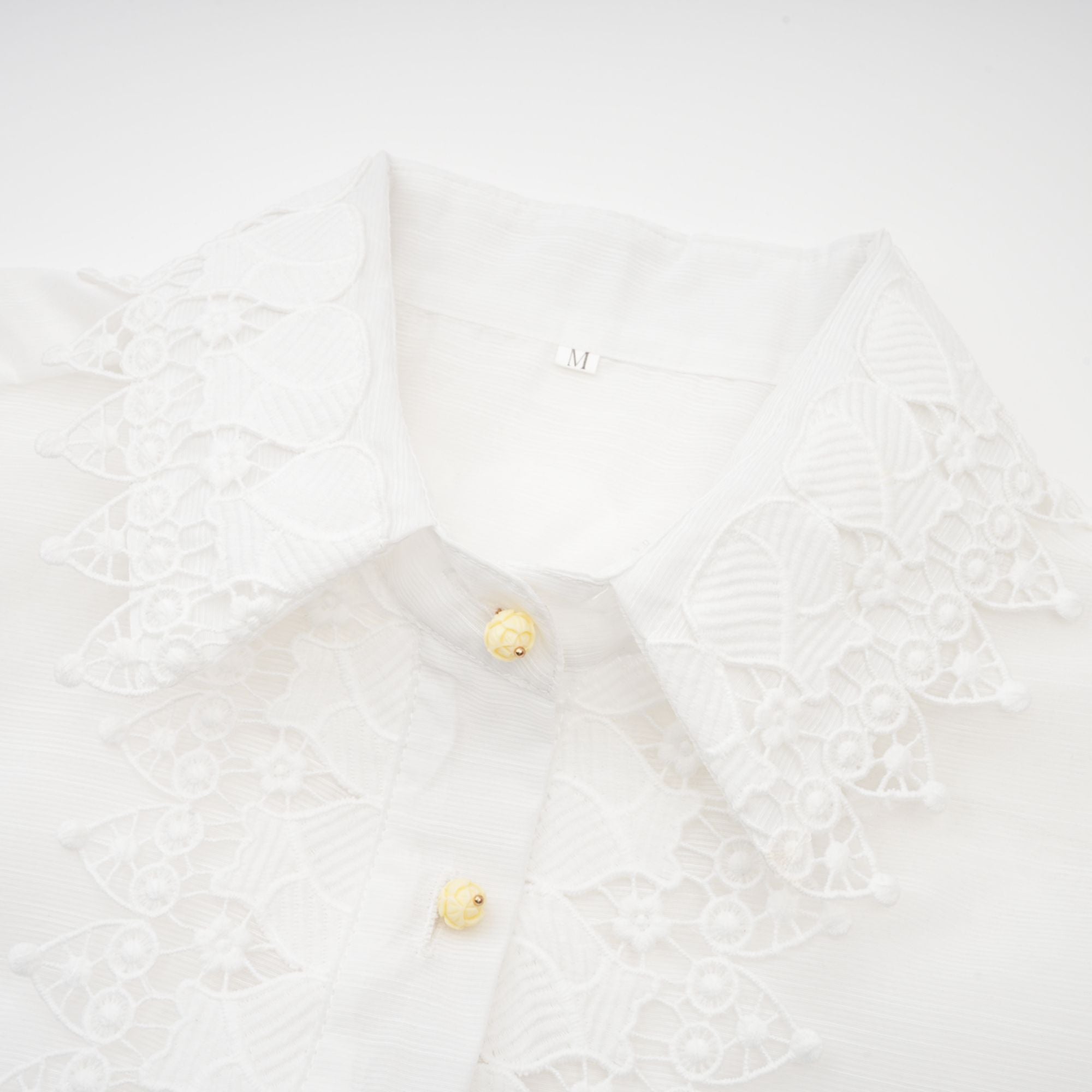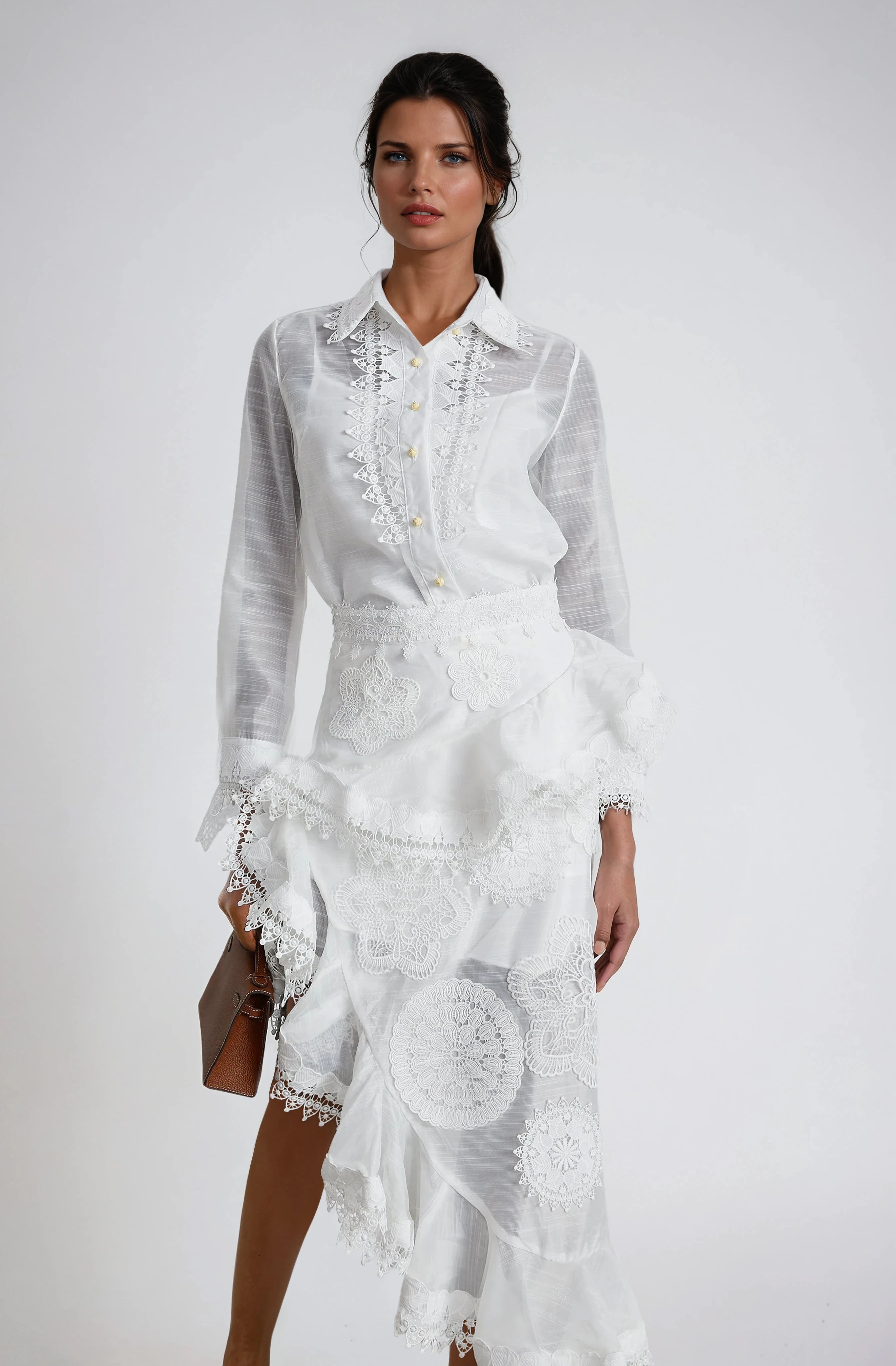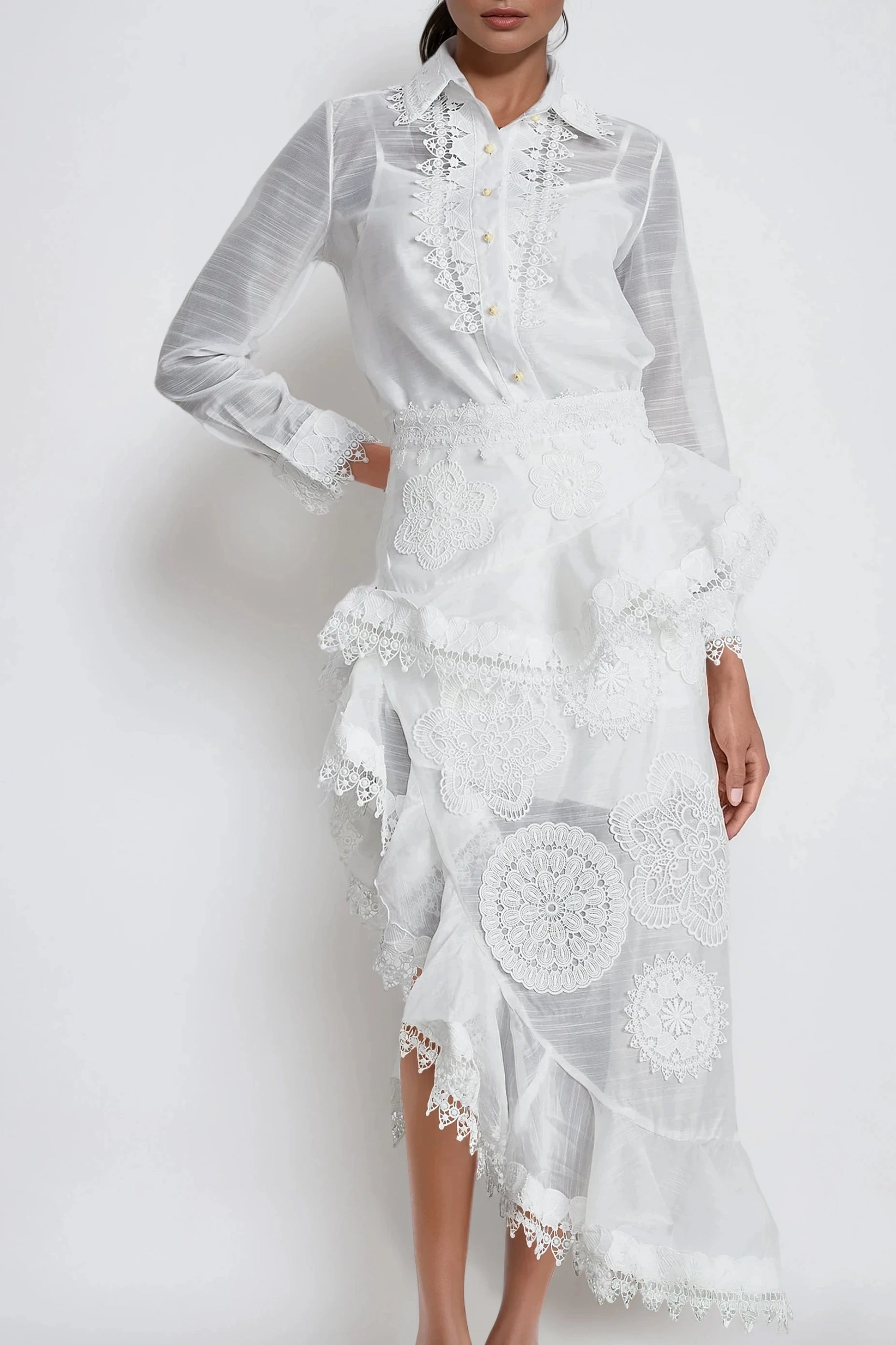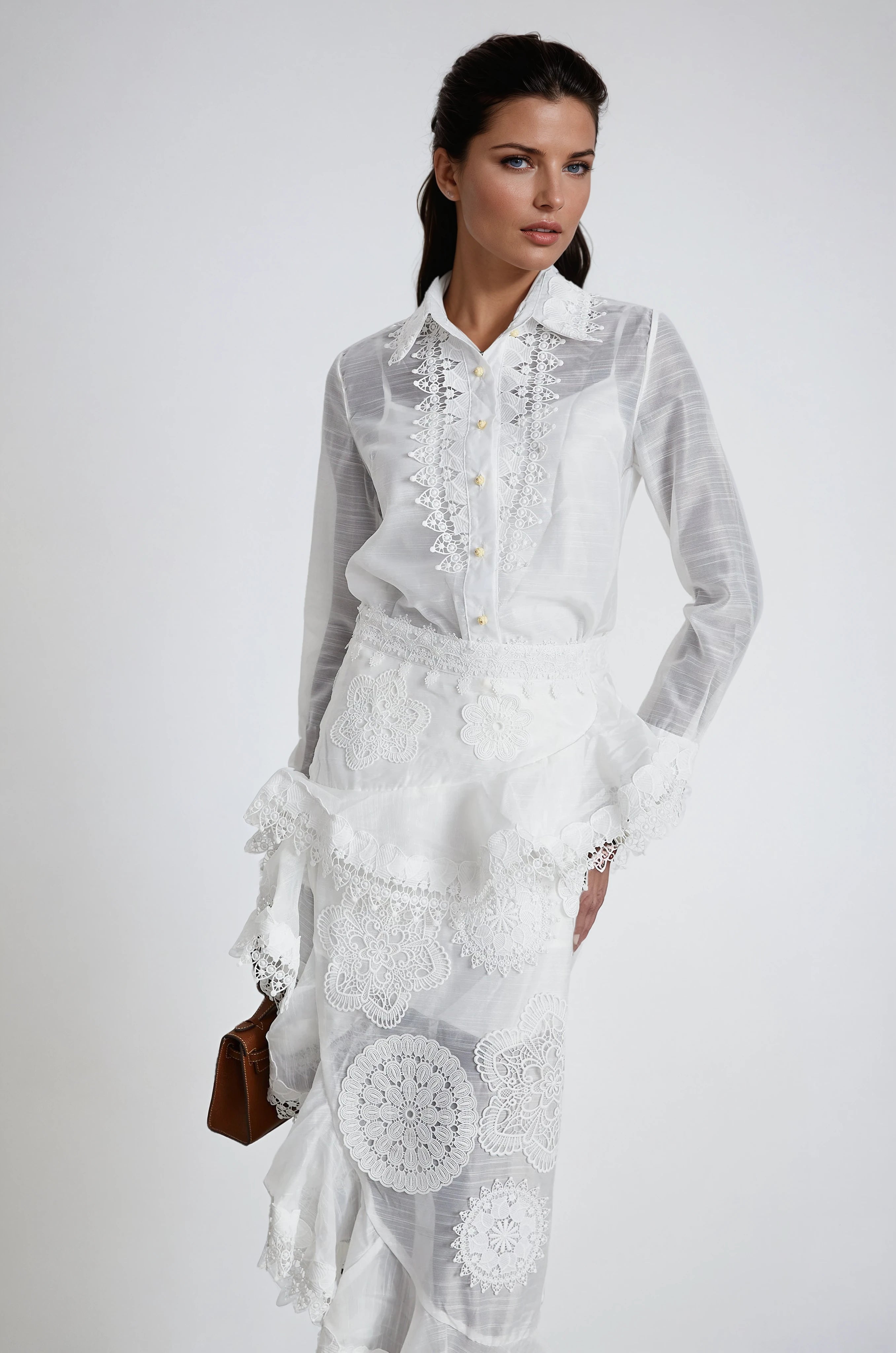 The semi-sheer blouse drapes with long, billowing sleeves framed by delicate lace trims. A coordinating internal slip dress ensures coverage, while polished front buttons keep the look refined.