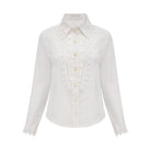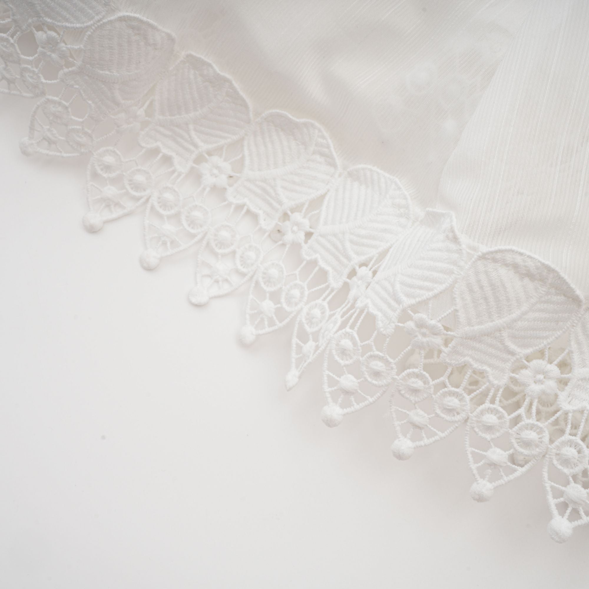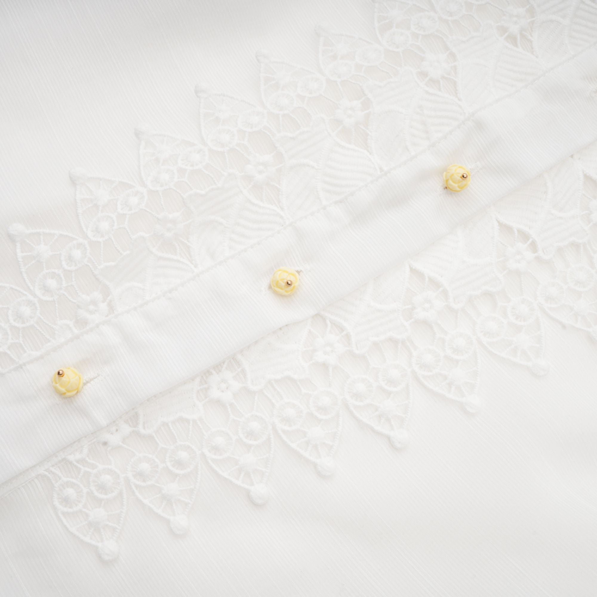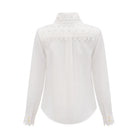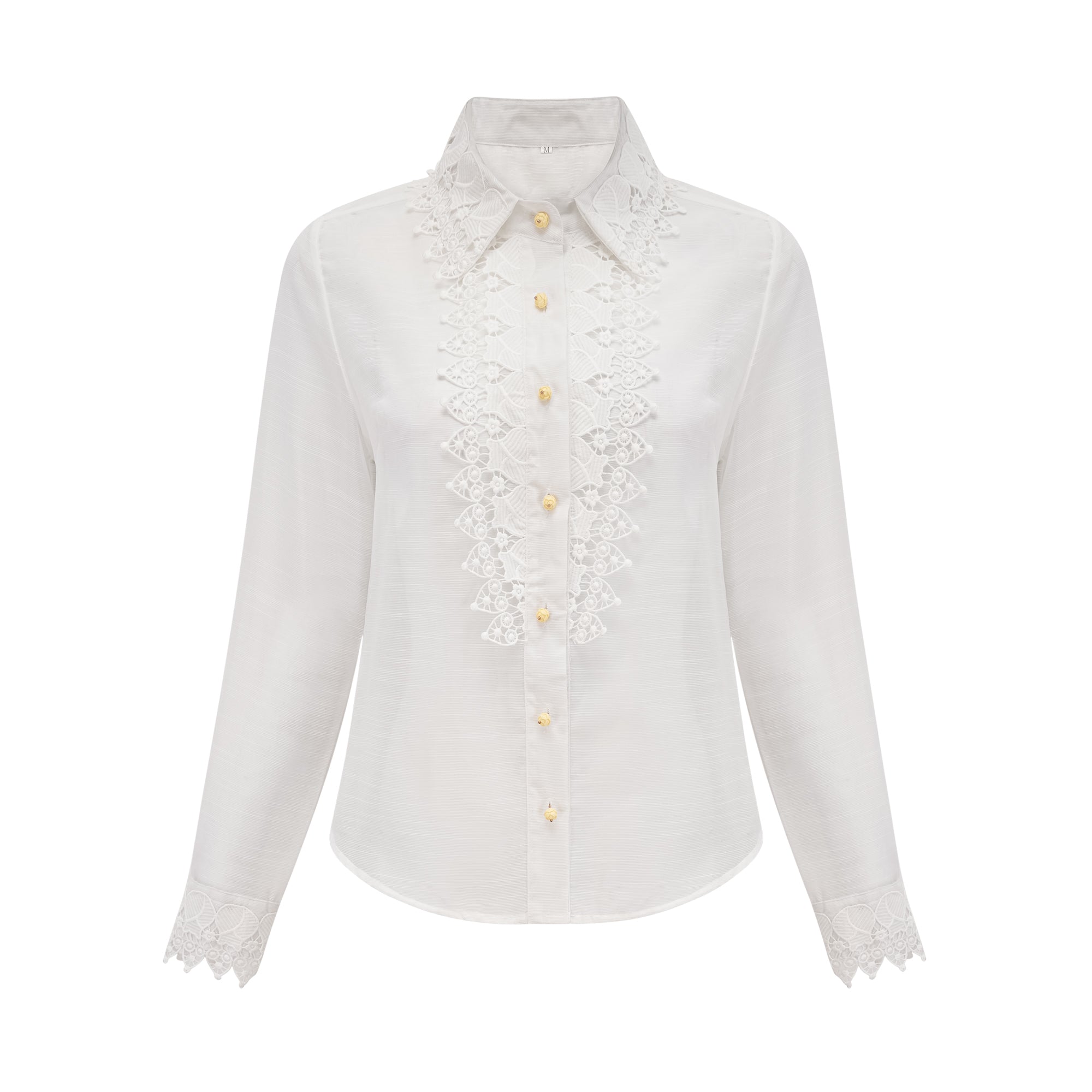 The semi-sheer blouse drapes with long, billowing sleeves framed by delicate lace trims. A coordinating internal slip dress ensures coverage, while polished front buttons keep the look refined.
