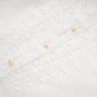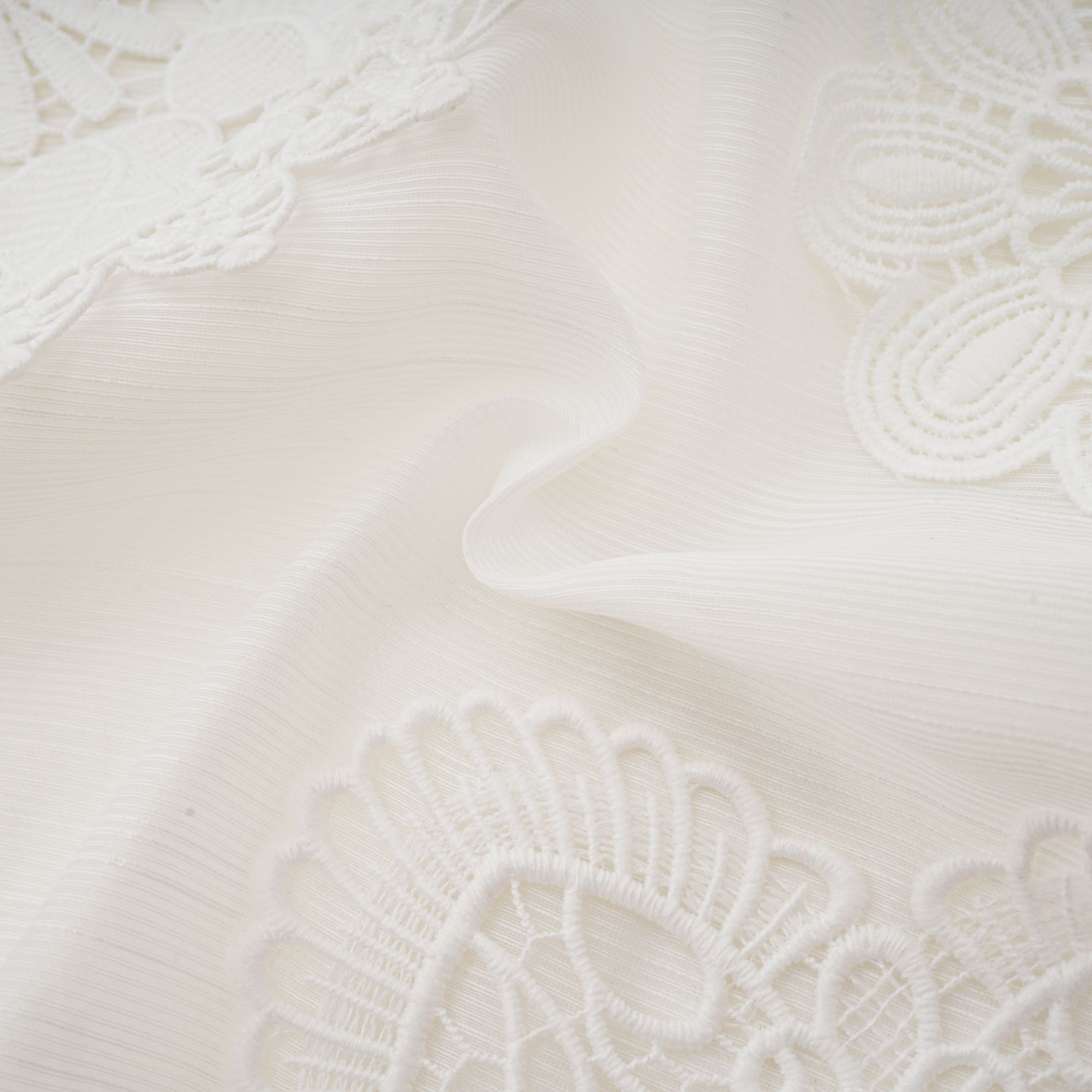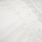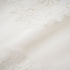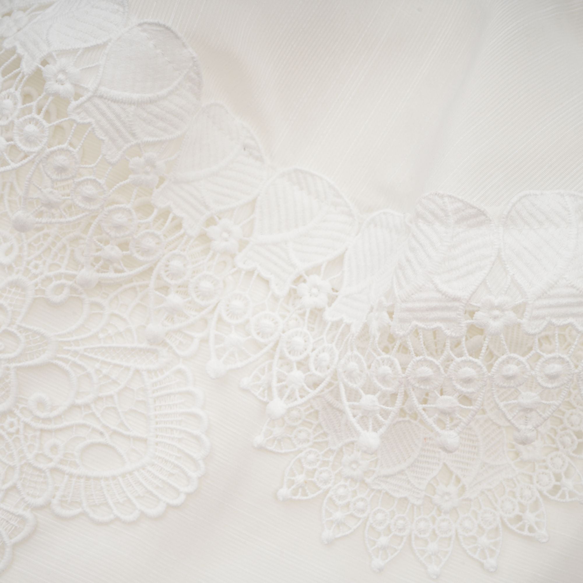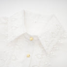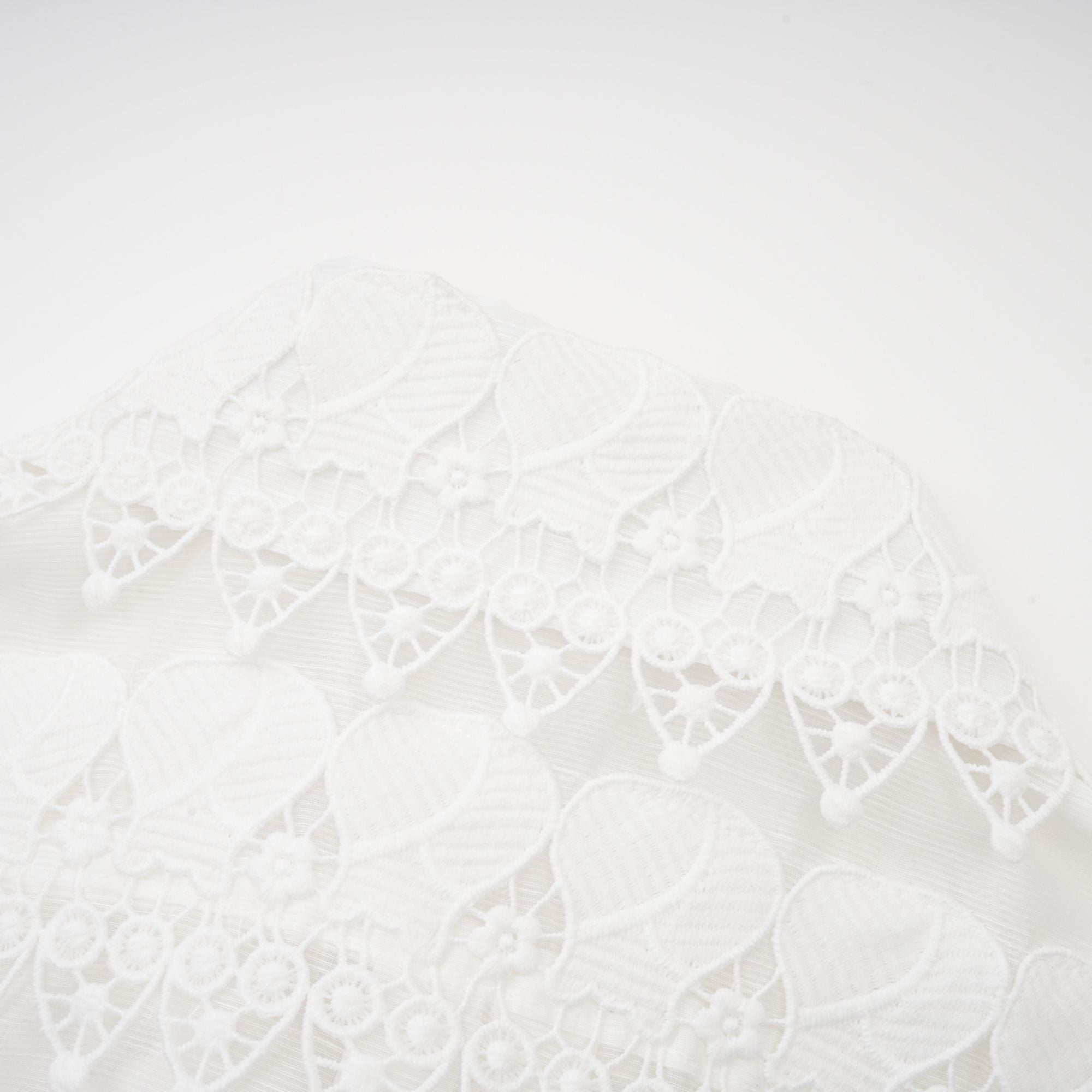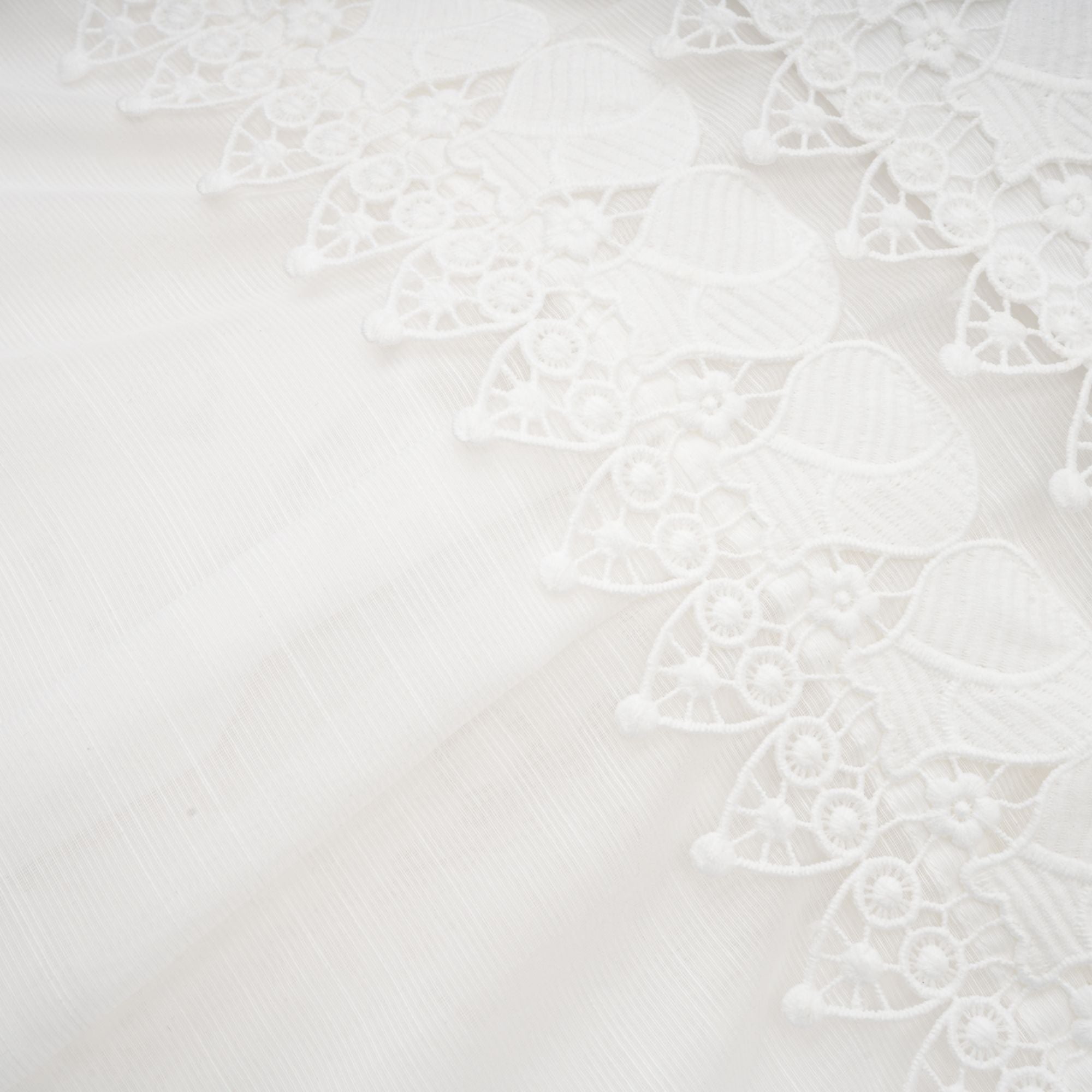 The semi-sheer blouse drapes with long, billowing sleeves framed by delicate lace trims. A coordinating internal slip dress ensures coverage, while polished front buttons keep the look refined.