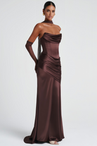 Introducing the Connie Brown Ruched Satin Maxi Dress, a must-have addition to your wardrobe. This sleeveless design features an elegant off-the-shoulder neckline with a structured boned corset-style bodice in luxurious satin finish that contours to a sculpted fitted waistline. The dress showcases delicate ruched and pleated detailing, flowing into a graceful maxi-length silhouette with an elegant train design, secured with discreet side zip fastening for a seamless fit. Elevate your style with this elegant and versatile dress.
